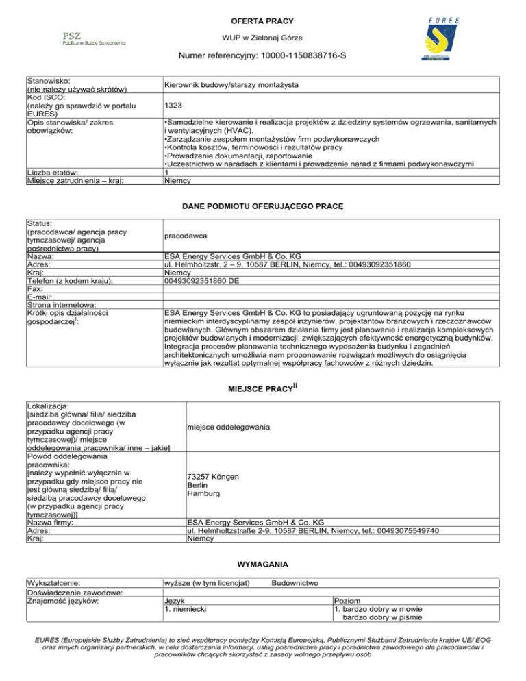 OFERTA PRACY WUP w Zielonej Górze Numer referencyjny: 10000-1150838716-S Stanowisko: (nie należy używać skrótów) Kod ISCO: (należy go sprawdzić w portalu EURES) Opis stanowiska/ zakres obowiązków: Liczba etatów: Miejsce zatrudnienia – kraj: Kierownik budowy/starszy montażysta 1323 •Samodzielne kierowanie i realizacja projektów z dziedziny systemów ogrzewania, sanitarnych i wentylacyjnych (HVAC). •Zarządzanie zespołem montażystów firm podwykonawczych •Kontrola kosztów, terminowości i rezultatów pracy •Prowadzenie dokumentacji, raportowanie •Uczestnictwo w naradach z klientami i prowadzenie narad z firmami podwykonawczymi 1 Niemcy DANE PODMIOTU OFERUJĄCEGO PRACĘ Status: (pracodawca/ agencja pracy tymczasowej/ agencja pośrednictwa pracy) Nazwa: Adres: Kraj: Telefon (z kodem kraju): Fax: E-mail: Strona internetowa: Krótki opis działalności gospodarczeji: pracodawca ESA Energy Services GmbH & Co. KG ul. Helmholtzstr. 2 – 9, 10587 BERLIN, Niemcy, tel.: 00493092351860 Niemcy 00493092351860 DE ESA Energy Services GmbH & Co. KG to posiadający ugruntowaną pozycję na rynku niemieckim interdyscyplinarny zespół inżynierów, projektantów branżowych i rzeczoznawców budowlanych. Głównym obszarem działania firmy jest planowanie i realizacja kompleksowych projektów budowlanych i modernizacji, zwiększających efektywność energetyczną budynków. Integracja procesów planowania technicznego wyposażenia budynku i zagadnień architektonicznych umożliwia nam proponowanie rozwiązań możliwych do osiągnięcia wyłącznie jak rezultat optymalnej współpracy fachowców z różnych dziedzin. MIEJSCE PRACYii Lokalizacja: [siedziba główna/ filia/ siedziba pracodawcy docelowego (w przypadku agencji pracy tymczasowej)/ miejsce oddelegowania pracownika/ inne – jakie] Powód oddelegowania pracownika: [należy wypełnić wyłącznie w przypadku gdy miejsce pracy nie jest główną siedzibą/ filią/ siedzibą pracodawcy docelowego (w przypadku agencji pracy tymczasowej)] Nazwa firmy: Adres: Kraj: miejsce oddelegowania 73257 Köngen Berlin Hamburg ESA Energy Services GmbH & Co. KG ul. Helmholtzstraße 2-9, 10587 BERLIN, Niemcy, tel.: 00493075549740 Niemcy WYMAGANIA Wykształcenie: Doświadczenie zawodowe: Znajomość języków: wyższe (w tym licencjat) Język 1. niemiecki Budownictwo Poziom 1. bardzo dobry w mowie bardzo dobry w piśmie EURES (Europejskie Służby Zatrudnienia) to sieć współpracy pomiędzy Komisją Europejską, Publicznymi Służbami Zatrudnienia krajów UE/ EOG oraz innych organizacji partnerskich, w celu dostarczania informacji, usług pośrednictwa pracy i poradnictwa zawodowego dla pracodawców i pracowników chcących skorzystać z zasady wolnego przepływu osób Uprawnienia/ dyplomy/ dokumenty (np. prawo jazdy): Inne istotne wymagania: Wykształcenie kierunkowe jako technik, mistrz lub inżynier •Doświadczenie zawodowe w pracy jako starszy montażysta lub kierownik budowy •Dobra znajomość systemów ogrzewania, sanitarnych i wentylacyjnych (HVAC) będzie dodatkowym atutem •Zorientowany na klienta sposób pracy •Gotowość do realizacji projektów wyjazdowych •Bardzo dobra znajomość jęz. niemieckiego Staż ogółem: 5.0 WYNAGRODZENIE I WARUNKI ZATRUDNIENIA Wysokość pensji brutto: Wysokość pensji netto: Waluta, w jakiej wypłacana jest pensja: Rodzaj stawki wynagrodzenia: (godzinowa/ tygodniowa/ miesięczna/ roczna/ inna) Premie: Dodatkowe świadczenia (zakwaterowanie, wyżywienie, koszty związane ze zmianą miejsca zamieszkania, koszty podróży itp.): 12,50 Euro Czasowy ze stawką godzinową brak danych Oferujemy: •Atrakcyjne i stabilne wynagrodzenie •Umowę o pracę na czas nieokreślony •Dodatkowe ubezpieczenie emerytalne w zakładzie pracy •Wsparcie rozwoju zawodowego •Regularny udział w szkoleniach podnoszących kwalifikacje •Udział w zróżnicowanych i ciekawych projektach w dynamicznym otoczeniu ESA Energy Services GmbH & Co. KG Nazwa firmy, z którą zostanie podpisana umowa: Rodzaj umowy: (umowa o pracę, umowa zlecenia, wolontariat, praktyka zawodowa/ staż, umowa o pracę praca zdalna, agencja pracy tymczasowej, inne): Wymiar czasu pracy pełny etat (praca na pełen etat/ część etatu): Czas trwania umowy: nieokreślony (nieokreślony/ określony) Liczba godzin tygodniowo: Zmiany i praca w dni wolne: Data rozpoczęcia: Inne informacje: Data wygaśnięcia umowy (w przypadku umowy na czas określony): 40,00 Zakwaterowanie umożliwia i opłaca pracodawca. Zakwaterowanie najczęściej na kwaterze, w pokoju 1-osobowym. Istnieje możliwość użytkowania samochodu służbowego. 2017-02-20 Istnieją 2 możliwości pracy: 1.10 dni pracy na budowie i 4 kolejne dni wolne 2.5 dni pracy na budowie i wolny weekend SPOSÓB SKŁADANIA WNIOSKU Wymagane dokumenty (list motywacyjny, CV itp.): Jeśli są Państwo zainteresowani pracą w naszym zespole, cieszymy się na Państwa dokumenty aplikacyjne, które proszę przesyłać na adres: [email protected] lub ESA Energy Services GmH & Co.KG Personalabteilung Helmholtzstraße 2-9 10587 Berlin Tel:030/7554974-70 www.esa-energy.de Język, w którym muszą być sporządzone przedkładane dokumenty: Do kogo należy wysłać dokumenty: (do pracodawcy/ doradcy EURES) Gdzie należy wysłać dokumenty: (adres, adres e-mail, nr faksu z kodem kraju itp.) niemiecki do pracodawcy Jeśli są Państwo zainteresowani pracą w naszym zespole, cieszymy się na Państwa dokumenty aplikacyjne, które proszę przesyłać na adres: [email protected] lub EURES (Europejskie Służby Zatrudnienia) to sieć współpracy pomiędzy Komisją Europejską, Publicznymi Służbami Zatrudnienia krajów UE/ EOG oraz innych organizacji partnerskich, w celu dostarczania informacji, usług pośrednictwa pracy i poradnictwa zawodowego dla pracodawców i pracowników chcących skorzystać z zasady wolnego przepływu osób Dane teleadresowe doradcy EURES lub przedstawiciela pracodawcy: (nazwisko
