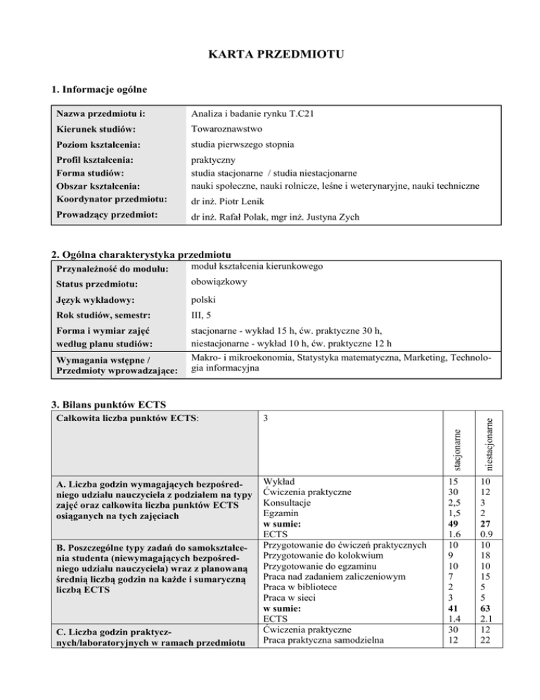 KARTA PRZEDMIOTU 1. Informacje ogólne Nazwa przedmiotu i: Analiza i badanie rynku T.C21 Kierunek studiów: Towaroznawstwo Poziom kształcenia: studia pierwszego stopnia Profil kształcenia: Forma studiów: Obszar kształcenia: Koordynator przedmiotu: praktyczny studia stacjonarne / studia niestacjonarne nauki społeczne, nauki rolnicze, leśne i weterynaryjne, nauki techniczne Prowadzący przedmiot: dr inż. Rafał Polak, mgr inż. Justyna Zych dr inż. Piotr Lenik 2. Ogólna charakterystyka przedmiotu Przynależność do modułu: moduł kształcenia kierunkowego Status przedmiotu: obowiązkowy Język wykładowy: polski Rok studiów, semestr: III, 5 Forma i wymiar zajęć według planu studiów: stacjonarne - wykład 15 h, ćw. praktyczne 30 h, niestacjonarne - wykład 10 h, ćw. praktyczne 12 h Wymagania wstępne / Przedmioty wprowadzające: Makro- i mikroekonomia, Statystyka matematyczna, Marketing, Technologia informacyjna 3 A. Liczba godzin wymagających bezpośredniego udziału nauczyciela z podziałem na typy zajęć oraz całkowita liczba punktów ECTS osiąganych na tych zajęciach Wykład Ćwiczenia praktyczne Konsultacje Egzamin w sumie: ECTS Przygotowanie do ćwiczeń praktycznych Przygotowanie do kolokwium Przygotowanie do egzaminu Praca nad zadaniem zaliczeniowym Praca w bibliotece Praca w sieci w sumie: ECTS Ćwiczenia praktyczne Praca praktyczna samodzielna B. Poszczególne typy zadań do samokształcenia studenta (niewymagających bezpośredniego udziału nauczyciela) wraz z planowaną średnią liczbą godzin na każde i sumaryczną liczbą ECTS C. Liczba godzin praktycznych/laboratoryjnych w ramach przedmiotu niestacjonarne Całkowita liczba punktów ECTS: stacjonarne 3. Bilans punktów ECTS 15 30 2,5 1,5 49 1.6 10 9 10 7 2 3 41 1.4 30 12 10 12 3 2 27 0.9 10 18 10 15 5 5 63 2.1 12 22 Praca nad zadaniem zaliczeniowym w sumie: ECTS oraz związana z tym liczba punktów ECTS 7 49 1.6 15 49 1.6 4. Opis przedmiotu Cel przedmiotu: Celem przedmiotu jest zapoznanie studentów z mechanizmem rynkowym, rodzajami i metodami badań rynkowych, źródłami pozyskiwania informacji, danych rynkowych oraz metodami analizy rynku. W sposób praktyczny wykształcenie u studentów umiejętności analizy danych rynkowych z wykorzystaniem różnych źródeł danych i metod ich prezentowania. Metody dydaktyczne: wykład multimedialny, metoda przypadków, dyskusja, ćwiczenia praktyczne z wykorzystaniem szablonu kalkulacyjnego Excel i Internetu Treści kształcenia: Wykłady: 1. Źródła informacji i ich klasyfikacja. System informacji rynkowej. Internet jako źródło informacji. 2. Rynek jako przedmiot badań, funkcjonowanie mechanizmu rynkowego. 3. Rynki zorganizowane i niezorganizowane. 4. Instrumenty i regulacje prawno-ekonomicznego oddziaływania na rynki branżowe. 5. Wybrane rodzaje i metody badań rynkowych. 6. Omówienie przebiegu procesu badawczego rynku. Metody i narzędzia pozyskiwania danych i ich przetwarzania. 7. Analiza wybranego rynku – studium przypadku. Ćwiczenia praktyczne: 1. Badanie i analiza rynku – cechy, miejsce i znaczenie badań i analizy rynku dla procesu podejmowania decyzji - dyskusja. 2. Informacja jako źródło danych o rynku – identyfikacja, klasyfikacja, redukcja danych - zadania. 3. Obliczanie i analiza wybranych mierników statystycznych wykorzystywanych w analizie rynku. 4. Badanie pojemności i chłonności rynku. 5. Analiza zjawisk rynkowych w czasie z wykorzystaniem technik komputerowych. 6. Analiza zjawisk rynkowych o charakterze sezonowym. 7. Analiza związków przyczynowo- skutkowych występujących na rynku. 8. Analiza i badanie rynku na podstawie surowych danych rynkowych. 9. Analiza i badanie rynku na podstawie danych pochodzących ze źródeł pierwotnych i wtórnych. 5. Efekty kształcenia i sposoby weryfikacji Efekty kształcenia Efekt przedmiotu T.C21_K_W01 Student, który zaliczył przedmiot (spełnił minimum wymagań) Wiedza: Definiuje rynek i jego rodzaje, wskazuje zależności między różnymi mechanizmami i instytucjami oddziaływującymi na rynek T.C21_K_W02 Rozpoznaje i charakteryzuje podstawowe metody badań rynku wykorzystywane w procesie podejmowania decyzji rynkowych T.C21_K_W03 Wymienia i opisuje źródła pozyskiwania informacji o danych rynkowych niezbędnych w prawidłowej analizie i badaniu rynku Umiejętności Efekt kierunkowy K_W01 K_W04 K_W06 K_W04 K_W07 K_W12 K_W14 K_W07 K_W12 T.C21_K_U01 Znajduje z różnych źródeł informacje, porządkuje i dobiera metody i sposoby ich analizy T.C21_K_U02 Dobiera, oblicza i interpretuje podstawowe mierniki statystyczne stosowane w analizie i badaniu rynku związanego z obrotem towarowym T.C21_K_U03 Analizuje i opisuje zjawiska i zależności rynkowe, opracowuje je w postaci graficznej i multimedialnej T.C21_K_K01 T.C21_K_K01 Kompetencje społeczne Współpracuje w zespole, pełni w niej różne role Wykazuje odpowiedzialność za powierzone mu zadania Sposoby weryfikacji efektów kształcenia: Lp. Efekt przedSposób weryfikacji miotu 1. Egzamin pisemny ograniczony czasoT.C21_K_W01 wo 2. Egzamin pisemny ograniczony czasoT.C21_K_W02 wo 3. Egzamin pisemny ograniczony czasoT.C21_K_W03 wo T.C21_K_U01 Ćwiczenia praktyczne z wykorzysta4. niem komputera T.C21_K_U02 Kolokwium z wykorzystaniem szablo5. nu kalkulacyjnego Excel 6. T.C21_K_U03 Ćwiczenia praktyczne- praca w grupie 7. T.C21_K_K01 Obserwacja 8. T. C21_K_K02 Grupowa praca pisemna Ocena formująca ocena cząstkowa z egzaminu ocena cząstkowa z egzaminu ocena cząstkowa z egzaminu ocena umiejętności wykonania zadania ocena umiejętności wykonania zadania ocena umiejętności wykonania zadania obliczeniowoanalitycznego aktywność, współpraca podczas rozwiązywania ćwiczeń w grupie terminowość oddania pracy K_U06 K_U10 K_U02 K_U01 K_U02 K_U10 K_U11 K_U13 K_U01 K_U10 K_U11 K_K05 K_K05 Ocena końcowa średnia ocen z egzaminu ocena końcowa umiejętności ocena końcowa umiejętności ocena z oddanej pracy pisemnej ocena z