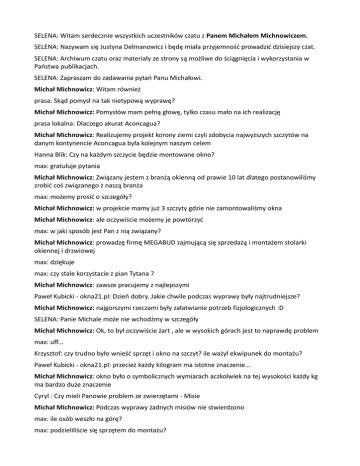 SELENA: Witam serdecznie wszystkich uczestników czatu z Panem Michałem Michnowiczem. SELENA: Nazywam się Justyna Delmanowicz i będę miała przyjemność prowadzić dzisiejszy czat. SELENA: Archiwum czatu oraz materiały ze strony są możliwe do ściągnięcia i wykorzystania w Państwa publikacjach. SELENA: Zapraszam do zadawania pytań Panu Michałowi. Michał Michnowicz: Witam również prasa: Skąd pomysł na tak nietypową wyprawę? Michał Michnowicz: Pomysłów mam pełną głowę, tylko czasu mało na ich realizację prasa lokalna: Dlaczego akurat Aconcagua? Michał Michnowicz: Realizujemy projekt korony ziemi czyli zdobycia najwyższych szczytów na danym kontynencie Aconcagua była kolejnym naszym celem Hanna Blik: Czy na każdym szczycie będzie montowane okno? max: gratuluje pytania Michał Michnowicz: Związany jestem z branżą okienną od prawie 10 lat dlatego postanowiliśmy zrobić coś związanego z naszą branża max: możemy prosić o szczegóły? Michał Michnowicz: w projekcie mamy już 3 szczyty gdzie nie zamontowaliśmy okna Michał Michnowicz: ale oczywiście możemy je powtórzyć max: w jaki sposób jest Pan z nią związany? Michał Michnowicz: prowadzę firmę MEGABUD zajmującą się sprzedażą i montażem stolarki okiennej i drzwiowej max: dziękuje max: czy stale korzystacie z pian Tytana ? Michał Michnowicz: zawsze pracujemy z najlepszymi Paweł Kubicki - okna21.pl: Dzień dobry. Jakie chwile podczas wyprawy były najtrudniejsze? Michał Michnowicz: najgorszymi rzeczami były załatwianie potrzeb fizjologicznych :D SELENA: Panie Michale może nie wchodźmy w szczegóły Michał Michnowicz: Ok, to był oczywiście żart , ale w wysokich górach jest to naprawdę problem max: uff... Krzysztof: czy trudno było wnieść sprzęt i okno na szczyt? ile ważył ekwipunek do montażu? Paweł Kubicki - okna21.pl: przecież każdy kilogram ma istotne znaczenie... Michał Michnowicz: okno było o symbolicznych wymiarach aczkolwiek na tej wysokości każdy kg ma bardzo duże znaczenie Cyryl : Czy mieli Panowie problem ze zwierzętami - Misie Michał Michnowicz: Podczas wyprawy żadnych misiów nie stwierdzono max: ile osób weszło na górę? max: podzieliliście się sprzętem do montażu? Michał Michnowicz: z 14 osób rozpoczynających wyprawę, szczyt zdobyło 7 osób Michał Michnowicz: w montażu uczestniczyliśmy we dwójkę, okno i pianę podzieliliśmy między nami lavidaloca: strach spytać o pozostałą siódemkę... Tomek: chciałbym się dowiedzieć ile trwało wejście na szczyt? Michał Michnowicz: akcja szczytowa trwała ok. 8 godzin Agnieszka: ile trwał montaż w tak ekstremalnych warunkach? Michał Michnowicz: okno montowaliśmy ok. 5 minut + czas na zdjęcia i film Michał Michnowicz: dłużej trwał demontaż i czyszczenie skały Krzysztof: czy uczestnicy wyprawy to byli sami Polacy? Krzysztof: jakie formalności trzeba załatwić żeby wejść na górę? czy każdy może "wstać od biurka" i stwierdzić - jadę na aconcague? Michał Michnowicz: trzeba uzyskać pozwolenie "permit" i wnieść opłatę, natomiast od biurka trzeba wstać zdecydowanie wcześniej i nieźle się przygotować kondycyjnie\ Cyryl : Czy na szczyt uczestnicy wyprawy wchodzą jednocześnie Michał Michnowicz: jednocześnie rozpoczynamy, potem grupa się rozciąga Michał Michnowicz: różnica pomiędzy pierwszym członkiem a ostatnim wynosi nawet kilka godzin tomek: W jaki sposób dostarczyliście piany na szczyt Michał Michnowicz: piany były dostarczone na szczyt w plecaku w pokrowcach termicznych elektra: Czy był problem na lotnisku z pistoletem do pian Michał Michnowicz: obawialiśmy się tego ale na strachu się skończyło max: może Pan cos napić o tych pokrowcach? Michał Michnowicz: oto pokrowce: http://www.ebuilder.pl/index.php?act=article&sub=view&id=6459 Cyryl : Czy w wyprawie uczestniczyły kobiety ? Michał Michnowicz: Jeśli chodzi o kobiety, to był jeden rodzynek krzysiek: jedna rodzynka:-) Sebastian Rucinski: Jak podejmowana jest decyzja kto z uczestników wyprawy będzie w zespole atakującym szczyt? Michał Michnowicz: na szczyt chce wejść każdy niestety nie każdy ma tyle sił i zdrowie mu na to pozwoli aleksandra: ile się przygotowywaliście do wyprawy i na czym polegały przygotowania Michał Michnowicz: przygotowuje się cały czas, w zasadzie codziennie coś robię Michał Michnowicz: basen, bieganie, itp. jestok: Witam. Mam pytanie: co jedli Panowie w drodze na szczyt? czy było to jedzenie sztucznie podgrzewane, czy chłodne? Jakie napoje? czy to jakieś wymyślne mieszanki, czy ogólnodostępne napoje izotoniczne? Czy i jak podgrzewane? Agnieszka Czarna: czy okno po zamontowaniu zostało zdemontowane? krzysiek: czy oczyściliscie miejsce po montażu? to chyba jakiś park narodowy ta góra? Michał Michnowicz: Tak oczywiście okno po montażu zostało zdemontowane tomek: w tym linku jest błąd tomek: czy można jakąś poprawiona wersje? Michał Michnowicz: jeśli jest to możliwe wpisz Tomku, w google "tytan aconcagua" i przeglądaj GRAFIKE krzysiek: a jak z tym jedzeniem? w takiej temperaturze to chyba wszystko zamienia się w lód? Michał Michnowicz: jeśli chodzi o jedzenie, jeść generalnie się nie chce, rewelacyjne są kisiele oraz żywność lifizjonowana krzysiek: jaka? max: liofilizowana krzysiek: tzn? Michał Michnowicz: jest to żywność specjalnie przygotowana którą zalewamy wrzątkiem aleksandra: a jak jest z chorobą wysokościową- czy baliście się tego. Czy podczas wyprawy pojawiła się u któregoś uczestnika? Michał Michnowicz: chorobę wysokościową ma każdy lecz w różnym stopniu się objawia, jednego z naszych kolegów ratował śmigłowiec ze względu na chorobę wysokościową aleksandra: a na jakiej wysokości się objawiła Michał Michnowicz: bardzo nisko w bazie na 4300 m n.p.m. max: od czego to zależy? trening pomaga zapobiec tej chorobie? Michał Michnowicz: chorobie nic nie zapobiega, tren