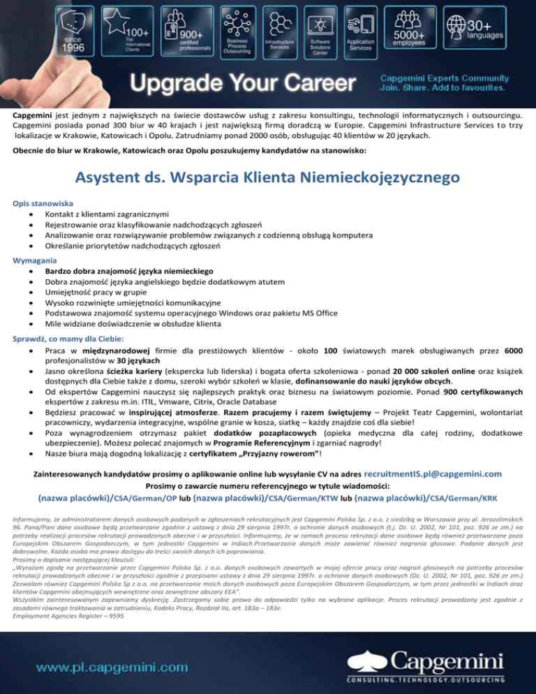 Capgemini jest jednym z największych na świecie dostawców usług z zakresu konsultingu, technologii informatycznych i outsourcingu. Capgemini posiada ponad 300 biur w 40 krajach i jest największą firmą doradczą w Europie. Capgemini Infrastructure Services to trzy lokalizacje w Krakowie, Katowicach i Opolu. Zatrudniamy ponad 2000 osób, obsługując 40 klientów w 20 językach. Obecnie do biur w Krakowie, Katowicach oraz Opolu poszukujemy kandydatów na stanowisko: Asystent ds. Wsparcia Klienta Niemieckojęzycznego Opis stanowiska Kontakt z klientami zagranicznymi Rejestrowanie oraz klasyfikowanie nadchodzących zgłoszeń Analizowanie oraz rozwiązywanie problemów związanych z codzienną obsługą komputera Określanie priorytetów nadchodzących zgłoszeń Wymagania Bardzo dobra znajomość języka niemieckiego Dobra znajomość języka angielskiego będzie dodatkowym atutem Umiejętność pracy w grupie Wysoko rozwinięte umiejętności komunikacyjne Podstawowa znajomość systemu operacyjnego Windows oraz pakietu MS Office Mile widziane doświadczenie w obsłudze klienta Sprawdź, co mamy dla Ciebie: Praca w międzynarodowej firmie dla prestiżowych klientów - około 100 światowych marek obsługiwanych przez 6000 profesjonalistów w 30 językach Jasno określona ścieżka kariery (ekspercka lub liderska) i bogata oferta szkoleniowa - ponad 20 000 szkoleń online oraz książek dostępnych dla Ciebie także z domu, szeroki wybór szkoleń w klasie, dofinansowanie do nauki języków obcych. Od ekspertów Capgemini nauczysz się najlepszych praktyk oraz biznesu na światowym poziomie. Ponad 900 certyfikowanych ekspertów z zakresu m.in. ITIL, Vmware, Citrix, Oracle Database Będziesz pracować w inspirującej atmosferze. Razem pracujemy i razem świętujemy – Projekt Teatr Capgemini, wolontariat pracowniczy, wydarzenia integracyjne, wspólne granie w kosza, siatkę – każdy znajdzie coś dla siebie! Poza wynagrodzeniem otrzymasz pakiet dodatków pozapłacowych (opieka medyczna dla całej rodziny, dodatkowe ubezpieczenie). Możesz polecać znajomych w Programie Referencyjnym i zgarniać nagrody! Nasze biura mają dogodną lokalizację z certyfikatem „Przyjazny rowerom”! Zainteresowanych kandydatów prosimy o aplikowanie online lub wysyłanie CV na adres [email protected] Prosimy o zawarcie numeru referencyjnego w tytule wiadomości: (nazwa placówki)/CSA/German/OP lub (nazwa placówki)/CSA/German/KTW lub (nazwa placówki)/CSA/German/KRK Informujemy, że administratorem danych osobowych podanych w zgłoszeniach rekrutacyjnych jest Capgemini Polska Sp. z o.o. z siedzibą w Warszawie przy al. Jerozolimskich 96. Pana/Pani dane osobowe będą przetwarzane zgodnie z ustawą z dnia 29 sierpnia 1997r. o ochronie danych osobowych (t.j. Dz. U. 2002, Nr 101, poz. 926 ze zm.) na potrzeby realizacji procesów rekrutacji prowadzonych obecnie i w przyszłości. Informujemy, że w ramach procesu rekrutacji dane osobowe będą również przetwarzane poza Europejskim Obszarem Gospodarczym, w tym jednostki Capgemini w Indiach.Przetwarzanie danych może zawierać również nagrania głosowe. Podanie danych jest dobrowolne. Każda osoba ma prawo dostępu do treści swoich danych ich poprawiania. Prosimy o dopisanie następującej klauzuli: „Wyrażam zgodę na przetwarzanie przez Capgemini Polska Sp. z o.o. danych osobowych zawartych w mojej ofercie pracy oraz nagrań głosowych na potrzeby procesów rekrutacji prowadzonych obecnie i w przyszłości zgodnie z przepisami ustawy z dnia 29 sierpnia 1997r. o ochronie danych osobowych (Dz. U. 2002, Nr 101, poz. 926 ze zm.) Zezwalam również Capgemini Polska Sp z o.o. na przetwarzanie moich danych osobowych poza Europejskim Obszarem Gospodarczym, w tym przez jednostki w Indiach oraz klientów Capgemini obejmujących wewnętrzne oraz zewnętrzne obszary EEA”. Wszystkim zainteresowanym zapewniamy dyskrecję. Zastrzegamy sobie prawo do odpowiedzi tylko na wybrane aplikacje. Proces rekrutacji prowadzony jest zgodnie z zasadami równego traktowania w zatrudnieniu, Kodeks Pracy, Rozdział IIa, art. 183a – 183e. Employment Agencies Register – 9595