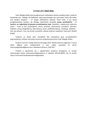 KONKURS OtO KOt Teatr Małego Widza jest przeogromnym miłośnikiem kotów wszelkiej maści i każdy to doskonale wie. Dlatego nie bylibyśmy sobą pozostawiając bez echa dzień, który dla kotów jest wielkim świętem – 17 lutego obchodzimy bowiem Dzień Kota. Z tej okazji przygotowaliśmy konkurs, do którego zapraszamy wszystkie grupy przedszkolne – to konkurs na najbardziej kreatywne przedstawienie kota. Wspólnie z opiekunami stwórzcie prace – może to być opowiadanie, wiersz, piosenka zilustrowana rysunkiem, obrazem, kolażem, pracą fotograficzną, foto-historią, praca wielkoformatowa, instalacja, działanie liczy się pomysł i liczy się przede wszystkim zabawa podczas wspólnych twórczych działań grupy! Czekamy na dzieła koto maniaków! Dla zwycięskich grup przedszkolnych poprowadzimy unikalne warsztaty muzyczne zorganizowane przez Teatr Małego Widza. Konkurs trwa od 1 lutego 2014 do 28 lutego 2014. Wyniki konkursu ogłosimy 7 marca 2014. Zdjęcia prac (maksymalnie 5 szt.) należy przesyłać na adres: [email protected] z dopiskiem Konkurs „OtO KOt”. Prosimy o zapoznanie się z regulaminem konkursu dostępnym na stronie internetowej teatru www.teatrmalegowidza.pl w zakładce AKTUALNOŚCI lub na profilu teatru na fb www.facebook/teatrmalegowidza.