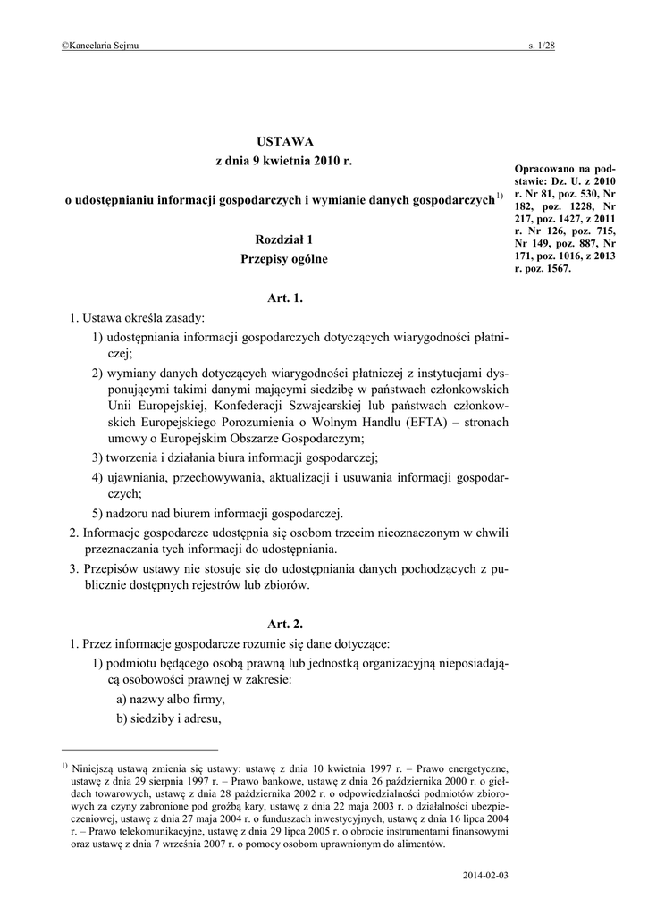 ©Kancelaria Sejmu s. 1/28 USTAWA z dnia 9 kwietnia 2010 r. o udostępnianiu informacji gospodarczych i wymianie danych gospodarczych 1) Rozdział 1 Przepisy ogólne Art. 1. 1. Ustawa określa zasady: 1) udostępniania informacji gospodarczych dotyczących wiarygodności płatniczej; 2) wymiany danych dotyczących wiarygodności płatniczej z instytucjami dysponującymi takimi danymi mającymi siedzibę w państwach członkowskich Unii Europejskiej, Konfederacji Szwajcarskiej lub państwach członkowskich Europejskiego Porozumienia o Wolnym Handlu (EFTA) – stronach umowy o Europejskim Obszarze Gospodarczym; 3) tworzenia i działania biura informacji gospodarczej; 4) ujawniania, przechowywania, aktualizacji i usuwania informacji gospodarczych; 5) nadzoru nad biurem informacji gospodarczej. 2. Informacje gospodarcze udostępnia się osobom trzecim nieoznaczonym w chwili przeznaczania tych informacji do udostępniania. 3. Przepisów ustawy nie stosuje się do udostępniania danych pochodzących z publicznie dostępnych rejestrów lub zbiorów. Art. 2. 1. Przez informacje gospodarcze rozumie się dane dotyczące: 1) podmiotu będącego osobą prawną lub jednostką organizacyjną nieposiadającą osobowości prawnej w zakresie: a) nazwy albo firmy, b) siedziby i adresu, 1) Niniejszą ustawą zmienia się ustawy: ustawę z dnia 10 kwietnia 1997 r. – Prawo energetyczne, ustawę z dnia 29 sierpnia 1997 r. – Prawo bankowe, ustawę z dnia 26 października 2000 r. o giełdach towarowych, ustawę z dnia 28 października 2002 r. o odpowiedzialności podmiotów zbiorowych za czyny zabronione pod groźbą kary, ustawę z dnia 22 maja 2003 r. o działalności ubezpieczeniowej, ustawę z dnia 27 maja 2004 r. o funduszach inwestycyjnych, ustawę z dnia 16 lipca 2004 r. – Prawo telekomunikacyjne, ustawę z dnia 29 lipca 2005 r. o obrocie instrumentami finansowymi oraz ustawę z dnia 7 września 2007 r. o pomocy osobom uprawnionym do alimentów. 2014-02-03 Opracowano na podstawie: Dz. U. z 2010 r. Nr 81, poz. 530, Nr 182, poz. 1228, Nr 217, poz. 1427, z 2011 r. Nr 126, poz. 715, Nr 149, poz. 887, Nr 171, poz. 1016, z 2013 r. poz. 1567. ©Kancelaria Sejmu s. 2/28 c) numeru właściwego rejestru wraz z oznaczeniem sądu rejestrowego, d) numeru identyfikacji podatkowej (NIP) lub innego numeru identyfikacyjnego w przypadku osoby zagranicznej, o której mowa w art. 5 pkt 2 lit. b i c ustawy z dnia 2 lipca 2004 r. o swobodzie działalności gospodarczej (Dz. U. z 2010 r. Nr 220, poz. 1447, z późn. zm.2)), e) numeru identyfikacyjnego w krajowym rejestrze urzędowym podmiotów gospodarki narodowej, zwanego dalej „numerem REGON”, jeżeli został nadany, f) imion, nazwisk i numeru ewidencyjnego Powszechnego Elektronicznego Systemu Ewidencji Ludności, zwanego dalej „numerem PESEL”, lub innego numeru potwierdzającego tożsamość wspólników, osób wchodzących w skład organów zarządzających lub prokurentów, g) imion i nazwisk pełnomocników, o ile zostali ustanowieni, h) głównego przedmiotu wykonywanej działalności gospodarczej; 2) osoby fizycznej w zakresie: a) imion i nazwiska, b) adresu miejsca zamieszkania lub adresu do doręczeń, c) numeru PESEL lub innego numeru potwierdzającego tożsamość, d) serii i numeru dowodu osobistego lub innego dokumentu potwierdzającego tożsamość; 3) osoby fizycznej prowadzącej działalność gospodarczą w zakresie: a) imion i nazwiska, b) numeru PESEL lub innego numeru potwierdzającego tożsamość, c) serii i numeru dowodu osobistego lub innego dokumentu potwierdzającego tożsamość, d) firmy, e) oznaczenia miejsca zamieszkania i adresu do doręczeń lub adresu, pod którym jest wykonywana działalność gospodarcza, f) numeru identyfikacji podatkowej (NIP) lub innego numeru identyfikacyjnego w przypadku osoby zagranicznej, o której mowa w art. 5 pkt 2 lit. a ustawy z dnia 2 lipca 2004 r. o swobodzie działalności gospodarczej, g) numeru REGON, jeżeli został nadany, h) numeru właściwej ewidencji wraz z oznaczeniem organu ewidencyjnego lub numeru właściwego rejestru wraz z oznaczeniem sądu rejestrowego w przypadku osoby zagranicznej, o której mowa w art. 5 pkt 2 lit. a ustawy z dnia 2 lipca 2004 r. o swobodzie działalności gospodarczej, i) imion i nazwisk pełnomocników, o ile zostali ustanowieni, j) głównego przedmiotu wykonywanej działalności gospodarczej; 4) zobowiązania pieniężnego w zakresie: 2) Zmiany tekstu jednolitego wymienionej ustawy zostały ogłoszone w Dz. U. z 2010 r. Nr 239, poz. 1593 oraz z 2011 r. Nr 85, poz. 459, Nr 106, poz. 622, Nr 112, poz. 654, Nr 120, poz. 690, Nr 131, poz. 764, Nr 132, poz. 766, Nr 153, poz. 902, Nr 163, poz. 981 i Nr 171, poz. 1016. 2014-02-03 ©Kancelaria Sejmu s. 3/28 a) tytułu prawnego, b) kwoty i waluty, c) kwoty zaległości, d) daty powstania zaległości, e) informacji o postępowaniach dotyczących zobowiązania, f) informacji o kwestionowaniu przez dłużnika istnienia całości lub części zobowiązania, g) daty wysłania listem poleconym albo doręczenia dłużnikowi do rąk własnych wezwania do zapłaty, zawierającego ostrzeżenie o zamiarze przekazania danych do biura informacji gospodarczej, z podaniem firmy i adresu siedziby tego biura, h) informacji o zbyciu wierzytelności, i) innych informacji przekazanych w trybie i na zasadach określonych w art. 18; 5) posłużenia się podrobionym lub cudzym dokumentem w zakresie: a) nazwy dokumentu, b) serii i numeru dokumentu, c) daty wystawienia dokumentu, d) oznaczenia, siedziby i adresu podmiotu wskazanego w dokumencie jako jego wystawca, e) imion i nazwiska osoby, której dokument dotyczy, f) okoliczności posłużenia się dokumentem, g) wskazania osoby lub organu, który stwierdził, że dokument jest podrobiony lub cudzy. 2. Ilekroć w ustawie jest mowa o: 1) dłużniku – rozumie się przez to osobę fizyczną, w tym osobę fizyczną wykonującą działalność gospodarczą, osobę prawną lub jednostkę orga