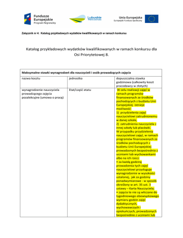 Załącznik nr 4: Katalog przykładowych wydatków kwalifikowanych w ramach konkursu Katalog przykładowych wydatków kwalifikowanych w ramach konkursu dla Osi Priorytetowej 8. Maksymalne stawki wynagrodzeń dla nauczycieli i osób prowadzących zajęcia nazwa kosztu jednostka wynagrodzenie nauczyciela prowadzącego zajęcia pozalekcyjne (umowa o pracę) Etat/część etatu dopuszczalna stawka godzinowa (całkowity koszt pracodawcy w złotych) W celu realizacji zajęć w ramach programów finansowanych ze środków pochodzących z budżetu Unii Europejskiej istnieje możliwość: 1) przydzielenia zajęć nauczycielowi zatrudnionemu w danej szkole, 2) zatrudnienia nauczyciela z innej szkoły lub placówki. W przypadku przydzielenia nauczycielowi zajęć, w ramach programów finansowanych ze środków pochodzących z budżetu Unii Europejskiej prowadzonych bezpośrednio z uczniami lub wychowankami albo na ich rzecz: • za każdą godzinę prowadzenia tych zajęć nauczycielowi przysługuje wynagrodzenie w wysokości ustalonej, jak za godziny ponadwymiarowe - w sposób określony w art. 35 ust. 3 ustawy – Karta Nauczyciela; • zajęcia te nie są wliczane do tygodniowego obowiązkowego wymiaru godzin zajęć dydaktycznych, wychowawczych i opiekuńczych, prowadzonych bezpośrednio z uczniami lub wychowankami albo na ich rzecz; • wynagrodzenie nauczycieli wymienionych w art. 35a ust. 1 nie uwzględnia się przy obliczaniu kwot wydatkowanych na średnie wynagrodzenia nauczycieli. W przypadku zatrudnienia nauczyciela w szkole lub placówce publicznej, w celu realizacji zajęć w ramach programów finansowanych ze środków pochodzących z budżetu Unii Europejskiej, prowadzonych bezpośrednio z uczniami lub wychowankami albo na ich rzecz, nauczyciel: • musi posiadać kwalifikacje określone w przepisach wydanych na podstawie art. 9 ust. 2 i 3 ustawy z dnia 26 stycznia 1982 r. - Karta Nauczyciela oraz • musi spełniać warunki określone w art. 10 ust. 5 pkt 3 i 4 tej ustawy - Karta Nauczyciela. Jest obowiązany przedstawić dyrektorowi szkoły lub placówki informację z Krajowego Rejestru Karnego; • zatrudniony jest na zasadach określonych w Kodeksie pracy, • za każdą godzinę prowadzenia zajęć, nauczycielowi przysługuje wynagrodzenie nie wyższe niż wynagrodzenie za jedną godzinę prowadzenia zajęć ponadwymiarową dla nauczyciela dyplomowanego posiadającego wykształcenie wyższe magisterskie i realizującego tygodniowy obowiązkowy wymiar godzin zajęć, o którym mowa w art. 42 ust. 3 w tabeli w lp. 3 ustawy – Karta Nauczyciela. wynagrodzenie nauczyciela prowadzącego dodatkowe zajęcia dydaktycznowyrównawcze bądź rozwijające uzdolnienia (umowa zlecenie) psycholog logopeda zajęcia z języka obcego specjalistyczne zajęcia (w tym terapeutyczne dla dzieci niepełnosprawnych) doradztwo edukacyjnozawodowe godzina 70 zł godzina godzina godzina godzina 100 zł 70 zł 70 zł 70 – 100 zł godzina Indywidualne 100 zł Grupowe 75 zł coaching indywidualny dla pracowników oświaty Wynagrodzenie opiekuna stażysty Wynagrodzenie za pracę/udział w stażach stażystów godzina 250 zł miesiąc Wg właściwego rozporządzenia prawa krajowego Wg właściwego rozporządzenia prawa krajowego miesiąc Maksymalne stawki sprzętu i mebli nazwa kosztu komputer z oprogramowaniem (system operacyjny + Office) tablica interaktywna z projektorem rzutnik kamera cyfrowa aparat mikroskop odtwarzacz cd/dvd telewizor drukarka biurko + krzesło jednostka sztuka dopuszczalna stawka 2700 zestaw 7000 zestaw sztuka sztuka sztuka sztuka sztuka sztuka zestaw 1700 1500 400 1500 200 2000 700 600 Koszty szkoleń kursy uzupełniające kurs szkolenia doskonalące, warsztaty szkolenie studia podyplomowe studia zgodnie ze stawkami rynkowymi zgodnie ze stawkami rynkowymi zgodnie ze stawkami rynkowymi Pozostałe koszty szkoleń sala wykładowa zestaw szkoleniowy (np. teczka, notes, długopis etc.) Materiały szkoleniowe (np. podręczniki, opracowania, poradniki, programy etc..) sala wykładowa specjalistyczna (komputerowa, laboratorium językowe, pracownia fizycznochemiczna) godzina zestaw 50 20 Zestaw 80-150 zł godzina 120