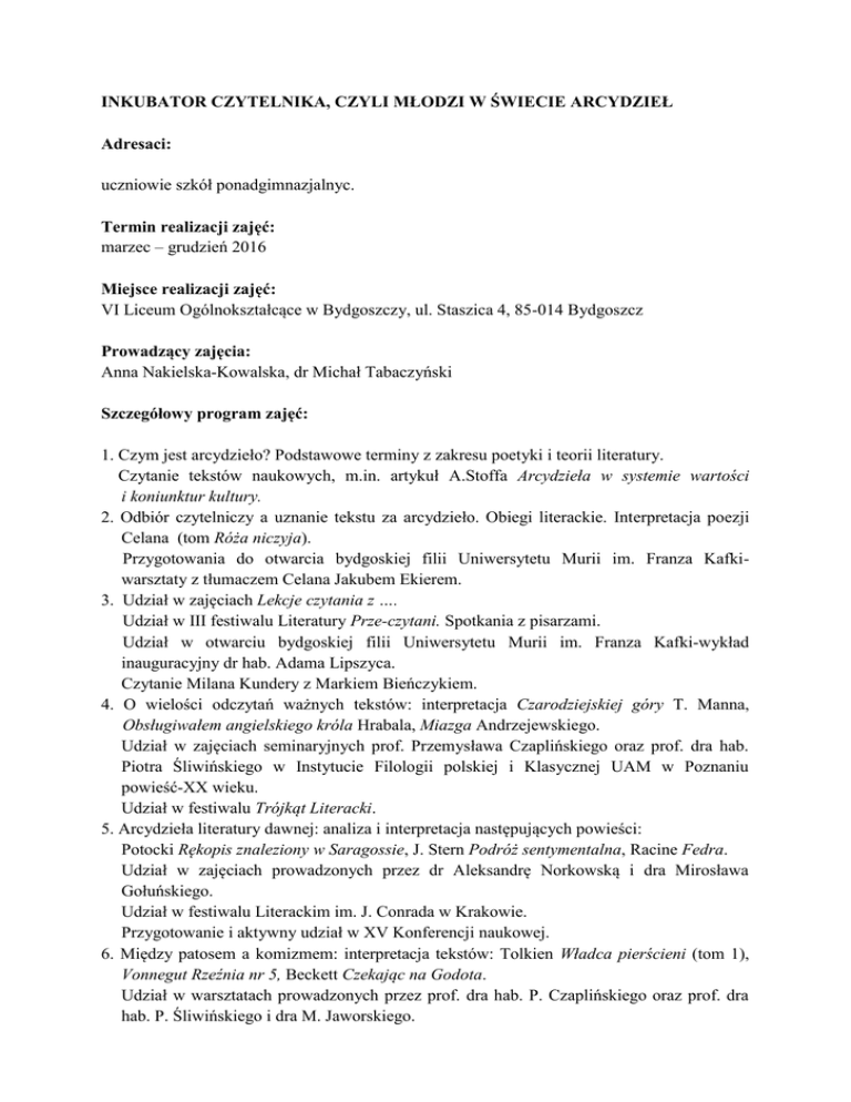 INKUBATOR CZYTELNIKA, CZYLI MŁODZI W ŚWIECIE ARCYDZIEŁ Adresaci: uczniowie szkół ponadgimnazjalnyc. Termin realizacji zajęć: marzec – grudzień 2016 Miejsce realizacji zajęć: VI Liceum Ogólnokształcące w Bydgoszczy, ul. Staszica 4, 85-014 Bydgoszcz Prowadzący zajęcia: Anna Nakielska-Kowalska, dr Michał Tabaczyński Szczegółowy program zajęć: 1. Czym jest arcydzieło? Podstawowe terminy z zakresu poetyki i teorii literatury. Czytanie tekstów naukowych, m.in. artykuł A.Stoffa Arcydzieła w systemie wartości i koniunktur kultury. 2. Odbiór czytelniczy a uznanie tekstu za arcydzieło. Obiegi literackie. Interpretacja poezji Celana (tom Róża niczyja). Przygotowania do otwarcia bydgoskiej filii Uniwersytetu Murii im. Franza Kafkiwarsztaty z tłumaczem Celana Jakubem Ekierem. 3. Udział w zajęciach Lekcje czytania z …. Udział w III festiwalu Literatury Prze-czytani. Spotkania z pisarzami. Udział w otwarciu bydgoskiej filii Uniwersytetu Murii im. Franza Kafki-wykład inauguracyjny dr hab. Adama Lipszyca. Czytanie Milana Kundery z Markiem Bieńczykiem. 4. O wielości odczytań ważnych tekstów: interpretacja Czarodziejskiej góry T. Manna, Obsługiwałem angielskiego króla Hrabala, Miazga Andrzejewskiego. Udział w zajęciach seminaryjnych prof. Przemysława Czaplińskiego oraz prof. dra hab. Piotra Śliwińskiego w Instytucie Filologii polskiej i Klasycznej UAM w Poznaniu powieść-XX wieku. Udział w festiwalu Trójkąt Literacki. 5. Arcydzieła literatury dawnej: analiza i interpretacja następujących powieści: Potocki Rękopis znaleziony w Saragossie, J. Stern Podróż sentymentalna, Racine Fedra. Udział w zajęciach prowadzonych przez dr Aleksandrę Norkowską i dra Mirosława Gołuńskiego. Udział w festiwalu Literackim im. J. Conrada w Krakowie. Przygotowanie i aktywny udział w XV Konferencji naukowej. 6. Między patosem a komizmem: interpretacja tekstów: Tolkien Władca pierścieni (tom 1), Vonnegut Rzeźnia nr 5, Beckett Czekając na Godota. Udział w warsztatach prowadzonych przez prof. dra hab. P. Czaplińskiego oraz prof. dra hab. P. Śliwińskiego i dra M. Jaworskiego. Warsztaty interpretacyjne poezja Różewicza, Tkaczyszyna Dyckiego i Różyckiego, Brodskiego, Miłosza, Pattena. Warsztaty translatorskie prowadzone przez P. Sommera. Zasady rekrutacji: W przypadku większej ilości chętnych niż miejsc, wyboru dokonają prowadzący projekt na podstawie informacji zawartych w formularzu zgłoszeniowym (opinii nauczyciela uwzględniającej osiągnięcia ucznia)