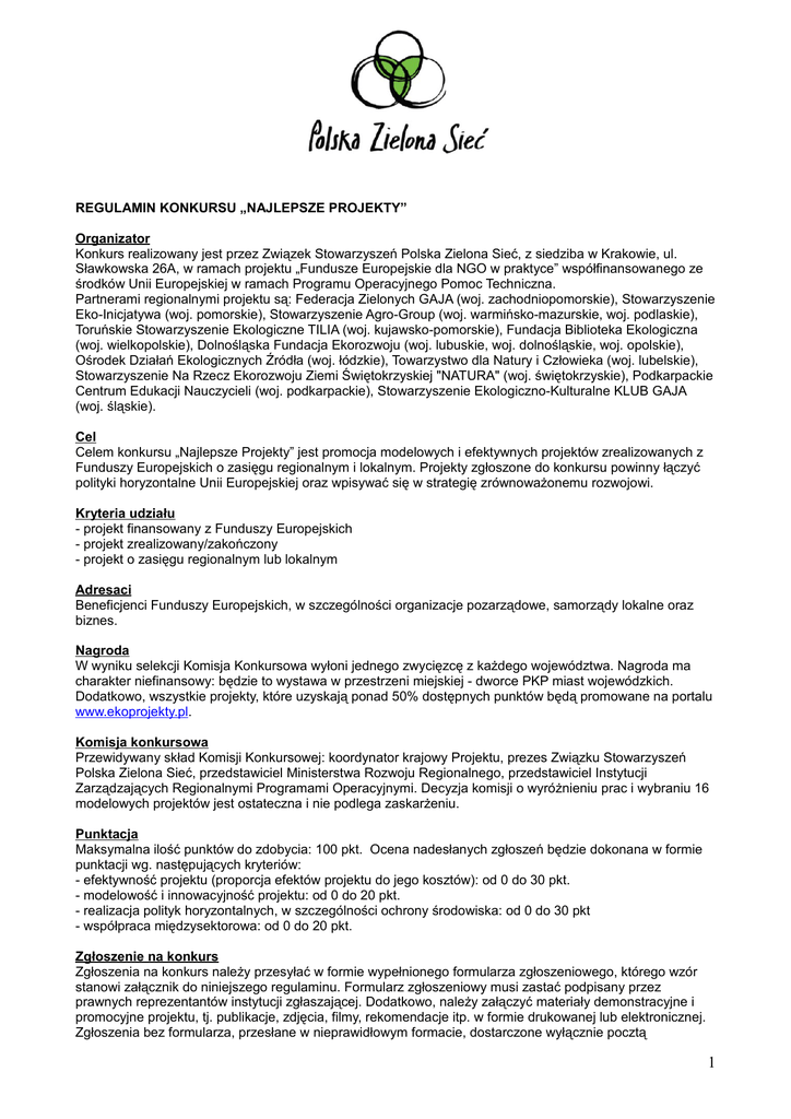 REGULAMIN KONKURSU „NAJLEPSZE PROJEKTY” Organizator Konkurs realizowany jest przez Związek Stowarzyszeń Polska Zielona Sieć, z siedziba w Krakowie, ul. Sławkowska 26A, w ramach projektu „Fundusze Europejskie dla NGO w praktyce” współfinansowanego ze środków Unii Europejskiej w ramach Programu Operacyjnego Pomoc Techniczna. Partnerami regionalnymi projektu są: Federacja Zielonych GAJA (woj. zachodniopomorskie), Stowarzyszenie Eko-Inicjatywa (woj. pomorskie), Stowarzyszenie Agro-Group (woj. warmińsko-mazurskie, woj. podlaskie), Toruńskie Stowarzyszenie Ekologiczne TILIA (woj. kujawsko-pomorskie), Fundacja Biblioteka Ekologiczna (woj. wielkopolskie), Dolnośląska Fundacja Ekorozwoju (woj. lubuskie, woj. dolnośląskie, woj. opolskie), Ośrodek Działań Ekologicznych Źródła (woj. łódzkie), Towarzystwo dla Natury i Człowieka (woj. lubelskie), Stowarzyszenie Na Rzecz Ekorozwoju Ziemi Świętokrzyskiej "NATURA" (woj. świętokrzyskie), Podkarpackie Centrum Edukacji Nauczycieli (woj. podkarpackie), Stowarzyszenie Ekologiczno-Kulturalne KLUB GAJA (woj. śląskie). Cel Celem konkursu „Najlepsze Projekty” jest promocja modelowych i efektywnych projektów zrealizowanych z Funduszy Europejskich o zasięgu regionalnym i lokalnym. Projekty zgłoszone do konkursu powinny łączyć polityki horyzontalne Unii Europejskiej oraz wpisywać się w strategię zrównoważonemu rozwojowi. Kryteria udziału - projekt finansowany z Funduszy Europejskich - projekt zrealizowany/zakończony - projekt o zasięgu regionalnym lub lokalnym Adresaci Beneficjenci Funduszy Europejskich, w szczególności organizacje pozarządowe, samorządy lokalne oraz biznes. Nagroda W wyniku selekcji Komisja Konkursowa wyłoni jednego zwycięzcę z każdego województwa. Nagroda ma charakter niefinansowy: będzie to wystawa w przestrzeni miejskiej - dworce PKP miast wojewódzkich. Dodatkowo, wszystkie projekty, które uzyskają ponad 50% dostępnych punktów będą promowane na portalu www.ekoprojekty.pl. Komisja konkursowa Przewidywany skład Komisji Konkursowej: koordynator krajowy Projektu, prezes Związku Stowarzyszeń Polska Zielona Sieć, przedstawiciel Ministerstwa Rozwoju Regionalnego, przedstawiciel Instytucji Zarządzających Regionalnymi Programami Operacyjnymi. Decyzja komisji o wyróżnieniu prac i wybraniu 16 modelowych projektów jest ostateczna i nie podlega zaskarżeniu. Punktacja Maksymalna ilość punktów do zdobycia: 100 pkt. Ocena nadesłanych zgłoszeń będzie dokonana w formie punktacji wg. następujących kryteriów: - efektywność projektu (proporcja efektów projektu do jego kosztów): od 0 do 30 pkt. - modelowość i innowacyjność projektu: od 0 do 20 pkt. - realizacja polityk horyzontalnych, w szczególności ochrony środowiska: od 0 do 30 pkt - współpraca międzysektorowa: od 0 do 20 pkt. Zgłoszenie na konkurs Zgłoszenia na konkurs należy przesyłać w formie wypełnionego formularza zgłoszeniowego, którego wzór stanowi załącznik do niniejszego regulaminu. Formularz zgłoszeniowy musi zastać podpisany przez prawnych reprezentantów instytucji zgłaszającej. Dodatkowo, należy załączyć materiały demonstracyjne i promocyjne projektu, tj. publikacje, zdjęcia, filmy, rekomendacje itp. w formie drukowanej lub elektronicznej. Zgłoszenia bez formularza, przesłane w nieprawidłowym formacie, dostarczone wyłącznie pocztą 1 elektroniczną, z pominięciem przesyłki pocztowej lub z nie podpisanym czy nieprawidłowo wypełnionym formularzem nie będą brane pod uwagę. Formularz wysłany online stanowi tylko informacje o wysłaniu zgłoszenia dla organizatora i nie musi mieć podpisu. Terminy i sposób nadsyłania prac Obowiązują następujące terminy: - termin nadsyłania zgłoszeń: 22 grudnia 2008 r. - ogłoszenie wyników: 12 stycznia 2009 r. - prezentacja wystawy: marzec – czerwiec 2009 r. Wypełniony formularz zgłoszeniowy wraz z dodatkowymi materiałami o projekcie należy nadsyłać na adres: Polska Zielona Sieć, ul. Sławkowska 26a, 31-014 Kraków z dopiskiem na kopercie: Konkurs „Najlepsze Projekty” oraz drogą mailową na adres: [email protected] (tylko formularz zgłoszeniowy), podając w tytule maila (w zależności od województwa realizacji projektu): Konkurs „Najlepsze Projekty” woj. mazowieckie Termin upływa: 22 grudnia 2008 r. (decyduje data stempla pocztowego) Wykorzystanie prac Nadesłane materiały prezentujące projekty mogą zostać wykorzystane przez organizatora w publikacjach promocyjnych oraz jako dokumentacja Konkursu. Materiał zdjęciowy powstały w celu wykonania ogólnopolskiej wystawy „Najlepsze Projekty” zostanie udostępniony poszczególnym beneficjentom na ich prośbę. Informacje dodatkowe - Organizator nie zwraca materiałów nadesłanych na konkurs; - Zgłoszenia konkursowe są przysyłane na koszt zgłaszającego projekty do konkursu; - Przystąpienie do konkursu i podpisanie formularza zgłoszeniowego jest jednoznaczne z zaakceptowaniem warunków Regulaminu konkursu; - Złożenie podpisu oznacza również, że uczestnik konkursu może legalnie dysponować prezentowanym materiałem. Polska Zielona Sieć nie ponosi odpowiedzialności prawnej ani finansowej w przypadku odkrycia faktów odmiennych niż deklarowanych przez uczestników; - Organizator zastrzega sobie prawo do udostępniania i przetwarzania informacji, które są przedmiotem konkursu celem jego realizacji - Organizator nie ponosi odpowiedzialności za zaginięcie lub uszkodzenie prac w trakcie transportu; - Wszystkie informacje o konkursie są dostępne na stronie www.ekoprojekty.pl. Kontakt: Małgorzata Krzystkiewicz email: [email protected] tel: (012) 431-28-08 Projekt realizowany w ramach konkursu dotacji organizowanego przez Ministerstwo Rozwoju Regionalnego, współfinansowanego ze środków Unii Europejskiej w ramach Programu Operacyjnego Pomoc Techniczna. 2