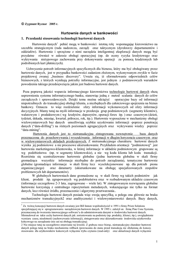 Zygmunt Ryznar 2005 r. Hurtownie danych w bankowo ci 1. Przes anki stosowania technologii hurtowni danych Hurtownie danych1 pe ni mog w bankowo ci istotn rol wspomagaj c kierownictwo na szczeblu strategicznym (rada nadzorcza, zarz d) oraz taktycznym (dyrektorzy departamentów i oddzia ów). Hurtownie i sprz one z nimi narz dzia inteligentnej eksploracji danych mog by przydatne równie w zakresie obs ugi operacyjnej (np. do oceny ryzyka kredytowego oraz wykrywania nietypowego zachowania przy dokonywaniu operacji za pomoc kradzionych lub podrobionych kart p atniczych). Uchwycenie potrzeb informacyjnych specyficznych dla biznesu, który ma by obs ugiwany przez hurtownie danych, jest w przypadku bankowo ci zadaniem z onym, wykonywanym zwykle w fazie projektowej zwanej „business discovery”. Uwa a si , i sformu owanie odpowiednich celów biznesowych, z których wynikaj potrzeby informacyjne, jest jednym z podstawowych warunków powodzenia takiego przedsi wzi cia jakim jest budowa hurtowni danych. Poza popraw jako ci wsparcia informacyjnego kierownictwa technologie hurtowni danych s uz usprawnieniu systemu informatycznego banku, stanowi c jedn z metod scalania danych do celów zarz dczych i sprawozdawczych. Dzi ki temu mo na odci operacyjne bazy od informacji niepotrzebnych do transakcyjnej obs ugi klienta, a niezb dnych dla ca ciowego spojrzenia na biznes bankowy. Oznacza to wi c rozdzielenie sfery informacji wykonawczych od sfery informacji decyzyjnych. Mamy tutaj na my li informacje w przekroju grup podmiotowych (segmenty klientów), walutowym i produktowym ( wg kredytów, depozytów, operacji forex itp. ) oraz czasowym (dzie , tydzie , dekada, miesi c, kwarta , pólrocze, rok, itp.). Hurtownie wyposa one w mechanizmy obs ugi wielowymiarowych baz danych umo liwiaj szybkie uzyskiwanie informacji -poprzez penetracj danych (“data-drilling”) na ró nych poziomach agregacyjnych oraz wykrywanie wiedzy poprzez “data-mining”. Hurtownia danych jest to nietransakcyjna zintegrowana wewn trznie baza danych przeznaczona do przechowywania i wyszukiwania informacji w d ugim horyzoncie czasowym oraz w wielowymiarowych uk adach przekrojowych. Z nietransakcyjnego charakteru hurtowni danych wynika jej podmiotowe a nie procesowe ukierunkowanie. Przyk adem orientacji "podmiotowej" jest hurtownia marketingowo-klientowska, w której informacje w uk adzie podmiotowym grupowane s wg podobie stwa (np. w segmenty klientowskie), a nie wg kodu klienta lub kodu transakcji. Rozró nia si scentralizowane hurtownie globalne (jedna hurtownia globalna w skali firmy gromadz ca wszystkie informacje niezb dne do potrzeb zarz dzania), tematyczne hurtownie globalne (gromadz ce informacje w skali firmy lecz wyselekcjonowane np. dla potrzeb pionu organizacyjnego) oraz datamarty (ukierunkowane na obs ug specjalizowanych zespo ów problemowych lub departamentów). W globalnych hurtowniach dane gromadzone s w skali firmy wg takich podmiotów jak klient, produkt itp. zgrupowanych wg podobie stwa oraz w rozbudowanym uk adzie czasowym (informacje szczegó owe 2-3 lata, zagregowane – wiele lat). W zintegrowanym rozwi zaniu globalne hurtownie korzystaj z centralnego repozytorium metadanych, wskazuj cego nie tylko na format danych, lecz równie ród o, przeznaczenie i algorytmy przetwarzania.. Technologia hurtowni danych posiada wi c swoj specyfik , a polega ona g ównie na braku mechanizmów transakcyjnych2 oraz analityczno ci i wielowymiarowo ci danych. Bazy danych, 1 Za twórc koncepcji hurtowni danych uwa any jest Bill Inmon wspó za yciel w 1991 r.firmy Prism Solutions specjalizuj cej si w oprogramowaniu narz dziowym hurtowni danych. W 1995 r. za on firm Pine Cone Systems, przeznaczon do tworzenia innowacyjnego software’u do administrowania danymi w rodowisku hurtowni danych. Sformu owa on takie cechy hurtowni danych jak: zorientowanie na podmioty (np. produkty, klienci, itp.), uwzgl dnienie wymiaru czasu, nieulotno (zachowywanie informacji), zintegrowanie oraz ukierunkowanie rodowiska u ytkownika ko cowego na zarz dzanie (nie za na obs ug transakcyjn ). 2 Nie miejsce tutaj na szczegó owe omawianie tej kwestii. Z grubsza rzecz bior c, nietransakcyjny charakter hurtowni danych polega tutaj na braku mechanizmu rollback (powracania do stanu przed transakcj nie obs on do konca), stosowaniu dla u ytkowników ko cowych wy cznie trybu czytania (read-only) oraz aktualizacji danych wy cznie 1 ywane w technologii hurtowni danych, ukierunkowane s na raportowanie i wyszukiwanie danych ywaj c do tego celu zaawansowanej techniki indeksowania oraz pos uguj c si predefiniowanymi wymiarami i agregatami danych. Utrzymywanie tych mechanizmów nie powoduje du ych komplikacji (poza konieczno ci przeznaczenia na ten cel sporej przestrzeni dyskowej) i nie zak óca procesu obs ugi zapyta , gdy bazy hurtowni aktualizowane s zwykle wsadowo (przebudowie ulegaj wtedy indeksy oraz tworzone s agregaty danych). Z punktu widzenia u ytkownika bazy s jedynie do odczytu z mo liwo ci obliczania danych pochodnych. Analityczno uk adu danych nie oznacza, e przechowuje ona informacje elementarne, lecz e umo liwia - za pomoc narz dzi OLAPowych - penetrowanie bazy danych na ró nych poziomach analitycznych, u ywaj c np. techniki analizy wg bnej “drill down” (np. rozpoczynaj c od wyniku ogó em w skali banku wg poszczególnych lat, nast pnie wewn trz wybranego roku do poszczególnych oddzia ów banku, wewn trz oddzia u do okre lonej klasy produktów bankowych itp.). Analityczne uk ady przebiegaj wi c poprzez wymiary (czasowe, geograficzne, grupy klientów, grupy produktów itp. Hurtownia danych posiada swoje specyficzne mechanizmy, wspieraj ce wielowymiarow analiz i do nich nale wielowymiarowe procedury dost pu (rozpoznaj ce hierarchi wymiarów) oraz metadane. Utrzymywanie wielowymiarowo ci stanowi najistotniejsz cech technologiczn hurtowni danych, rozró niaj hurtowni od klasycznych baz relacyjnych u ywanych w technologii OLTP oraz przej ciowych baz ODS (Op
