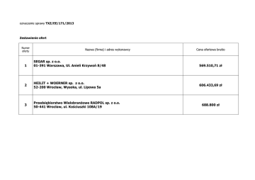 oznaczenie sprawy TXZ/EE/171/2013 Zestawienie ofert Numer oferty 1 Nazwa (firma) i adres wykonawcy SEGAR sp. z o.o. 01-391 Warszawa, Ul. Anieli Krzywoń 8/48 2 HEILIT + WOERNER sp. z o.o. 52-200 Wrocław, Wysoka, ul. Lipowa 5a 3 Przedsiębiorstwo Wielobranżowe RADPOL sp. z o.o. 50-441 Wrocław, ul. Kościuszki 108A/19 Cena ofertowa brutto 569.510,71 zł 606.433,69 zł 688.800 zł