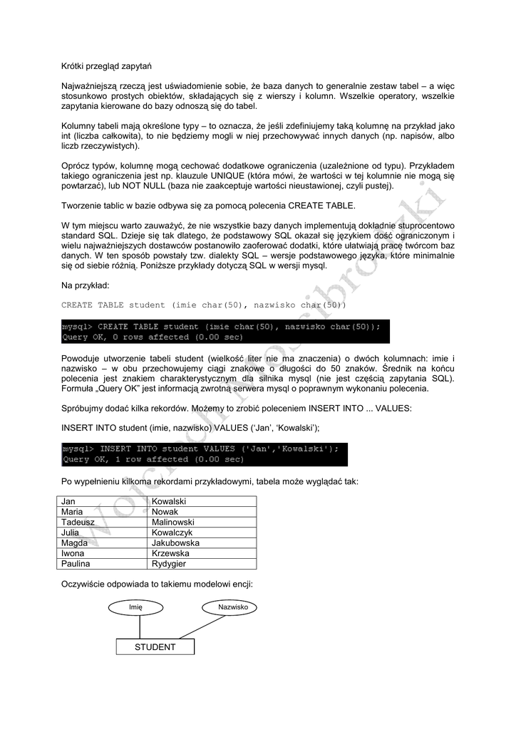 Krótki przegląd zapytań NajwaŜniejszą rzeczą jest uświadomienie sobie, Ŝe baza danych to generalnie zestaw tabel – a więc stosunkowo prostych obiektów, składających się z wierszy i kolumn. Wszelkie operatory, wszelkie zapytania kierowane do bazy odnoszą się do tabel. Kolumny tabeli mają określone typy – to oznacza, Ŝe jeśli zdefiniujemy taką kolumnę na przykład jako int (liczba całkowita), to nie będziemy mogli w niej przechowywać innych danych (np. napisów, albo liczb rzeczywistych). Oprócz typów, kolumnę mogą cechować dodatkowe ograniczenia (uzaleŜnione od typu). Przykładem takiego ograniczenia jest np. klauzule UNIQUE (która mówi, Ŝe wartości w tej kolumnie nie mogą się powtarzać), lub NOT NULL (baza nie zaakceptuje wartości nieustawionej, czyli pustej). Tworzenie tablic w bazie odbywa się za pomocą polecenia CREATE TABLE. W tym miejscu warto zauwaŜyć, Ŝe nie wszystkie bazy danych implementują dokładnie stuprocentowo standard SQL. Dzieje się tak dlatego, Ŝe podstawowy SQL okazał się językiem dość ograniczonym i wielu najwaŜniejszych dostawców postanowiło zaoferować dodatki, które ułatwiają pracę twórcom baz danych. W ten sposób powstały tzw. dialekty SQL – wersje podstawowego języka, które minimalnie się od siebie róŜnią. PoniŜsze przykłady dotyczą SQL w wersji mysql. Na przykład: CREATE TABLE student (imie char(50), nazwisko char(50)) Powoduje utworzenie tabeli student (wielkość liter nie ma znaczenia) o dwóch kolumnach: imie i nazwisko – w obu przechowujemy ciągi znakowe o długości do 50 znaków. Średnik na końcu polecenia jest znakiem charakterystycznym dla silnika mysql (nie jest częścią zapytania SQL). Formuła „Query OK” jest informacją zwrotną serwera mysql o poprawnym wykonaniu polecenia. Spróbujmy dodać kilka rekordów. MoŜemy to zrobić poleceniem INSERT INTO ... VALUES: INSERT INTO student (imie, nazwisko) VALUES (‘Jan’, ‘Kowalski’); Po wypełnieniu kilkoma rekordami przykładowymi, tabela moŜe wyglądać tak: Jan Maria Tadeusz Julia Magda Iwona Paulina Kowalski Nowak Malinowski Kowalczyk Jakubowska Krzewska Rydygier Oczywiście odpowiada to takiemu modelowi encji: Imię STUDENT Nazwisko Sprawdźmy teraz, jakie rekordy znajdują się w naszej bazie danych. SELECT, a najprostsza jego składnia wygląda tak: SłuŜy do tego polecenie SELECT [kolumny] FROM [tabela] Kolumny mogą przyjąć postać nazwy, nazw rozdzielanych przecinkiem lub *, która oznacza: wszystkie. Sprawdźmy. W tym celu wykonamy polecenie: SELECT * FROM student Oczywiście moglibyśmy teŜ wykonać: SELECT imie, nazwisko FROM student W tym miejscu jedna uwaga: zastosowany w przykładzie klient mysql (czyli oprogramowanie, którym łączymy się z bazą) domyślnie umieszcza w prezentowanym na ekranie wyniku nazwy kolumn. To nie jest zachowanie zgodne z SQL – jedynie pomoc dla uŜytkownika. Wynikiem zapytania są jedynie wartości pól, czyli tabela: Jan Maria Tadeusz Julia Magda Iwona Paulina Kowalski Nowak Malinowski Kowalczyk Jakubowska Krzewska Rydygier Oczywiście moŜemy takŜe poprosić bazę danych o same nazwiska: Istnieje sposób ograniczenia wyników zapytania SELECT. SłuŜy do tego klauzula WHERE, która jest swego rodzaju filtrem. Oznacza ona, Ŝe serwer bazy danych najpierw wykona (na własne potrzeby) zwykłe SELECT, a następnie wyświetli (zwróci) jedynie te rekordy, które pasują do warunku podanego w WHERE. Przykład: W tym miejscu zauwaŜmy, Ŝe warunki dla klauzuli WHERE budujemy najczęściej w oparciu o operatory = (równość) <> (róŜność) i > (większość). W przypadku łańcuchów tekstowych mamy takŜe często uŜywany operator LIKE (podobny do), stosowany wraz ze znakiem specjalnym % (zastępuje dowolny ciąg znaków, działa jak * przy wyszukiwaniu plików w Windows). W ten sposób mamy: RóŜność łańcuchów: Operator większości (dla liczb działa jak porównanie arytmetyczne, dla łańcuchów znakowych jak porównanie alfabetyczne): Zwróćmy uwagę, Ŝe operator podobieństwa nie zadziała dobrze, jeśli nie zastosujemy znaku %. Ściślej: zadziała wówczas, jak operator równości (a w bazie nie ma osoby o imieniu „na”: Wyszukujemy wszystkich tych, których imiona kończą się na „na”: Drugą waŜną klauzulą dla SELECT jest ORDER BY, czyli sortowanie. MoŜe ona być zastosowana samodzielnie lub razem z WHERE. Jeśli chodzi o kolejność poszczególnych elementów zapytania, to waŜne jest, aby pamiętać, jak ono w rzeczywistości jest wykonywane przez serwer. Popatrzmy na ostatnie zapytanie: SELECT * FROM student WHERE nazwisko LIKE ‘K%’ ORDER BY nazwisko. Na początku serwer wykona zwykłego selecta: SELECT * FROM student, otrzymując 7 rekordów. Z rekordów tych zostaną wyfiltrowane tylko te, w których nazwisko zaczyna się na literę K. Otrzymane 3 rekordy zostaną posortowane względem nazwiska. Dlatego zapytanie SELECT * ORDER BY nazwisko WHERE nazwisko LIKE ‘K%’ nie ma sensu (jest błędne). ZałóŜmy, Ŝe chcemy naszą tabelę rozszerzyć o nową kolumnę – będzie nią wzrost. Jest to oczywiście liczba int. Do modyfikacji istniejącej tabeli słuŜy polecenie ALTER TABLE. Oczywiście moŜna najpierw usunąć tabelę, potem stworzyć nową i ponownie wypełnić wartości – ale to zbyt skomplikowana droga. Jak widać, w tabeli pojawiła się nowa kolumna. KaŜdy rekord ma pole „wzrost” równe NULL. NULL jest specjalną wartością, która moŜe pojawić się w kolumnie dowolnego typu. Oznacza ona „wartość nieustaloną” i nie naleŜy jej mylić z wartością zerową. To tak jak z posiadaniem samochodu. Sytuacja, w której Kowalski NIE MA samochodu, to nie jest to samo, co sytuacja, w której NIE WIEMY, czy Kowalski ma samochód. W wersji SQL Kowalski ma 0 samochodów lub ma NULL samochodów. Aby ustawić wartość pola istniejącego rekordu, posłuŜymy się poleceniem UPDATE. Jedna bardzo waŜna uwaga –