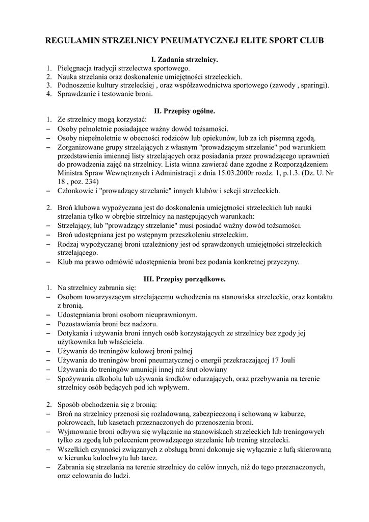 REGULAMIN STRZELNICY PNEUMATYCZNEJ ELITE SPORT CLUB 1. 2. 3. 4. I. Zadania strzelnicy. Pielęgnacja tradycji strzelectwa sportowego. Nauka strzelania oraz doskonalenie umiejętności strzeleckich. Podnoszenie kultury strzeleckiej , oraz współzawodnictwa sportowego (zawody , sparingi). Sprawdzanie i testowanie broni. II. Przepisy ogólne. 1. – – – – Ze strzelnicy mogą korzystać: Osoby pełnoletnie posiadające ważny dowód tożsamości. Osoby niepełnoletnie w obecności rodziców lub opiekunów, lub za ich pisemną zgodą. Zorganizowane grupy strzelających z własnym "prowadzącym strzelanie" pod warunkiem przedstawienia imiennej listy strzelających oraz posiadania przez prowadzącego uprawnień do prowadzenia zajęć na strzelnicy. Lista winna zawierać dane zgodne z Rozporządzeniem Ministra Spraw Wewnętrznych i Administracji z dnia 15.03.2000r rozdz. 1, p.1.3. (Dz. U. Nr 18 , poz. 234) Członkowie i "prowadzący strzelanie" innych klubów i sekcji strzeleckich. 2. Broń klubowa wypożyczana jest do doskonalenia umiejętności strzeleckich lub nauki strzelania tylko w obrębie strzelnicy na następujących warunkach: – Strzelający, lub "prowadzący strzelanie" musi posiadać ważny dowód tożsamości. – Broń udostępniana jest po wstępnym przeszkoleniu strzeleckim. – Rodzaj wypożyczanej broni uzależniony jest od sprawdzonych umiejętności strzeleckich strzelającego. – Klub ma prawo odmówić udostępnienia broni bez podania konkretnej przyczyny. III. Przepisy porządkowe. 1. Na strzelnicy zabrania się: – Osobom towarzyszącym strzelającemu wchodzenia na stanowiska strzeleckie, oraz kontaktu z bronią. – Udostępniania broni osobom nieuprawnionym. – Pozostawiania broni bez nadzoru. – Dotykania i używania broni innych osób korzystających ze strzelnicy bez zgody jej użytkownika lub właściciela. – Używania do treningów kulowej broni palnej – Używania do treningów broni pneumatycznej o energii przekraczającej 17 Jouli – Używania do treningów amunicji innej niż śrut ołowiany – Spożywania alkoholu lub używania środków odurzających, oraz przebywania na terenie strzelnicy osób będących pod ich wpływem. 2. Sposób obchodzenia się z bronią: – Broń na strzelnicy przenosi się rozładowaną, zabezpieczoną i schowaną w kaburze, pokrowcach, lub kasetach przeznaczonych do przenoszenia broni. – Wyjmowanie broni odbywa się wyłącznie na stanowiskach strzeleckich lub treningowych tylko za zgodą lub poleceniem prowadzącego strzelanie lub trening strzelecki. – Wszelkich czynności związanych z obsługą broni dokonuje się wyłącznie z lufą skierowaną w kierunku kulochwytu lub tarcz. – Zabrania się strzelania na terenie strzelnicy do celów innych, niż do tego przeznaczonych, oraz celowania do ludzi. 3. Sposób zachowania się osób przebywających na strzelnicy: – Korzystający ze strzelnicy jest zobowiązany ściśle przestrzegać poleceń wydawanych przez prowadzącego strzelanie. – Zabrania się wchodzenia przed stanowisko strzeleckie bez zgody prowadzącego strzelanie. – Korzystający ze strzelnicy, z wyjątkiem osoby niepełnosprawnej zobowiązany jest przestrzegać przepisów dotyczących postaw strzeleckich. – Po komendzie "STOP", wydanej przez prowadzącego strzelanie lub inną osobę, strzelający bezzwłocznie przerywa strzelanie i rozładowuje broń. – W obiekcie strzelnicy obowiązuje zasada wzajemnego szacunku. – Osoby naruszające regulamin strzelnicy usuwa się z obiektu. 4. Obowiązki korzystającego ze strzelnicy: – Zapoznać się i bezwzględnie przestrzegać Regulaminu Strzelnicy oraz Przepisów Bezpieczeństwa. – Dokonać czytelnego wpisu wymaganych danych do Książki rejestru pobytu na strzelnicy. – Bezwzględnie stosować się do komend i poleceń wydawanych przez prowadzącego strzelanie. – Tak kierować ogniem broni aby nie dopuścić do zagrożenia bezpieczeństwa osób przebywających na strzelnicy i do uszkodzeń sprzętu. – Stosować ochronniki wzroku. – W przypadku strzelania do celów metalowych należy bezwzględnie stosować ochronniki oczu. 5. Obowiązki prowadzącego strzelanie: – Wyznacza korzystającemu ze strzelnicy stanowisko strzeleckie, a osobom towarzyszącym wyznacza miejsce bezpiecznego pobytu. – Przeprowadza instruktaż stanowiskowy bezpiecznego posługiwania się bronią, oraz instruktaż strzelecki. – Nadzoruje przebieg strzelania. – Odpłatnie przeprowadza naukę strzelania i trening strzelecki. – Dokonuje przeglądu broni. – Odpowiada za bezpieczeństwo użytkowników strzelnicy, oraz osób towarzyszących. IV. Przepisy końcowe. 1. Bez zgody prowadzącego strzelanie nie wolno wchodzić na teren strzelnicy. 2. Osobom co do których istnieje wątpliwość, że mogą zagrażać sobie lub innym nie zezwala się na strzelanie. 3. Za wyrządzone szkody materialnie odpowiada strzelający. 4. Za spowodowanie wypadku odpowiedzialność karną ponosi osoba , która go spowodowała. 5. Przypomina się strzelającym, że na Strzelnicy obowiązują wszystkie przepisy USTAWY z dnia 21 maja 1999r. O BRONI I AMUNICJI ( Dz. U. Nr 53, poz. 549 ), oraz aktualne rozporządzenia i akty wykonawcze do Niej wydane. 6. Załącznikami do niniejszego regulaminu są rozszerzone zasady bezpieczeństwa posługiwania się bronią i zachowania się na strzelnicy.