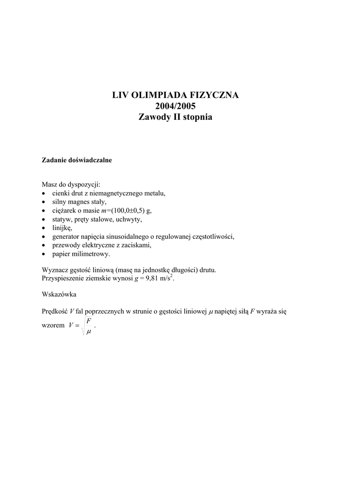LIV OLIMPIADA FIZYCZNA 2004/2005 Zawody II stopnia Zadanie doświadczalne Masz do dyspozycji: • cienki drut z niemagnetycznego metalu, • silny magnes stały, • ciężarek o masie m=(100,0±0,5) g, • statyw, pręty stalowe, uchwyty, • linijkę, • generator napięcia sinusoidalnego o regulowanej częstotliwości, • przewody elektryczne z zaciskami, • papier milimetrowy. Wyznacz gęstość liniową (masę na jednostkę długości) drutu. Przyspieszenie ziemskie wynosi g = 9,81 m/s2. Wskazówka Prędkość V fal poprzecznych w strunie o gęstości liniowej µ napiętej siłą F wyraża się F . wzorem V = µ Rozwiązanie Część teoretyczna Zadanie można rozwiązać badając częstotliwość drgań własnych drutu obciążonego ciężarkiem (rys. 1). statyw pręt stalowy luźne końce drutu napięta część drutu Generator magnes Hz ciężarek Ciężarek należy zawiesić na statywie wykorzystując tylko część drutu. Luźne końce drutu należy połączyć z zaciskami generatora za pomocą „krokodylków”. Należy zadbać, aby nie wprowadziło to dodatkowego napięcia drutu. Na odcinek drutu o długości ∆L znajdujący się w pobliżu magnesu działa siła elektrodynamiczna proporcjonalna do chwilowej wartości natężenia prądu i płynącego przez drut oraz indukcji pola magnetycznego B wytwarzanego przez magnes (F=Bi∆L). Kierunek siły jest prostopadły zarówno do kierunku prądu jak i wektora indukcji B. Ponieważ przez drut płynie prąd zmienny to zwrot siły zmienia się z częstotliwością zadaną przez generator. Częstotliwość prądu wytwarzanego przez generator można dobrać tak, aby zrównała się z częstotliwością drgań własnych drutu. W rezonansie nawet niewielkie zaburzenie periodyczne może doprowadzić do tak dużego wzrostu amplitudy drgań, że będzie można je zaobserwować bez żadnych dodatkowych przyrządów. Wtedy możliwe będzie odczytanie częstotliwości rezonansowej wprost ze skali generatora. Jeśli potraktować drut jak strunę zamocowaną z dwóch końców, to długość fali odpowiadająca jego kolejnym drganiom własnym wyniesie: λn = 2L/n, (1) gdzie n - liczba naturalna. Z drugiej strony długość fali λ można wyrazić przez prędkość V oraz częstotliwość fn fali rozchodzącej się w strunie: λn = 1 V . f n (2) Po podstawieniu związku (2) do (1) i skorzystaniu ze związku V = F µ podanego w we wskazówce do zadania, otrzymujemy wyrażenie na częstotliwość kolejnych drgań własnych układu: fn = 1 F n, 2L µ (3) co można przedstawić w postaci: f n = f1n , gdzie f1 = 1 2L F µ (4) - częstotliwość drgania podstawowego. Przed zastosowaniem tego wzoru w dalszych rozważaniach, należy się zastanowić czy rzeczywiście można potraktować drut obciążony ciężarkiem jak strunę zamocowaną z dwóch końców. Można do tego zagadnienia podejść na różne sposoby: 1) Można sprawdzić doświadczalnie, że kolejne częstotliwości rezonansowe drutu są wielokrotnościami częstotliwości podstawowej i w ten sposób wykazać zasadność stosowania wzoru (3). 2) Można argumentować, że drut jest bardzo cienki i dlatego można pominąć wpływ jego sztywności na częstotliwość drgań układu. Ponieważ ma on znikomą masę w porównaniu z masą ciężarka to jego zamocowanie od strony ciężarka można uznać za sztywne. Dodatkowo niewielka masa drutu powoduje, że siłę naciągu drutu można uznać za stałą na całej długości jego napiętej części. Naciąg określony jest wtedy jedynie przez ciężar obciążnika. Przy spełnieniu powyższych warunków równanie (3) jest również spełnione i szukaną gęstość liniową struny wyrazić można wzorem: µ= 1 F . 4 L2 f12 (5) Część doświadczalna Obciążamy ciężarkiem drut i zawieszamy go na statywie tak by zwisał tuż przy magnesie. Magnes powinien być umieszczony na takiej wysokości, na której spodziewamy się strzałki drgań drutu. Dla drgań podstawowych (λ=2L), będzie to w połowie drutu, dla drugiej częstotliwości własnej (λ=L) w odległości 1/4 długości drutu, a dla trzeciej (λ=2/3L) odpowiednio w 1/6 lub 1/2 odległości od jednego z końców. Po podłączeniu drutu do generatora ustawiamy najniższą możliwą częstotliwość prądu i powoli ją zwiększamy, aż do uzyskania rezonansu. W przypadku, gdy amplituda drgań jest zbyt duża i drut uderza o magnes, należy zwiększyć jego odległość od magnesu. Ze skali generatora odczytujemy wartości częstotliwości, dla których amplituda drgań drutu silnie wzrasta. W doświadczeniu 2 wykonanym przez recenzenta użyto generatora G432 o oporności wyjściowej 50Ω. Bez obciążenia amplituda napięcia na wyjściu tego generatora wynosiła 5V. Dla drutu miedzianego o średnicy 0,15 mm i długości części drgającej L= (43,2±0,2) cm (zmierzonej linijką), przy naciągu F = mg = (0,98±0,005) N wyznaczono częstotliwość drgania podstawowego drutu f1=(92±2) Hz. Kolejne częstotliwości rezonansowe wynosiły odpowiednio 180±10Hz, 275±10 Hz. Wyniki te możemy nanieść na wykres i dopasować prostą (rys. 2). 300 α = (91±4) Hz Częstotliwość (Hz) 250 200 150 100 50 0 0 1 2 3 n Rys. 2 Z wykresu wynika, że w granicach niepewności odczytu, zmierzone częstotliwości są równe kolejnym wielokrotnościom częstotliwości drgań podstawowych f1. Biorąc pod uwagę współczynnik nachylenia prostej α =(91±4) Hz, uzyskany z dopasowania do danych eksperymentalnych, i korzystając ze wzoru (4) otrzymamy µ = (1,60±0,14)·10-4 kg/m. Ponieważ niepewność względna wyznaczenia częstotliwości podstawowej drgań ∆f1/f1 ≅ 0,02 jest znacznie większa od niepewności względnej długości drutu i masy ciężarka ∆L/L ≅ ∆m/m=0,005, to bez uszczerbku dla dokładności wyniku końcowego, gęstość liniową drutu można wyznaczyć bez pomiaru wyższych częstotliwości rezonansowych. Po podstawieniu danych do wzoru (5) uzyskujemy wtedy wartość µ = (1,55