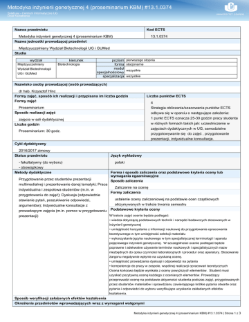 Metodyka inżynierii genetycznej 4 (proseminarium KBM) #13.1.0374 Sylabusy - Centrum Informatyczne UG Dział Kształcenia Nazwa przedmiotu Kod ECTS Metodyka inżynierii genetycznej 4 (proseminarium KBM) Nazwa jednostki prowadzącej przedmiot 13.1.0374 Międzyuczelniany Wydział Biotechnologii UG i GUMed Studia wydział Międzyuczelniany Wydział Biotechnologii UG i GUMed kierunek Biotechnologia poziom forma moduł specjalnościowy specjalizacja pierwszego stopnia stacjonarne wszystkie wszystkie Nazwisko osoby prowadzącej (osób prowadzących) dr hab. Krzysztof Hinc Formy zajęć, sposób ich realizacji i przypisana im liczba godzin Formy zajęć Liczba punktów ECTS 4 Strategia obliczania/szacowania punktów ECTS odbywa się w oparciu o następujące założenia: 1 punkt ECTS oznacza 25-30 godzin pracy studenta w różnych formach takich jak: uczestniczenie w zajęciach dydaktycznych w UG, samodzielne przygotowywanie się do zajęć , przygotowanie prezentacji, indywidualne konsultacje. Proseminarium Sposób realizacji zajęć zajęcia w sali dydaktycznej Liczba godzin Proseminarium: 30 godz. Cykl dydaktyczny 2016/2017 zimowy Status przedmiotu - fakultatywny (do wyboru) - obowiązkowy Metody dydaktyczne Przygotowanie przez studentów prezentacji multimedialnej i prezentowanie danej tematyki; Praca indywidualna i zespołowa studentów (m.in. w przygotowaniu do zajęć); Dyskusja (odpowiednie stawianie pytań, poszukiwanie odpowiedzi, argumentów); Indywidualne konsultacje z prowadzącym zajęcia (m.in. pomoc w przygotowaniu prezentacji) Język wykładowy polski Forma i sposób zaliczenia oraz podstawowe kryteria oceny lub wymagania egzaminacyjne Sposób zaliczenia Zaliczenie na ocenę Formy zaliczenia ustalenie oceny zaliczeniowej na podstawie ocen cząstkowych otrzymywanych w trakcie trwania semestru Podstawowe kryteria oceny W trakcie zajęć ocenie będzie podlegać: • wiedza dotyczącą podstawowych technik i narzędzi badawczych stosowanych w inżynierii genetycznej • umiejętność korzystania z informacji naukowej do przygotowania opracowania teoretycznego w tym umiejętność selekcji materiału • wykorzystanie języka naukowego w tym specjalistycznej terminologii i aparatu pojęciowego inżynierii genetycznej. W szczególności ocenie podlegać będzie poprawne i adekwatne używanie terminów naukowych i specjalistycznych nazw niezbędnych do opisu czynności laboratoryjnych i procedur oraz aparatury. Stosowanie żargonu negatywnie wpłynie na uzyskaną ocenę. • umiejętność prowadzenia dyskusji i odpowiedzi na pytania • kompetencje do pracy w zespole, wspólnej realizacji opracowań teoretycznych Ocena końcowa będzie wynikała z oceny powyższych elementów. Student musi uzyskać pozytywną ocenę każdego z ocenianych elementów. Prowadzący przeprowadzi ocenę na podstawie aktywności studenta podczas zająć, przygotowanych przez studentów materiałów i sprawdzianu zawierającego krótkie pytania otwarte oraz pytania i odpowiedzi do wyboru weryfikujące uzyskanie zakładanych efektów kształcenia. Sposób weryfikacji założonych efektów kształcenia Określenie przedmiotów wprowadzających wraz z wymogami wstępnymi Metodyka inżynierii genetycznej 4 (proseminarium KBM) #13.1.0374 | Strona 1 z 3 Metodyka inżynierii genetycznej 4 (proseminarium KBM) #13.1.0374 Sylabusy - Centrum Informatyczne UG Dział Kształcenia A. Wymagania formalne brak B. Wymagania wstępne Wymagane jest uzyskanie wiedzy, umiejętności i kompetencji określonych dla kursów Biologia molekularna (wykład, ćwiczenia), Biochemia (wykład, ćwiczenia), Genetyka (wykład) Cele kształcenia Kurs jest tematycznie związany z zajęciami laboratoryjnymi „Pracownia Inżynierii Genetycznej”. Studenci pod opieką prowadzącego przygotowują oraz prezentują i omawiają wybrane techniki inżynierii genetycznej i biologii molekularnej. Zakłada się indywidualna i zespołową pracę studenta w przygotowaniu do zajęć. Prowadzący kierując dyskusją wskazuje na zalety i wady prezentowanych metod, przekazuje studentom wiedzę i doświadczenie praktyczne stosowania omawianych technik laboratoryjnych. Studenci uczą się stawiania pytań, szukania odpowiedzi oraz potrzeby projektowania i przeprowadzania odpowiednich kontroli eksperymentów. Podczas kursu studenci mają możliwość uczenia się i doskonalenia sposobu prezentacji. Studenci poznają fachową nomenklaturę dotyczącą omawianych zagadnień. Celem kursu jest przygotowanie studentów do teoretycznego opracowania metod laboratoryjnych i procedur stosowanych w inżynierii genetycznej, a w szczególności: • Student zdobędzie wiedzę dotyczącą podstawowych technik i narzędzi badawczych inżynierii genetycznej (K_W07) • Zdobędzie umiejętność korzystania z informacji naukowej, wykorzystując źródła elektroniczne dostępne w zasobach bibliotek UG i GUMed (K_U02) • Student nauczy się stosowania języka naukowego w tym specjalistycznej terminologii i aparatu pojęciowego inżynierii genetycznej (K_U06) • Student zdobędzie umiejętność przygotowania i prezentacji w języku polskim wystąpienia ustnego obejmujące szczegółowe zagadnienia w zakresie inżynierii genetycznej (K_U07) • Student nauczy się pracy zespołowej dotyczącej teoretycznego przygotowywania i prezentacji zagadnień z zakresu inżynierii genetycznej (K_K02) Treści programowe W programie zajęć znajdują się zagadnienia związane z metodami inżynierii genetycznej, opis metod, zasady stosowania, etapy procedur laboratoryjnych i ich podstawy teoretyczne. Zajęcia obejmą zagadnienia: 1. Izolacja kwasów nukleinowych izolacja DNA plazidowego, izolacja DNA chromosomalnego, izolacja RNA, izolacja kwasów nukleinowych z tkanek zwierzęcych i roślinnych, izolacja kwasów nukleinowych z bakterii, izolacja kwasów nukleinowych z organelli komórkowych, izolacja kwasów nukleinowych z materiałów archiwalnych np. słupki parafinowe, kości 2. Metody