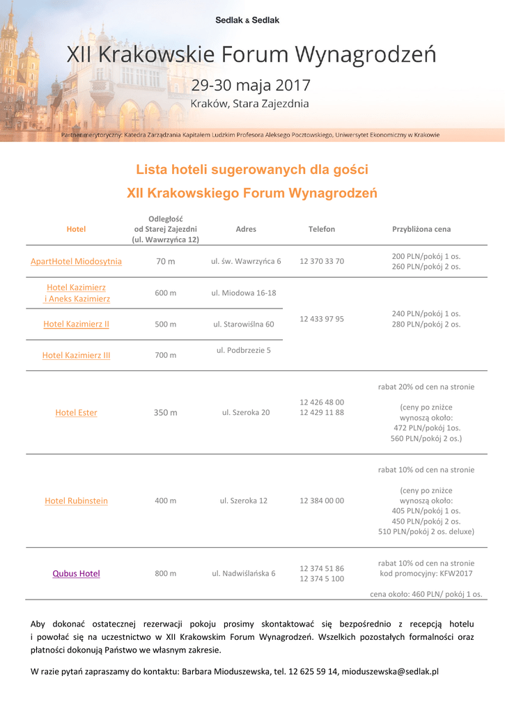 Lista hoteli sugerowanych dla gości XII Krakowskiego Forum