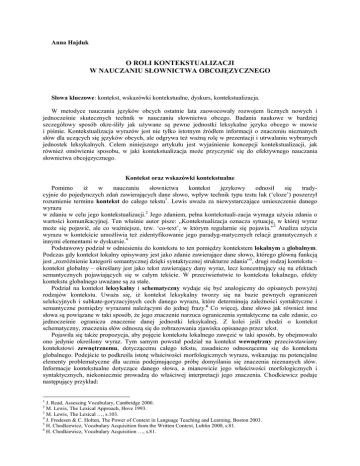 Anna Hajduk O ROLI KOTEKSTUALIZACJI W AUCZAIU SŁOWICTWA OBCOJĘZYCZEGO Słowa kluczowe: kontekst, wskazówki kontekstualne, dyskurs, kontekstualizacja. W metodyce nauczania języków obcych ostatnie lata zaowocowały rozwojem licznych nowych i jednocześnie skutecznych technik w nauczaniu słownictwa obcego. Badania naukowe w bardziej szczegółowy sposób okre-śliły jak używane są pewne jednostki leksykalne języka obcego w mowie i piśmie. Kontekstualizacja wyrazów jest nie tylko istotnym źródłem informacji o znaczeniu nieznanych słów dla uczących się języków obcych, ale odgrywa też ważną rolę w prezentacji i utrwalaniu wybranych jednostek leksykalnych. Celem niniejszego artykułu jest wyjaśnienie koncepcji kontekstualizacji, jak również omówienie sposobu, w jaki kontekstualizacja może przyczynić się do efektywnego nauczania słownictwa obcojęzycznego. Kontekst oraz wskazówki kontekstualne Pomimo iż w nauczaniu słownictwa kontekst językowy odnosił się tradycyjnie do pojedynczych zdań zawierających dane słowo, wpływ technik typu testu luk (‘cloze’) poszerzył rozumienie terminu kontekst do całego tekstu1. Lewis uważa za niewystarczające umieszczenie danego wyrazu w zdaniu w celu jego kontekstualizacji.2 Jego zdaniem, pełna kontekstuali-zacja wymaga użycia zdania o wartości komunikacyjnej. Ten właśnie autor pisze: „Kontekstualizacja oznacza sytuację, w której wyraz może się pojawić, ale co ważniejsze, tzw. ‘co-text’, w którym regularnie się pojawia.”3 Analiza użycia wyrazu w kontekście umożliwia też zidentyfikowanie jego paradyg-matycznych relacji gramatycznych z innymi elementami w dyskursie.4 Podstawowy podział w odniesieniu do kontekstu to ten pomiędzy kontekstem lokalnym a globalnym. Podczas gdy kontekst lokalny opisywany jest jako zdanie zawierające dane słowo, którego główną funkcją jest „rozróżnienie kategorii semantycznej dzięki syntaktycznej strukturze zdania”5, drugi rodzaj kontekstu – kontekst globalny – określany jest jako tekst zawierający dany wyraz, lecz koncentrujący się na efektach semantycznych pojawiających się w całym tekście. W przeciwieństwie to kontekstu lokalnego, efekty kontekstu globalnego uważane są za stałe. Podział na kontekst leksykalny i schematyczny wydaje się być analogiczny do opisanych powyżej rodzajów kontekstu. Uważa się, iż kontekst leksykalny tworzy się na bazie pewnych ograniczeń selekcyjnych i subkate-goryzacyjnych cech danego wyrazu, które determinują zależności syntaktyczne i semantyczne pomiędzy wyrazami należącymi do jednej frazy.6 Co więcej, dane słowo jak również inne słowa są powiązane w taki sposób, że jego znaczenie narzuca ograniczenia syntaktyczne na całe zdanie, co jednocześnie ogranicza znaczenie danej jednostki leksykalnej. Z kolei jeśli chodzi o kontekst schematyczny, znaczenia słów odnoszą się do zobrazowania zjawiska opisanego przez tekst. Pojawiła się także propozycja, aby pojęcie kontekstu lokalnego zawęzić w taki sposób, by obejmowało ono jedynie określony wyraz. Tym samym powstał podział na kontekst wewnętrzny przeciwstawiany kontekstowi zewnętrznemu, dotyczącemu całego tekstu, zasadniczo odnoszącemu się do kontekstu globalnego. Podejście to podkreśla istotę właściwości morfologicznych wyrazu, wskazując na potencjalne elementy problematyczne dla ucznia podejmującego próbę domyślania się znaczenia nieznanych słów. Informacje kontekstualne dotyczące danego słowa, a mianowicie jego właściwości morfologicznych i syntaktycznych, niekoniecznie prowadzą do właściwej interpretacji jego znaczenia. Chodkiewicz podaje następujący przykład: 1 J. Read, Assessing Vocabulary, Cambridge 2000. M. Lewis, The Lexical Approach, Hove 1993. 3 M. Lewis, The Lexical …, s.103. 4 J. Frodesen & C. Holten, The Power of Context in Language Teaching and Learning, Boston 2003. 5 H. Chodkiewicz, Vocabulary Acquisition from the Written Context, Lublin 2000, s.81. 6 H. Chodkiewicz, Vocabulary Acquisition …, s.81. 2 „(...) podczas gdy wyraz thermo-luminescence może być analizowany jako składający się z przedrostka therme, wywodzącego się z Greki – „odnoszący się do ciepła”, oraz łacińskiego rdzenia o znaczeniu “światło”, istnieją pewne ograniczenia, które muszą być nam znane aby stwierdzić, że despot nie zawiera w sobie przedrostka de-” .7 Warto nadmienić, iż rozumienie pojęć kontekstu lokalnego i globalnego jest pomocne nie tylko w przypadku domyślania się znaczenia wyrazu z kontekstu. Wiedza ta jest niezbędna do wyjaśnienia uczniom znaczeń niektórych słów, jak również zapewnienia właściwie opracowanych sposobów pracy nad nieznanymi jednostkami leksykalnymi w kontekście, zarówno na poziomie zdania, jak i całego tekstu. W związku z tym konieczne jest zaprezentowanie tzw. wskazówek kontekstualnych, których funkcjonowanie wywiera wpływ na tworzenie różnych typów kontekstu. Taksonomia wskazówek kontekstualnych powstała, aby pomóc uczącym się drugiego języka w rozumieniu nieznanego słownictwa oraz w domyślaniu się znaczenia nowych wyrazów z kontekstu. Niektóre z wymienionych wskazówek kontekstualnych mogą być stosowane do konstruowania odpowiednich kontekstów w celu zaprezentowania znaczenia nowego słowa, jak również opracowania zadań niezbędnych do utrwalania znaczeń danych wyrazów. Nauczyciele-praktycy w proponowanych ćwiczeniach klasowych najczęściej wykorzystują synonimy bądź antonimy wybranych wyrazów lub po prostu definicje wyjaśniające znaczenie słów. Alternatywnie, jako formę ilustracji użycia danego wyrazu, można wykorzystać opis jego znaczenia lub, co widać w poniższym przykładzie, porównanie: “When the light brigh-tens, the pupils of the eyes contract; when it grows darker, they dilate”.8 auczanie słownictwa w kontekście i w izolacji Listy wyrazów definiowane są jako je