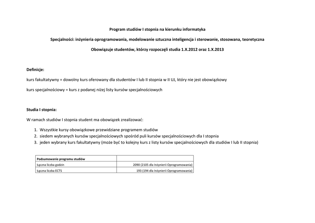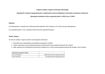 Program studiów I stopnia na kierunku informatyka Specjalności: inżynieria oprogramowania, modelowanie sztuczna inteligencja i sterowanie, stosowana, teoretyczna Obowiązuje studentów, którzy rozpoczęli studia 1.X.2012 oraz 1.X.2013 Definicje: kurs fakultatywny = dowolny kurs oferowany dla studentów I lub II stopnia w II UJ, który nie jest obowiązkowy kurs specjalnościowy = kurs z podanej niżej listy kursów specjalnościowych Studia I stopnia: W ramach studiów I stopnia student ma obowiązek zrealizować: 1. Wszystkie kursy obowiązkowe przewidziane programem studiów 2. siedem wybranych kursów specjalnościowych spośród puli kursów specjalnościowych dla I stopnia 3. jeden wybrany kurs fakultatywny (może być to kolejny kurs z listy kursów specjalnościowych dla studiów I lub II stopnia) Podsumowanie programu studiów Łączna liczba godzin Łączna liczba ECTS 2090 (2105 dla Inżynierii Oprogramowania) 193 (194 dla Inżynierii Oprogramowania) Lista kursów specjalnościowych Inżynieria Oprogramowania Modelowanie, sztuczna inteligencja i sterowanie Informatyka Stosowana Informatyka teoretyczna I stopień 1. 1. Bezpieczeństwo systemów komputerowych Programowanie w sieci Internet Modelowanie i symulacja komputerowa Podstawy systemów sztucznej inteligencji Układy sterujące Równania różniczkowe zwyczajne i układy dynamiczne Programowanie rozproszone Wprowadzenie do kognitywistyki 1. 1. Matematyczne modelowanie i teoria optymalnego sterowania Metody optymalizacji Metody sztucznej inteligencji Wizja komputerowa Sieci neuronowe 9. 10. 11. 12. 13. 2. 3. 4. 5. 6. 7. 8. Bezpieczeństwo systemów komputerowych Programowanie w sieci Internet Modelowanie obiektowe Wzorce projektowe Testowanie oprogramowania Programowanie współbieżne Programowanie abstrakcyjne Programowanie systemów mobilnych 2. 3. 4. 5. 6. 7. 8. II stopień (lista z I stopnia jest rozszerzona o dodatkowe kursy) 9. Obliczalność i złożoność 10. Programowanie funkcyjne 11. Programowanie niskopoziomowe 12. Programowanie rozproszone 13. Programowanie w logice 14. Rozproszone bazy danych 9. 10. 11. 12. 13. 2. 3. 4. 5. 6. 7. 8. Bezpieczeństwo systemów komputerowych Programowanie w sieci Internet Modelowanie i symulacja komputerowa Układy sterujące Programowanie systemów mobilnych Testowanie oprogramowania Wzorce projektowe Modelowanie obiektowe Grafika komputerowa Programowanie współbieżne Programowanie rozproszone Programowanie funkcyjne Programowanie niskopoziomowe 14. Metody sztucznej inteligencji 15. Przetwarzanie i rozpoznawanie obrazów 16. Obliczalność i złożoność 2. 3. 4. 5. 6. 7. 8. Bezpieczeństwo systemów komputerowych Programowanie w sieci Internet Obliczalność i złożoność Kryptologia Wprowadzenie do kognitywistyki Funkcje tworzące Testowanie oprogramowania Wybrane zagadnienia teorii grafów 9. Matematyka dyskretna 10. Programowanie funkcyjne 11. Wybrane zagadnienia dynamiki symbolicznej i jej modele 12. Teoria informacji 13. Kody i kaflowanie 14. Geometria obliczeniowa z zastosowaniami I ROK STUDIÓW Semestr 1 1 Algebra liniowa z geometrią 1 Forma zajęć w + ćw O Forma zaliczenia zaliczenie 2 Organizacja i architektura komputerów w + lab O 3 Programowanie 1 w + lab 4 Wstęp do informatyki 5 Wstęp do teorii mnogości 6 Szkolenie BHP 7 Wychowanie fizyczne lp. Moduł kształcenia O/F Wykłady Ćwiczenia ECTS 30 30 0 egzamin 30 30 6 O zaliczenie 30 45 0 w + lab O egzamin 30 30 6 w + ćw O egzamin 30 30 6 w O zaliczenie ćw O zaliczenie Razem 0 150 30 1 165 19 315 Semestr 2 1 Algebra liniowa z geometrią 2 Forma zajęć w + ćw O Forma zaliczenia egzamin 2 Analiza matematyczna 1 w + ćw O 3 Metody programowania w + lab 4 Programowanie 2 5 6 lp. Moduł kształcenia O/F Wykłady Ćwiczenia ECTS 30 30 10 zaliczenie 30 45 6 O egzamin 30 30 6 w + lab O egzamin 30 45 11 Systemy operacyjne w + lab O egzamin 30 45 7 Wychowanie fizyczne ćw O zaliczenie 30 1 150 225 41 Razem 375 II ROK STUDIÓW Semestr 3 Moduł kształcenia Forma zajęć O/F Forma zaliczenia 1 Analiza matematyczna 2 w + ćw O egzamin 30 45 7 2 Algorytmy i struktury danych w + lab O egzamin 30 45 7 3 Wstęp do matematyki dyskretnej w + ćw O egzamin 45 60 8 4 Bazy danych w + lab O egzamin 30 45 7 5 Język obcy lek F zaliczenie 60 2 255 31 lp. Razem Wykłady Ćwiczenia ECTS 135 390 Semestr 4 Inżynieria oprogramowania Forma zajęć w + lab O Forma zaliczenia egzamin Rachunek prawdopodobieństwa i statystyka w + ćw O 3 Sieci komputerowe w + lab 4 Teoria języków i automatów 5 Metody numeryczne 6 Język obcy lp. 1 2 Moduł kształcenia Razem O/F Wykłady Ćwiczenia ECTS 30 45 7 egzamin 30 30 6 O egzamin 30 30 6 w + ćw O egzamin 30 30 6 w + lab O egzamin 30 30 6 lek F zaliczenie 60 2 225 33 150 375 III ROK STUDIÓW Semestr 5 lp. Moduł kształcenia 1 Wykład specjalnościowy 1 2 Wykład specjalnościowy 2 3 Wykład specjalnościowy 3 4 Wykład specjalnościowy 4 5 Projekt zespołowy 1 6 Filozofia lub Psychologia 7 Język obcy 8 Zarządzanie Projektami IT* Forma zajęć w + lab F Forma zaliczenia egzamin w + ćw F w + lab F w + lab O/F Wykłady Ćwiczenia ECTS 30 30 6 egzamin 30 30 6 egzamin 30 30 6 F egzamin 30 30 6 lab O zaliczenie 15 2 w + ćw F zaliczenie 30 4 lek F egzamin 60 2 wykład O egzamin Razem 30 15 150 1 225 32 375 * - kurs tylko dla specjalności Inżynieria Oprogramowania Semestr 6 1 Wykład specjalnościowy 5 Forma zajęć w + ćw F Forma zaliczenia egzamin 2 Wykład specjalnościowy 6 3 Wykład specjalnościowy 7 w + ćw F w + ćw F 4 Projekt zespołowy 2 lab O zaliczenie 5 Wykład fakultatywny w + ćw F egzamin 30 6 Ochrona własności intelektualnej w O zaliczenie 5 7 Praktyki O zaliczenie 8 Praca licencjacka i egzamin licencjacki O egzamin lp. Moduł kształcenia Razem (bez praktyk) O/F Wykłady Ćwiczenia ECTS 30 30 6 egzamin 30 30 6 egzamin 30 30 6 15 2 30 6 1 90 0 10 125 260 135 37