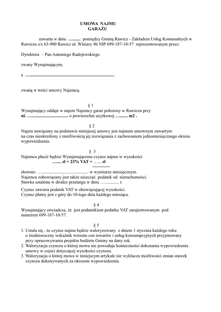 UMOWA NAJMU GARAŻU zawarta w dniu …....... pomiędzy Gminą Rawicz - Zakładem Usług Komunalnych w Rawiczu z/s 63-900 Rawicz ul. Winiary 4b NIP 699-187-10-57 reprezentowanym przez: Dyrektora – Pan Antoniego Radojewskiego zwany Wynajmującym, a …............................................................................ zwaną w treści umowy Najemcą. §1 Wynajmujący oddaje w najem Najemcy garaż położony w Rawiczu przy ul. …................................. o powierzchni użytkowej …....... m2 . §2 Najem nawiązany na podstawie niniejszej umowy jest najmem umownym zawartym na czas nieokreślony z możliwością jej rozwiązania z zachowaniem jednomiesięcznego okresu wypowiedzenia. § 3 Najemca płacić będzie Wynajmującemu czynsz najmu w wysokości ….... zł + 23% VAT = …... zł ======= słownie: ….......................................... w wymiarze miesięcznym. Najemca zobowiązany jest także uiszczać podatek od nieruchomości. Stawka ustalona w drodze przetargu w dniu …............. r. Czynsz zawiera podatek VAT w obowiązującej wysokości. Czynsz płatny jest z góry do 10-tego dnia każdego miesiąca. §4 Wynajmujący oświadcza, że jest podatnikiem podatku VAT zarejestrowanym pod numerem 699-187-10-57. §5 1. Ustala się , że czynsz najmu będzie waloryzowany z dniem 1 stycznia każdego roku o średnioroczny wskaźnik wzrostu cen towarów i usług konsumpcyjnych przyjmowany przy opracowywaniu projektu budżetu Gminy na dany rok. 2. Waloryzacja czynszu o której mowa nie powoduje konieczności dokonania wypowiedzenia umowy w części dotyczącej wysokości czynszu. 3. Waloryzacja o której mowa w niniejszym artykule nie wyklucza możliwości zmian stawek czynszu dokonywanych za okresem wypowiedzenia. §6 1. Najemca obowiązany jest korzystać z przedmiotu najmu zgodnie z jego przeznaczeniem oraz dokonywać jego konserwacji i remontów bieżących. 2. Najemca nie ma prawa oddawania przedmiotu najmu w podnajem lub do bezpłatnego korzystania osobom trzecim. §7 Strony zgodnie ustalają, że po zakończeniu najmu Wynajmujący nie będzie zwracał kosztów i nakładów poniesionych przez Najemcę na wprowadzenie ulepszeń w lokalu. §8 1. Wynajmujący zastrzega sobie możliwość rozwiązania umowy najmu bez zachowania okresu wypowiedzenia jeżeli Najemca: 1/ zalega z czynszem przez co najmniej dwa pełne okresy płatności, 2/ dopuszcza się naruszenia innych istotnych postanowień umowy, 3/ używa przedmiotu umowy niezgodnie z przeznaczeniem. 2. W razie zaistnienia okoliczności, o których mowa w ust. 1 Najemca obowiązany jest opuścić i opróżnić przedmiot najmu w terminie wskazanym przez Wynajmującego. §9 W sprawach nieuregulowanych niniejszą umową mają zastosowanie przepisy kodeksu cywilnego. § 10 Spory mogące wyniknąć na tle niniejszej umowy rozstrzyga Sąd Rejonowy w Rawiczu. § 11 Umowa została sporządzona w dwóch jednobrzmiących egzemplarzach po 1 dla każdej ze stron. WYNAJMUJĄCY NAJEMCA .................................... .......................................