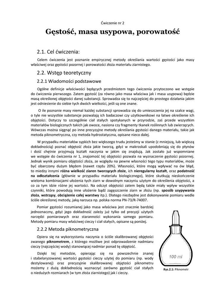 Ćwiczenie nr 2 Gęstość, masa usypowa, porowatość 2.1. Cel ćwiczenia: Celem ćwiczenia jest poznanie empirycznej metody określania wartości gęstości jako masy właściwej oraz gęstości pozornej i porowatości złoża materiału ziarnistego. 2.2. Wstęp teoretyczny 2.2.1 Wiadomości podstawowe Ogólne definicje właściwości będących przedmiotem tego ćwiczenia przytoczono we wstępie do ćwiczenia pierwszego. Zatem gęstość (za równo jako masa właściwa jak i masa usypowa) będzie masą określonej objętości danej substancji. Sprowadza się to najczęściej do prostego działania jakim jest odniesienie do siebie tych dwóch wielkości, jeśli są one znane. O ile poznanie masy niemal każdej substancji sprowadza się do umieszczenia jej na szalce wagi, o tyle nie wszystkie substancje pozwalają ich badaczowi czy użytkownikowi na łatwe określenie ich objętości. Dotyczy to szczególnie ciał stałych spotykanych w przyrodzie, zaś przede wszystkim materiałów biologicznych takich jak owoce, nasiona czy fragmenty tkanek roślinnych lub zwierzęcych. Wówczas można sięgnąć po inne precyzyjne metody określania gęstości danego materiału, takie jak metoda piknometryczna, czy metoda hydrostatyczna, opisane nieco dalej. W przypadku materiałów sypkich bez większego trudu jesteśmy w stanie (z mniejszą, lub większą dokładnością) poznać objętość złoża jakie tworzą, gdyż w makroskali upodobniają się do płynów i dość chętnie przyjmują kształt naczynia w jakim się znajdują. Jak zostało już wspomniane we wstępie do ćwiczenia nr 1, znajomość tej objętości pozwala na wyznaczenie gęstości pozornej. Jednak wynik pomiaru objętości złoża, ze względu na pewne własności tego typu materiałów, może być obarczony dużym błędem (nawet rzędu 20%). Własności, które mogą wpływać na ów błąd, to miedzy innymi różna wielkość ziaren tworzących złoże, ich nieregularny kształt, oraz podatność na odkształcenia (głównie w przypadku materiału biologicznego), które skutkują nieskończenie wieloma kombinacjami ułożenia tych ziarn w dowolnym naczyniu użytym do określenia objętości, a co za tym idzie różne jej wartości. Na odczyt objętości zatem będą także miały wpływ wszystkie czynniki, które powodują inne ułożenie bądź zagęszczenie ziarn w złożu (np. sposób usypywania złoża, wstrząsy, obciążenie całej warstwy itp.). Dlatego niezbędne jest dokonywanie pomiaru wedle ściśle określonej metody, jaką narzuca np. polska norma PN-73/R-74007. Pomiar gęstości rozumianej jako masa właściwa jest znacznie bardziej jednoznaczny, gdyż jego dokładność zależy już tylko od precyzji użytych narzędzi pomiarowych oraz staranności wykonania samego pomiaru. Metody pomiaru masy właściwej cieczy i ciał stałych, opisane są poniżej. 2.2.2 Metoda piknometryczna Opiera się na wykorzystaniu naczynia o ściśle skalibrowanej objętości zwanego piknometrem, z którego możliwe jest odprowadzenie nadmiaru cieczy (najczęściej wody) stanowiącej nadmiar ponad tę objętość. Dzięki tej metodzie, opierając się na powszechnie znanej i stabelaryzowanej wartości gęstości cieczy użytej do pomiaru (np. wody destylowanej) oraz precyzyjnie skalibrowanej objętości piknometru możemy z dużą dokładnością wyznaczyć zarówno gęstość ciał stałych o niedużych rozmiarach (w tym złoża ziarnistego) jak i cieczy. Rys.2.1: Piknometr Aby otrzymać wartość gęstość badanej substancji należy: a) w przypadku cieczy: I. zważyć suchy piknometr, II. zważyć piknometr wypełniony badaną cieczą, III. posłużyć się poniższą formułą: m ps−m p Vp s= gdzie: (1) ρs – gęstość badanej substancji (cieczy) [kg/m3], [g/dm3], mps – masa piknometru z badaną substancją (cieczą) [g], mp – masa pustego i suchego piknometru [g], Vp – objętość piknometru [dm3], b) w przypadku ciała stałego lub materiału sypkiego: I. zważyć suchy piknometr, II. zważyć piknometr wypełniony cieczą o znanej gęstości (np. wodą destylowaną) w danej temperaturze, III. do wody włożyć (wsypać) badaną substancję pozwalając na wypłynięcie nadmiaru wody oraz wszelkich pęcherzyków powietrza, IV. zważyć piknometr z wodą i badaną substancją, III. posłużyć się poniższą formułą: s= gdzie: ms ⋅ m s m pw −m ps w (2) ρw – znana gęstość cieczy (np. wody) w temperaturze pomiaru [kg/m 3], [g/dm3], mpw – masa piknometru z cieczą o znanej gęstości (np. wodą) [g], 2.2.3 Metoda hydrostatyczna Opiera się ona podobnie jak metoda piknometryczna na prawie Archimedesa, wg którego ciecz oddziałuje na zanurzone w niej ciało z siłą równą ciężarowi wypartej przez nie wody zaś skierowaną przeciwnie. Siła ta określana jest mianem siły wyporu. Wynika z tego, zależność (3) oraz jej dalsze przekształcenie: F w=m s −m sw ⋅g=w (3) m s −m sw ⋅g=m w⋅g (4) m s −m sw =w⋅V w (5) Wiadomo, że: s= ms Vs (6) Jako, że do powodzenia tej metody konieczne jest całkowite zanurzenie badanego ciała, to: V s=V w=V (7) Stąd, wyznaczając objętość z formuły (5) i podstawiając ją do równania (6) otrzymujemy: s= gdzie: ms ⋅ m s−m sw w (8) Fw – siła wyporu działająca na ciało [N], γw – ciężar wypartej cieczy (wody) [N], Vw – objętość wypartej cieczy (wody) [m3], Vs – objętość badanej substancji [m3], mw – masa wypartej cieczy (wody) [g], msw – masa ciała zważonego w wodzie [g], Zaznaczyć należy, że w przypadku ciał stałych do obu metod wyznaczania ich gęstości należy dobrać taką ciecz, w której nie zachodzi ich rozpuszczanie ani nasiąkanie tą cieczą. 2.2.4 Porowatość Jak wspomniano we wstępie do ćwiczenia 1, jest to parametr mówiący o ilości pustych przestrzeni w strukturze materiału lub między jego ziarnami. Ściślej rzecz ujmując, jest to stosunek objętości porów do objętości całego materiału: P= gdz