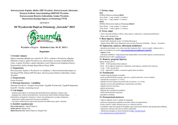 Stowarzyszenie Pepisko, Hufiec ZHP Wyszków, Stowarzyszenie Alternator, Drużyna Futbolu Amerykańskiego RHINOS Wyszków, Stowarzyszenie Bractwo Zabrodzkie, Gmina Wyszków, Mazowiecka Komisja Imprez na Orientację PTTK zapraszają na III Wyszkowski Rajd na Orientację „Szwenda” 2015 7. Forma, etapy BnO FORMA: Bieg na orientację (BnO) Trasa 20 km - 1 etap, zespoły 1-2 osobowe Trasa 7 km – 1 etap, zespoły 1-3 osobowe RJnO FORMA: Rowerowa Jazda na Orientację (RJnO) Trasa 50 km - 1 etap, zespoły 1-2 osobowe Trasa 20 km – 1 etap, zespoły 1-3 osobowe 8. Teren, mapy - Teren: zalesiona dzielnica willowa, leśny, łęgowy, nadrzeczny o zmiennej przebieżności. - Mapy: pełne topograficzne 9. Baza imprezy, dojazd - Zespół Szkół „Rybienko Leśne” ul. Stefana Batorego 6 - dojazd własny (PKP stacja Rybienko Leśne na trasie Warszawa Wileńska – Tłuszcz – Wyszków) 10. Zgłoszenia, wpisowe, informacje dodatkowe Wyszków n/Bugiem – Rybienko Leśne 04. 07. 2015 r. - zgłoszenia zawierające: m.in. imię, nazwisko, kategorię, klub – nazwa zespołu / miejscowość, email, tel. kontaktowy na stronie www.orienteering.waw.pl/pl/entry/team/275 - wpisowe: brak, - informacje dodatkowe będą przyjmowane bezpośrednio u kierownika imprezy za pomocą poczty elektronicznej na adres: [email protected] Regulamin 1.Termin i miejsce Rajd na orientację odbędzie się w dniu 04. 07. 2015 r. (sobota) w Wyszkowie n/Bugiem (Rybienko Leśne) w gminie Wyszków (woj. mazowieckie), na terenie osiedla Rybienko Leśne, w gminie Wyszków i gminie Zabrodzie, Lasów Państwowych kompleksu Puszczy Kamienieckiej, Doliny Dolnego Bugu (Obszar Natura 2000) 2. Organizator Stowarzyszenie Pepisko w Wyszkowie we współpracy z: Mazowiecką Komisją Imprez na Orientację PTTK, Hufcem ZHP Wyszków, Stowarzyszeniem Bractwo Zabrodzkie, Gminą Wyszków. 3. Finansowanie Gmina Wyszków. 4. Patronat honorowy i medialny Burmistrz Wyszkowa - Grzegorz Nowosielski. Tygodnik Wyszkowiak, Tygodnik Regionalny KurierW, Viscobar, orientering.waw.pl 5. Cele Rajdu - popularyzacja imprez na orientację jako doskonałej formy spędzania wolnego czasu, - propagowanie walorów przyrodniczych i turystycznych okolic (Dolina Dolnego Bugu), doskonalenie umiejętności orientacji w terenie oraz posługiwania się mapą i kompasem, - podnoszenie ogólnej sprawności fizycznej uczestników, - rozwijanie zamiłowania do uprawiania turystyki kwalifikowanej, sportu i rekreacji. 6. Komitet organizacyjny Kierownik imprezy: Marek Filipowicz Sędzia główny: Bogdan Osik Budowniczowie tras: Marek Filipowicz, Bogdan Osik - 11. Ramowy program imprezy Sobota, 04 lipca 2015 r. - 09.00 – 10.30 rejestracja (baza imprezy) -10.30 – 10.55 odprawa techniczna, wyjaśnienie zasad imprezy, ustalenie listy startowej, - 11.00 – 15.00 zawody InO, - 15.45 – ogłoszenie wyników, wręczenie nagród, (baza zawodów) 12. Świadczenia - komplet map dla każdego uczestnika, - gorący posiłek (kiełbasa na gorąco, pieczywo, ogórek małosolny, owoce, kompot), - statuetki dla zwycięzców (1 x 4 kat.), - nagrody rzeczowe (sprzęt turystyczny) dla zwycięzców (3 x 4 kat), - nagrody rzeczowe dla najmłodszego i najstarszego uczestnika, - nagrody rzeczowe losowane, - gadżety promocyjne, - dyplomy dla wszystkich uczestników, - odcisk okolicznościowej pieczęci, - pamiątkowa naklejka, 13. Postanowienia końcowe - impreza odbędzie się bez względu na niepogodę, - ostateczna interpretacja regulaminu zawodów należy do organizatorów, - biorący udział w rajdzie ubezpieczają się we własnym zakresie, - uczestników rajdu obowiązuje bezwzględny zakaz spożywania alkoholu, pod groźbą dyskwalifikacji, - organizator zastrzega sobie prawo zmiany regulaminu, - aktualizacje dostępne na stronie Internetowej http://viscobar.cba.pl/, www.orienteering.waw.pl/pl/node/2618