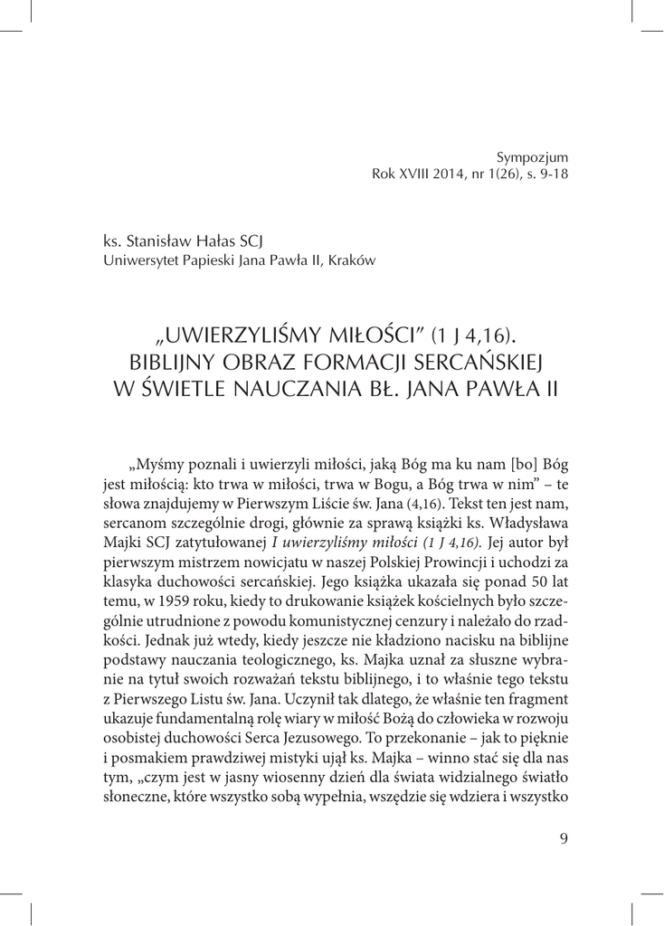 Sympozjum Rok XVIII 2014, nr 1(26), s. 9-18 ks. Stanisław Hałas SCJ Uniwersytet Papieski Jana Pawła II, Kraków „UWIERZYLIŚMY MIŁOŚCI” (1 J 4,16). BIBLIJNY OBRAZ FORMACJI SERCAŃSKIEJ W ŚWIETLE NAUCZANIA BŁ. JANA PAWŁA II „Myśmy poznali i uwierzyli miłości, jaką Bóg ma ku nam [bo] Bóg jest miłością: kto trwa w miłości, trwa w Bogu, a Bóg trwa w nim” – te słowa znajdujemy w Pierwszym Liście św. Jana (4,16). Tekst ten jest nam, sercanom szczególnie drogi, głównie za sprawą książki ks. Władysława Majki SCJ zatytułowanej I uwierzyliśmy miłości (1 J 4,16). Jej autor był pierwszym mistrzem nowicjatu w naszej Polskiej Prowincji i uchodzi za klasyka duchowości sercańskiej. Jego książka ukazała się ponad 50 lat temu, w 1959 roku, kiedy to drukowanie książek kościelnych było szczególnie utrudnione z powodu komunistycznej cenzury i należało do rzadkości. Jednak już wtedy, kiedy jeszcze nie kładziono nacisku na biblijne podstawy nauczania teologicznego, ks. Majka uznał za słuszne wybranie na tytuł swoich rozważań tekstu biblijnego, i to właśnie tego tekstu z Pierwszego Listu św. Jana. Uczynił tak dlatego, że właśnie ten fragment ukazuje fundamentalną rolę wiary w miłość Bożą do człowieka w rozwoju osobistej duchowości Serca Jezusowego. To przekonanie – jak to pięknie i posmakiem prawdziwej mistyki ujął ks. Majka – winno stać się dla nas tym, „czym jest w jasny wiosenny dzień dla świata widzialnego światło słoneczne, które wszystko sobą wypełnia, wszędzie się wdziera i wszystko 9 ks. Stanisław Hałas SCJ opromienia”. Z kolei „to wyobrażenie o miłości Boskiego Serca Jezusowego doprowadzi nas, i to niemal jako psychologiczna konieczność, do wzajemnej miłości Chrystusa”1. Uzasadnieniu tego przekonania poświęcił w szczególności drugi paragraf pierwszego rozdziału swojej książki i zatytułował go: Znaczenie wiary w miłość dla naszego życia wewnętrznego2. Janowy tekst o wierze w miłość Bożą jest rzeczywiście bardzo wymowny i w pewien sposób streszcza nauczanie zarówno Ewangelii Jana jak i jego listów. Mówi bowiem o miłości określonej greckim pojęciem avga,ph lub avgapa/n. Apostołowie poznali miłość i uwierzyli miłości avga,ph, bo przecież sam Bóg jest avga,ph i kto trwa w avga,ph, trwa w zjednoczeniu z samym Bogiem. Dziś, w świetle pogłębionej wiedzy egzegetycznej, możemy lepiej dowartościować znaczenie Janowego sformułowania. Przede wszystkim czasownik avgapa/n i rzeczownik avga,ph są bardzo charakterystyczne zarówno dla Ewangelii, jak i dla listów Janowych. Właśnie w nich występują najczęściej, bo aż 112 razy (44 razy w Ewangelii, aż 52 razy w jego Pierwszym Liście i 10 razy w dwóch pozostałych), i wyróżniają się największą liczbą tych słów spośród wszystkich ksiąg biblijnych3. Ale jeszcze ważniejsza jest funkcja tego greckiego pojęcia, którym Autor określa wszystkie relacje religijne między Bogiem, jego Synem i chrześcijanami, nazywanymi dziećmi Boga (te,kna tou/ qeou/) i określanymi często jako umiłowani, avgaphtoi,. Zresztą sam Bóg jest też najczęściej określany jako Ojciec, co wskazuje na miłość typową dla domu rodzinnego4. Widać to najlepiej w Janowej Ewangelii, w której avgapa/n określa zarówno miłość Ojca do Syna (J 3,35; 10,17; 15,9; 17,23 n. 26), jak do chrześcijan (J 14,21.23; 17,23), a nawet wszystkich ludzi (J 3,165). 1 W. Majka, I uwierzyliśmy miłości (1 J 4,16), Warszawa 1959, s. 12 n. Tamże, s. 14. 3 Nie licząc zbioru wszystkich 150 psalmów łącznie. W całej Biblii występuje ono we wszystkich księgach w sumie 625 razy. 4 Por. J. Drgas, „Kto Mnie zobaczył, zobaczył także i Ojca” (J14,9). Bóg Ojciec w Ewangelii Janowej, w: Ty, Panie, jesteś naszym Ojcem (Iz 64,7). Biblia o Bogu Ojca, F. Mickiewicz, J. Warzecha (red.), Warszawa 1999, s. 115 n. 5 Jan używa tu określenia ko,smoj (= świat), które wskazuje wszystkich ludzi, nie tylko chrześcijan. 2 10 „Uwierzyliśmy miłości" (1 J 4,16). Biblijny obraz formacji sercańskiej… Określa także miłość Syna zarówno do Ojca (J 14,31; 15,10) jak i do swoich uczniów (J 13,1.34; 14,21; 15,9.12). W szczególności określa więź łączącą Jezusa z umiłowanym uczniem (J 13,23; 19,26; 21,7.20), a także wymóg postawiony Piotrowi jako pasterzowi Kościoła, aby miłował swego Mistrza (J 21,15 n.). Określa wreszcie miłość wzajemną chrześcijan między sobą (J 13,34 n.; 15,12.17), a także ich więź z Synem (J 14,15.21.23 n. 28). Tak więc pojęcie avga,ph określa w Ewangelii Janowej właściwie wszystkie możliwe typy relacji religijnych dotyczących zarówno Boga jako Ojca, Jezusa jako Syna oraz chrześcijan jako dzieci. Z kolei Pierwszy List św. Jana jest w pełni skoncentrowany na braterskiej miłości chrześcijan (1 J 2,10.15; 3,11.14.18.23; 4,7.11.12.19.21; 5,1), która wynika z miłości Ojca do nich (1 J 3,1; 4,9-11.16.19; 4,9.10.11.16.19). Jest jej inspiracją i źródłem. Jest z nią tak ściśle powiązana, że bez miłości braterskiej niemożliwa jest miłość chrześcijan do Ojca (1 J 4,7 n., 11 n., 20 n.; 5,1 n.). Nasz tekst z Pierwszego Listu św. Jana stwierdza, że środowisko apostolskie, które wysyła list, poznało i uwierzyło (evgnw,kamen kai. pepisteu,kamen – 4,16). Okazuje się, że takie połączenie poznania i wiary jest również bardzo typowe i charakterystyczne dla pism Janowych. Oprócz analizowanego przez nas tekstu występuje ono także kilkakrotnie w Janowej Ewangelii. Najpierw chodzi o urzędnika królewskiego, który zrozumiał (e;gnw – J 4,53), że jego syn został uzdrowiony dokładnie w tym czasie, kiedy rozmawiał z Jezusem, i dlatego uwierzył. Apostołowie uwierzyli i poznali (pepisteu,kamen kai. evgnw,kamen – J 6,69), że Jezus jest wysłannikiem Bożym. W końcowej modlitwie Jezus dziękuje za zrozumienie uczniów (e;gnwsan – J 17,8), że przysz