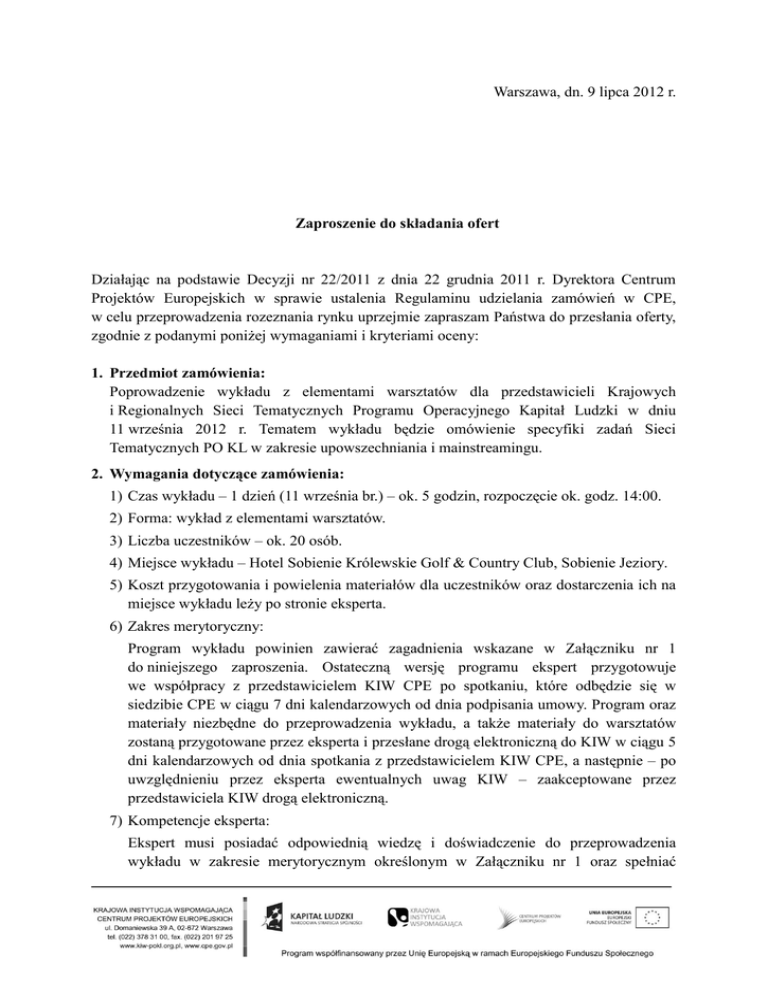 Warszawa, dn. 9 lipca 2012 r. Zaproszenie do składania ofert Działając na podstawie Decyzji nr 22/2011 z dnia 22 grudnia 2011 r. Dyrektora Centrum Projektów Europejskich w sprawie ustalenia Regulaminu udzielania zamówień w CPE, w celu przeprowadzenia rozeznania rynku uprzejmie zapraszam Państwa do przesłania oferty, zgodnie z podanymi poniżej wymaganiami i kryteriami oceny: 1. Przedmiot zamówienia: Poprowadzenie wykładu z elementami warsztatów dla przedstawicieli Krajowych i Regionalnych Sieci Tematycznych Programu Operacyjnego Kapitał Ludzki w dniu 11 września 2012 r. Tematem wykładu będzie omówienie specyfiki zadań Sieci Tematycznych PO KL w zakresie upowszechniania i mainstreamingu. 2. Wymagania dotyczące zamówienia: 1) Czas wykładu – 1 dzień (11 września br.) – ok. 5 godzin, rozpoczęcie ok. godz. 14:00. 2) Forma: wykład z elementami warsztatów. 3) Liczba uczestników – ok. 20 osób. 4) Miejsce wykładu – Hotel Sobienie Królewskie Golf & Country Club, Sobienie Jeziory. 5) Koszt przygotowania i powielenia materiałów dla uczestników oraz dostarczenia ich na miejsce wykładu leży po stronie eksperta. 6) Zakres merytoryczny: Program wykładu powinien zawierać zagadnienia wskazane w Załączniku nr 1 do niniejszego zaproszenia. Ostateczną wersję programu ekspert przygotowuje we współpracy z przedstawicielem KIW CPE po spotkaniu, które odbędzie się w siedzibie CPE w ciągu 7 dni kalendarzowych od dnia podpisania umowy. Program oraz materiały niezbędne do przeprowadzenia wykładu, a także materiały do warsztatów zostaną przygotowane przez eksperta i przesłane drogą elektroniczną do KIW w ciągu 5 dni kalendarzowych od dnia spotkania z przedstawicielem KIW CPE, a następnie – po uwzględnieniu przez eksperta ewentualnych uwag KIW – zaakceptowane przez przedstawiciela KIW drogą elektroniczną. 7) Kompetencje eksperta: Ekspert musi posiadać odpowiednią wiedzę i doświadczenie do przeprowadzenia wykładu w zakresie merytorycznym określonym w Załączniku nr 1 oraz spełniać łącznie wszystkie poniższe wymagania (spełnianie wymagań będzie oceniane metodą spełnia/nie spełnia): a) ekspert musi posiadać doświadczenie w zakresie realizacji działań upowszechniających i włączających prowadzonych w ramach projektu/projektów realizowanych w ramach IW EQUAL i/lub projektu/projektów innowacyjnych testujących w ramach PO KL; b) ekspert musi posiadać doświadczenie trenerskie potwierdzone przeprowadzeniem w ciągu ostatnich dwóch lat co najmniej 3 szkoleń z obszaru opisanego w lit. a); c) ekspert musi posiadać wiedzę na temat specyfiki pracy w administracji publicznej. 3. Składowe oferty oraz kryteria oceny ofert: Kompletna oferta powinna zawierać: CV eksperta wraz ze zgodą na przetwarzanie danych osobowych w celu wyboru wykonawcy usługi, o której mowa w pkt. 1 niniejszego zaproszenia, zgodnie z ustawą z dnia 29 sierpnia 1997 r. o ochronie danych osobowych (tekst jedn.: Dz. U. z 2002 r. Nr 101, poz. 926 z późn. zm.), kopie referencji oraz programów z przeprowadzonych szkoleń, propozycję programu wykładu z elementami warsztatowymi dla przedstawicieli KST i RST oraz całkowitą cenę brutto usługi. Oferty będą oceniane w następujący sposób: 1) doświadczenie eksperta w zakresie realizacji działań upowszechniających i włączających prowadzonych w ramach projektu/projektów realizowanych w ramach IW EQUAL i/lub projektu/projektów innowacyjnych testujących w ramach PO KL – oceniane będzie na podstawie informacji zawartych w CV (wymagane jest wskazanie w życiorysie co najmniej 1 projektu, w którego realizacji oferent brał udział w charakterze przedstawiciela projektodawcy lub prowadził doradztwo dla projektodawcy w zakresie realizacji projektu, ze wskazaniem zakresu zadań zrealizowanych w zakresie upowszechniania i mainstreamingu w ramach danego projektu); 2) doświadczenie trenerskie – oceniane będzie na podstawie informacji zawartych w CV oraz kopii referencji z przeprowadzonych szkoleń wraz z programami szkoleń (wymagane jest przedłożenie referencji potwierdzających przeprowadzenie co najmniej 3 szkoleń, a także dołączenie programów szkoleń potwierdzonych referencjami, z wyraźnym wskazaniem, których szkoleń dotyczą dołączone referencje i programy); 3) wiedza w zakresie specyfiki pracy w administracji publicznej – oceniana będzie na podstawie informacji zawartych w CV (wymagane jest wskazanie w życiorysie co najmniej 1 miejsca zatrudnienia w administracji publicznej lub wykonania co najmniej 1 doradztwa dla administracji publicznej); 4) propozycja programu wykładu z elementami warsztatów dla przedstawicieli KST i RST (ze wskazaniem elementów wykładowych i warsztatowych) – oceniany będzie stopień zgodności proponowanego programu z Załącznikiem nr 1 do niniejszego zaproszenia; 5) całkowita cena brutto usługi – za najkorzystniejszą zostanie uznana cena najniższa. Wszystkie oferty, które nie będą spełniały powyższych wymagań zostaną odrzucone. Propozycje ofertowe należy przesyłać wyłącznie pocztą elektroniczną do dnia 23 lipca 2012 r. na adres: [email protected] W przypadku dodatkowych pytań proszę o kontakt e-mailowy: [email protected] Na podstawie art. 24 ust. 1 ustawy z dnia 29 sierpnia 1997 roku o ochronie danych osobowych (Dz. U. z 2002 r. Nr 101, poz. 926 ze zm.) Centrum Projektów Europejskich z siedzibą w Warszawie przy ul. Domaniewskiej 39A, jako administrator danych osobowych informuje, iż Pani/Pana dane osobowe zawarte w CV oraz innych dokumentach wymaganych w niniejszym postępowaniu będą przetwarzane wyłącznie w celach związanych z przeprowadzeniem procesu wyboru eksperta. Przysługuje Pani/Panu prawo dostępu do treści swoich danych osobowych i ich poprawiania. Załącznik nr 1 do zaproszenia do składania ofert. Program wykładu z elementami warsztatów powinien obejmować: Blok nr 1. Wprowadzenie – krótkie przy