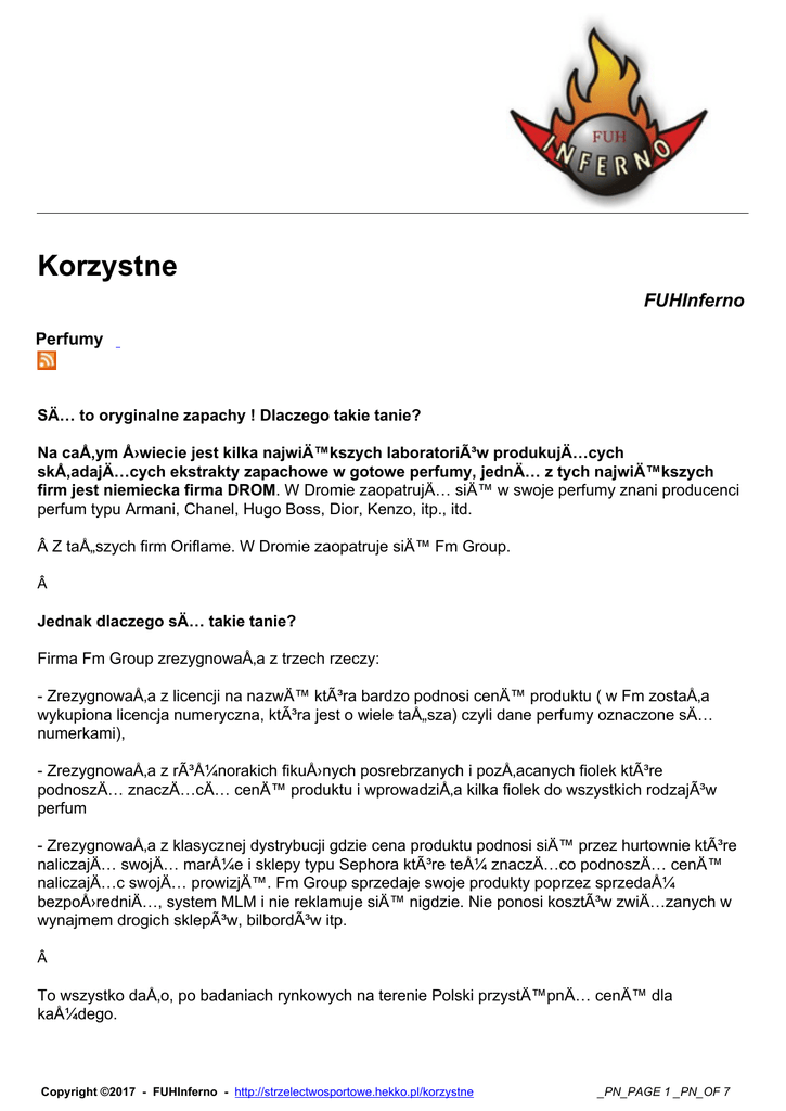 Korzystne FUHInferno Perfumy SÄ… to oryginalne zapachy ! Dlaczego takie tanie? Na caÅ‚ym Å›wiecie jest kilka najwiÄ™kszych laboratoriów produkujÄ…cych skÅ‚adajÄ…cych ekstrakty zapachowe w gotowe perfumy, jednÄ… z tych najwiÄ™kszych firm jest niemiecka firma DROM. W Dromie zaopatrujÄ… siÄ™ w swoje perfumy znani producenci perfum typu Armani, Chanel, Hugo Boss, Dior, Kenzo, itp., itd.  Z taÅ„szych firm Oriflame. W Dromie zaopatruje siÄ™ Fm Group.  Jednak dlaczego sÄ… takie tanie? Firma Fm Group zrezygnowaÅ‚a z trzech rzeczy: - ZrezygnowaÅ‚a z licencji na nazwÄ™ która bardzo podnosi cenÄ™ produktu ( w Fm zostaÅ‚a wykupiona licencja numeryczna, która jest o wiele taÅ„sza) czyli dane perfumy oznaczone sÄ… numerkami), - ZrezygnowaÅ‚a z różnorakich fikuÅ›nych posrebrzanych i pozÅ‚acanych fiolek które podnoszÄ… znaczÄ…cÄ… cenÄ™ produktu i wprowadziÅ‚a kilka fiolek do wszystkich rodzajów perfum - ZrezygnowaÅ‚a z klasycznej dystrybucji gdzie cena produktu podnosi siÄ™ przez hurtownie które naliczajÄ… swojÄ… marże i sklepy typu Sephora które też znaczÄ…co podnoszÄ… cenÄ™ naliczajÄ…c swojÄ… prowizjÄ™. Fm Group sprzedaje swoje produkty poprzez sprzedaż bezpoÅ›redniÄ…, system MLM i nie reklamuje siÄ™ nigdzie. Nie ponosi kosztów zwiÄ…zanych w wynajmem drogich sklepów, bilbordów itp.  To wszystko daÅ‚o, po badaniach rynkowych na terenie Polski przystÄ™pnÄ… cenÄ™ dla każdego. Copyright ©2017 - FUHInferno - http://strzelectwosportowe.hekko.pl/korzystne _PN_PAGE 1 _PN_OF 7 Esencja perfum jest taka sama, jakość również a o to przecież chodzi… Jakość widzi każdy kto raz zakupiÅ‚. Wszystkie odpowiedniki pod tym : linkiem . Damskie - perfumy 15ml 16.75 zÅ‚ [Szczegóły produktu...] Damskie Inspiracje FM - perfumy 30ml 33.50 zÅ‚ [Szczegóły produktu...] Copyright ©2017 - FUHInferno - http://strzelectwosportowe.hekko.pl/korzystne _PN_PAGE 2 _PN_OF 7 Damskie klasyczne - perfumy 30ml 33.50 zÅ‚ [Szczegóły produktu...] Damskie luksusowe - perfumy 50ml 54.75 zÅ‚ [Szczegóły produktu...] Kolekcja Kwiatowa - perfumy 50ml 54.75 zÅ‚ [Szczegóły produktu...] Copyright ©2017 - FUHInferno - http://strzelectwosportowe.hekko.pl/korzystne _PN_PAGE 3 _PN_OF 7 Copyright ©2017 - FUHInferno - http://strzelectwosportowe.hekko.pl/korzystne _PN_PAGE 4 _PN_OF 7 Kolekcja Owocowa - woda toaletowa 50ml 33.50 zÅ‚ [Szczegóły produktu...] MÄ™skie Inspiracje FM- woda perfumowana 50ml 33.50 zÅ‚ [Szczegóły produktu...] MÄ™skie klasyczne - woda perfumowana 50ml 33.50 zÅ‚ [Szczegóły produktu...] Copyright ©2017 - FUHInferno - http://strzelectwosportowe.hekko.pl/korzystne _PN_PAGE 5 _PN_OF 7 Copyright ©2017 - FUHInferno - http://strzelectwosportowe.hekko.pl/korzystne _PN_PAGE 6 _PN_OF 7 MÄ™skie luksusowe - woda perfumowana 100ml 54.75 zÅ‚ [Szczegóły produktu...] • • • • • «« Start « Poprzednia 1 NastÄ™pna » Koniec »» Wyniki 1 - 9 z 9 Copyright ©2017 - FUHInferno - http://strzelectwosportowe.hekko.pl/korzystne _PN_PAGE 7 _PN_OF 7