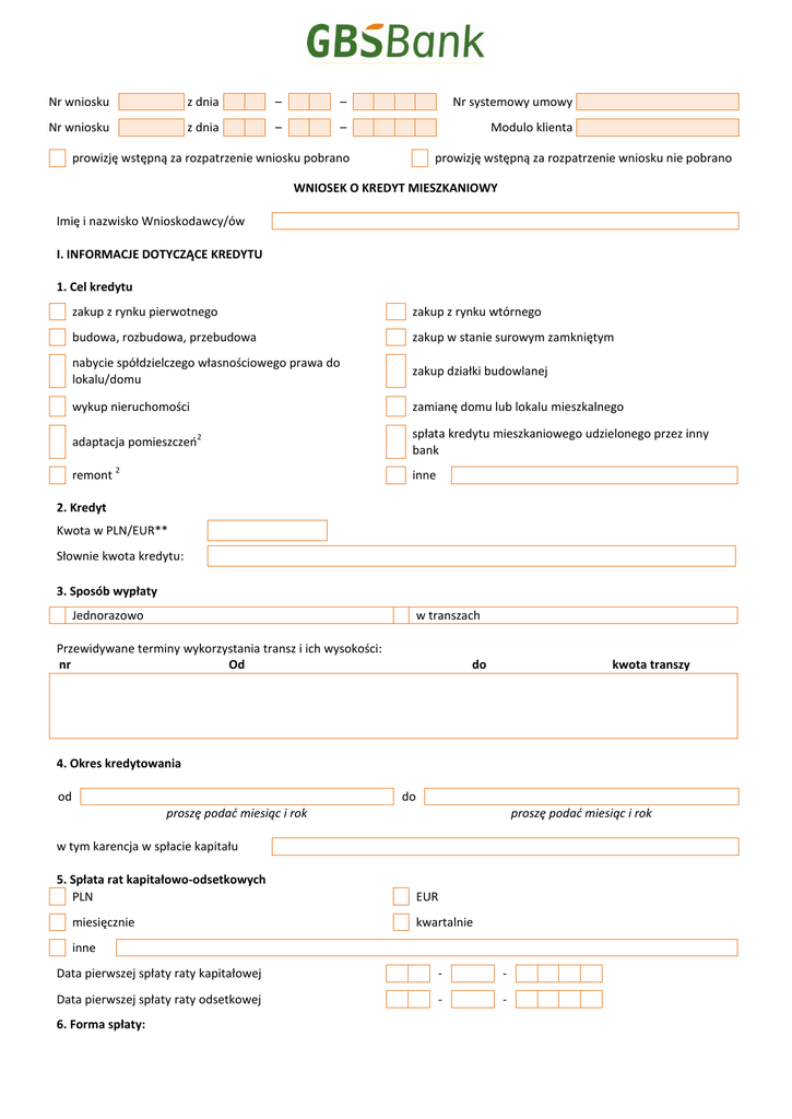 Nr wniosku z dnia – – Nr systemowy umowy Nr wniosku z dnia – – Modulo klienta prowizję wstępną za rozpatrzenie wniosku pobrano prowizję wstępną za rozpatrzenie wniosku nie pobrano WNIOSEK O KREDYT MIESZKANIOWY Imię i nazwisko Wnioskodawcy/ów I. INFORMACJE DOTYCZĄCE KREDYTU 1. Cel kredytu zakup z rynku pierwotnego zakup z rynku wtórnego budowa, rozbudowa, przebudowa zakup w stanie surowym zamkniętym nabycie spółdzielczego własnościowego prawa do lokalu/domu zakup działki budowlanej wykup nieruchomości zamianę domu lub lokalu mieszkalnego adaptacja pomieszczeń remont 2 2 spłata kredytu mieszkaniowego udzielonego przez inny bank inne 2. Kredyt Kwota w PLN/EUR** Słownie kwota kredytu: 3. Sposób wypłaty Jednorazowo w transzach Przewidywane terminy wykorzystania transz i ich wysokości: nr Od do kwota transzy 4. Okres kredytowania od do proszę podać miesiąc i rok proszę podać miesiąc i rok w tym karencja w spłacie kapitału 5. Spłata rat kapitałowo-odsetkowych PLN miesięcznie EUR kwartalnie inne Data pierwszej spłaty raty kapitałowej - - Data pierwszej spłaty raty odsetkowej - - 6. Forma spłaty: równe raty kapitałowe w całym okresie kredytowania i odsetki naliczane od kwoty zadłużenia równe raty w całym okresie kredytowania jako suma malejących rat odsetkowych i rosnących rat kapitałowych równe raty kapitałowe w okresach kwartalnych w całym okresie kredytowania i odsetki naliczane od kwoty zadłużenia 7. Propozycja prawnego zabezpieczenia spłaty kredytu Proponowane zabezpieczenie: hipoteka nieruchomości z wyceną poręczenie (wymienić kogo) cesja praw z ubezpieczenia na życie Kredytobiorcy – Umowa Indywidulanego Ubezpieczenia na życie Kredytobiorców cesja Umowy ubezpieczenia nieruchomości 1 1 weksel „in blanco” Kredytobiorcy wraz z wypełnioną deklaracją wekslową inne II. INFORMACJE DOTYCZĄCE PRZEDMIOTU KREDYTOWANIA 1. Nazwa przedsięwzięcia (dokładny opis przeznaczenia kredytu) 2. Całkowity koszt przedsięwzięcia budowa, remont – wg zestawienia kosztów i płatności zakup – wg umowy przedwstępnej/aktu notarialnego*** 3. Udział środków własnych Kwota PLN/EUR** (słownie) tj. % z tego: dotychczas poniesione i udokumentowane środki własne środki własne do uzupełnienia, pochodzące z Poziom wskaźnika LtV (wskaźnik wyrażający stosunek wartości kredytu do wartości nieruchomości) III. INFORMACJE DOTYCZĄCE WNIOSKODAWCÓW WNIOSKODAWCA I WNIOSKODAWCA II**** Imię / imiona Nazwisko Nazwisko rodowe Imiona rodziców Nazwisko rodowe matki Stan cywilny Małżeńska wspólność majątkowa Adres zamieszkania zamężna/żonaty panna/kawaler separacja tak nie wdowa/wdowiec rozwiedziony/a nie dotyczy zamężna/żonaty panna/kawaler separacja tak nie Ulica, nr domu/lokalu: Ulica nr domu/lokalu: Kod, miejscowość: Kod, miejscowość: Kraj: Kraj: wdowa/wdowiec rozwiedziony/a nie dotyczy Ulica, nr domu/lokalu: Ulica, nr domu/lokalu: adres do korespondencji jest Kod, miejscowość: Kod, miejscowość: inny niż adres zamieszkania) Kraj: Kraj: Nazwa: Nazwa: Seria i nr dokumentu: Seria i nr dokumentu: Wydany przez: Wydany przez: Data wydania: Data wydania: Stacjonarny: Stacjonarny: Komórkowy: Komórkowy: Adres do korespondencji (wypełnić w przypadku gdy Adres e-mail Cechy dokumentu tożsamości PESEL Nr telefonu Wykształcenie Toczy się wobec mnie postępowanie egzekucyjne Posiadam ROR Jestem członkiem GBS Banku wyższe magisterskie licencjat/inżynier średnie zasadnicze zawodowe podstawowe/gimnazjalne tak w sprawie: nie tak nie tak nie wyższe magisterskie licencjat/inżynier średnie zasadnicze zawodowe podstawowe/gimnazjalne tak w sprawie: nie tak nie tak nie INFORMACJE O DOCHODACH I WYDATKACH WNIOSKODAWCA I WNIOSKODAWCA II**** Miejsce zatrudnienia Okres zatrudnienia u obecnego pracodawcy / czas prowadzenia obecnej dział. gosp. w pełnych latach Całkowity staż pracy w pełnych latach Stanowisko właściciel firmy wyższa kadra zarządzająca średnia kadra zarządzająca urzędnik specjalista pracownik inne właściciel firmy wyższa kadra zarządzająca średnia kadra zarządzająca urzędnik specjalista pracownik inne Miesięczny dochód netto w PLN Źródła dochodu Ilość osób w gospodarstwie umowa o pracę emerytura renta zasiłek przedemerytalny wolne zawody działalność gospodarcza działalność rolnicza umowa cywilno-prawna umowa najmu umowa o pracę na czas określony inne umowa o pracę emerytura renta zasiłek przedemerytalny wolne zawody działalność gospodarcza działalność rolnicza umowa cywilno-prawna umowa najmu umowa o pracę na czas określony inne domowym (w tym na utrzymaniu) Miesięczne koszty utrzymania gospodarstwa domowego ( zapewniające zaspokojenie potrzeb mieszkalnych i żywieniowych, wychowanie potomstwa) Wnioskodawca I i Wnioskodawca II należą do tego samego gospodarstwa domowego Informacja o zobowiązaniach i poręczeniach Proszę wpisać kredyty i pożyczki udzielone Wnioskodawcy I / Współwnioskodawcy II Stan Nazwa banku / instytucji Miesięczna rata zadłużenia na Nazwa kredytu udzielającej poręczanego do spłaty dzień lub pożyczki kredytu (kapitał + odsetki) wypełniania wniosku Data wygaśnięcia zobowiązania Korzystający z kredytu lub z pożyczki (Wnioskodawca, Współwnioskodawca) Oświadczam, że podane wyżej informacje są autentyczne, kompletne i zgodne ze stanem faktycznym i prawnym. Proszę wpisać poręczenia udzielone przez Wnioskodawcę I / Współwnioskodawcę II Stan Nazwa banku Miesięczna rata zadłużenia na Data Poręczycielem jest udzielającego do spłaty dzień wygaśnięcia (Wnioskodawca, poręczanego (kapitał + odsetki) wypełniania zobowiązania Współwnioskodawca) kredytu/pożyczki wniosku Czy kredyt/pożyczka spłacany jest przez poręczyciela ? TAK / NIE* TAK / NIE* TAK / NIE* INFORMACJE O POSIADANYM MAJĄTKU (w przypadku majątku wspólnego wypełnia tylko Wnioskodawca I) WNIOSKODAWCA I Status własności samochodu włas