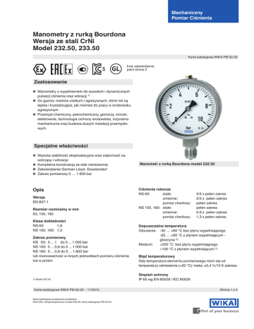 Mechaniczny Pomiar Ciśnienia Manometry z rurką Bourdona Wersja ze stali CrNi Model 232.50, 233.50 Karta katalogowa WIKA PM 02.02 Inne zatwierdzenia patrz strona 3 Zastosowanie ■■ Manometry z wypełnieniem do wysokich i dynamicznych pulsacji ciśnienia oraz wibracji 1) ■■ Do gazów, mediów ciekłych i agresywnych, które nie są lepkie i krystalizujące, jak również do pracy w środowisku agresywnym ■■ Przemysł chemiczny, petrochemiczny, górniczy, morski, elektrownie, technologia ochrony środowiska, inżynieria mechaniczna oraz budowa dużych instalacji przemysłowych Specjalne właściwości ■■ Wysoka stabilność eksploatacyjna oraz odporność na wstrząsy i wibracje ■■ Kompletna konstrukcja ze stali nierdzewnej ■■ Zatwierdzenie German LIoyd, Gosstandart Manometr z rurką Bourdona model 232.50 ■■ Zakres pomiarowy 0 … 1 600 bar Opis Wersja EN 837-1 Rozmiar nominalny w mm 63, 100, 160 Klasa dokładności NS 63: 1,6 NS 100, 160: 1,0 Zakres pomiarowy NS 63: 0 ... 1 do 0 ... 1 000 bar NS 100: 0 ... 0,6 do 0 ... 1 000 bar NS 160: 0 ... 0,6 do 0 ... 1.600 bar lub równoważność w innych jednostkach pomiaru ciśnienia lub w próżni 1) Model 233.50 Karta katalogowa WIKA PM 02.02 ∙ 11/2015 Karty katalogowe podobnych produktów: Stal CrNi, wersja bezpieczna; model 232.30; karta katalogowa PM 02.04 Ciśnienie robocze NS 63: stałe: zmienne: pomiar chwilowy: NS 100, 160: stałe: zmienne: pomiar chwilowy: 3/4 x pełen zakres 2/3 x pełen zakres pełen zakres pełen zakres 0,9 x pełen zakres 1,3 x pełen zakres Dopuszczalna temperatura Otoczenie: -40 … +60 °C bez płynu wypełniającego -20 … +60 °C z płynem wypełniającym - gliceryna 1) Medium: +200 °C bez płynu wypełniającego +100 °C z płynem wypełniającym 1) Błąd temperaturowy Gdy temperatura elementu pomiarowego różni się od temperatury odniesienia (+20 °C): maks. ±0,4 %/10 K zakresu Stopień ochrony IP 65 wg EN 60529 / lEC 60529 Strona 1 z 4 Wersja standardowa Manometr z rurką Bourdona Przyłącze procesowe Stal CrNi 316L (NS 63: 1.4571), Położenie gwintu: dolne lub tylne ekscentryczne, NS63 tylne centryczne NS 63: gwint zew G ¼ B, SW 14 NS 100, 160: gwint zew. G ½ B, SW 22 ■■ Inne przyłącza procesowe Element pomiarowy Stal CrNi 316L Sprężyna typu C lub heliakalnego ■■ Kołnierz przedni, Stal CrNi polerowana Mechanizm Stal CrNi Podzielnia Białe aluminum, czarna podzielnia NS 63 z wypustem ograniczającym Wskazówka Czarne aluminium Obudowa Stal CrNi, z zabezpieczeniem przeciwwybuchowym na godzinie 12 (NS 63) i z tyłu obudowy (NS 100 i 160), Zakres wskazań ≤ 0 ... 16 bar z zaworem kompensującym ■■ Uszczelki (model 910.17, patrz karta katalogowa AC 09.08) ■■ Montaż z separatorem patrz folder separatory ■■ System pomiarowy z monelu (model 26x.50, nie dla NS 160 z przyłączem tylnym) ■■ Kołnierz przedni lub tylny, stal CrNi ■■ Obejma do montażu panelowego, stal CrNi polerowana z uchwytem ■■ Temperatura otoczenia -40 °C: wypełnienie silikonowe ■■ Wskaźnik wartości granicznej NS 100 i 160, patrz karta katalogowa SP 09.03 ■■ Manometr z urządzeniem kontaktowym, patrz model PGS23.1x0, karta katalogowa PV 22.02 ■■ Manometr z sygnałem elektrycznym, model PGT23.1x0, karta katalogowa PV 12.04 Specjalne wykonanie Manometry do amoniaku (NS 100 i 160) ze skalą temperaturową R717 (NH3) w °C, Zakres pomiarowy -1 ... 0 ... 15 bar lub -1 0 ... 26 bar Szyba Szyba wielowarstwowa bezpieczna (NS 63: poliwęglan) Pokrywa Typu Twist, stal CrNi Płyn wypełniający (dla modelu 233.50) Gliceryna 99,7 % (Gliceryna 86,5 % dla zakresów pomiarowych ≤ 0 ... 2,5 bar) Strona 2 z 4 Karta katalogowa WIKA PM 02.02 ∙ 11/2015 Zatwierdzenia Logo Opis Deklaracja zgodności WE ■■ Dyrektywa ciśnieniowa 97/23/EG Kraj Wspólnota Europejska PS > 200 bar, Modul A, akcesoria ciśnieniowe ■■ ATEX- zgodnie 94/9/EG (opcjonalnie) Ochrona typu „c“, konstrukcja bezpieczna - - - EAC (opcjonalnie) ■■ Dyrektywa ciśnieniowa ■■ Obszary zagrożone wybuchem Euroazjatycka Wspólnota Gospodarcza GOST Certyfikat metrologii/ techniki pomiaru Rosja KazInMetr Certyfikat metrologii/ techniki pomiaru Kazachstan MTSCHS Pozwolenie na uruchomienie Kazachstan BelGIM Certyfikat metrologii/ techniki pomiaru Białoruś Uzbekistan Certyfikat metrologii/ techniki pomiaru Uzbekistan CPA certyfikat metrologii/ techniki pomiaru Chiny KOSHA (opcjonalnie) Obszary zagrożone wybuchem Korea Południowa GL (opcjonalnie) statki, budowa statków (np. przemysł morski) międzynarodowy CRN Bezpieczeństwo (np. bezpieczeństwo elektryczne, przeciążenia, ...), Kanada Certyfikaty (opcjonalnie) ■■ 2.2-crtyfikat fabryczny wg EN 10204 ■■ 3.1-certyfikat sprawdzenia wg EN 10204 Zatwierdzenia i certyfikaty dostępne są na stronie internetowej Karta katalogowa WIKA PM 02.02 ∙ 11/2015 Strona 3 z 4 Wymiary w mm Inne przyłącza procesowe Przyłącze radialne dolne 1520806.03 ≤ 16 bar z zaworem odpowietrzającym > 16 bar bez zaworu odpowietrzającego NS 63, przyłącze tylne centryczne 14112247.01 NS 100, 160, przyłącze tylne ekscentryczne ≤ 16 bar z zaworem odpowietrzającym > 16 bar bez zaworu odpowietrzającego NS Wymiary w mm a b b1 b2 D1 D2 e f G h ±1 SW 63 9,5 33 33 57 63 62 12,6 - G¼B 54 14 100 15,5 49,5 49,5 83 101 99 17,5 30 G½B 87 160 15,5 49,5 2) 49,5 2) 83 1) 161 159 17,5 50 G½B 118 Waga w kg 1520814.03 ≤ 16 bar z zaworem odpowietrzającym > 16 bar bez zaworu odpowietrzającego Model 232.50 Model 233.50 22 0,60 0,90 22 1,10 2,00 0,16 0,20 Przyłącze procesowe wg EN 837-1 / 7.3 1) Przy zakresie pomiarowym ≥ 100 bar zwiększa się rozmiar o 16 mm 2) Przy zakresie pomiarowym 1 600 bar zwiększa się wymiar o16 mm © 2000 WIKA Alexander Wiegand SE & Co. KG, wszelkie prawa zastrzeżone Specyfikacje i wymiary podane w niniejszej karcie przedstawiają stan konstrukcyjny aktualny w momencie wydruku. Istnieje możliwość wprowadzenia modyfikacji i zmian