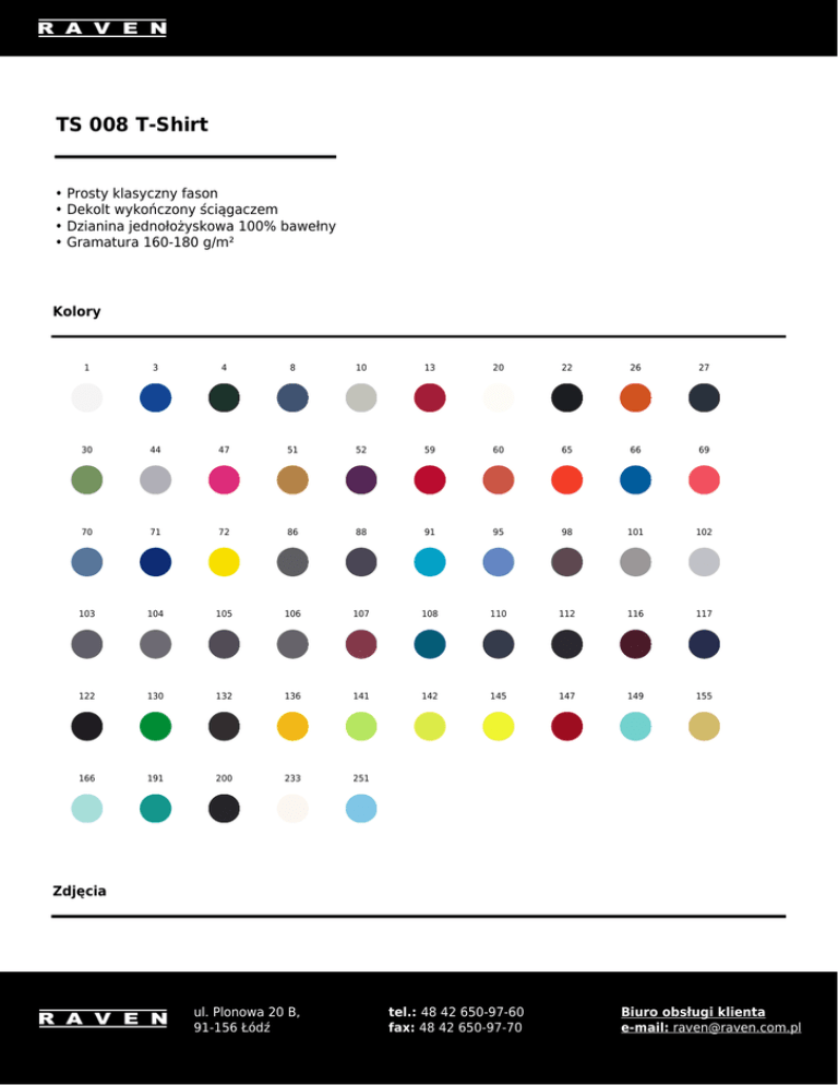TS 008 T-Shirt • Prosty klasyczny fason • Dekolt wykończony ściągaczem • Dzianina jednołożyskowa 100% bawełny • Gramatura 160-180 g/m² Kolory 1 3 4 8 10 13 20 22 26 27 30 44 47 51 52 59 60 65 66 69 70 71 72 86 88 91 95 98 101 102 103 104 105 106 107 108 110 112 116 117 122 130 132 136 141 142 145 147 149 155 166 191 200 233 251 Zdjęcia ul. Plonowa 20 B, 91-156 Łódź tel.: 48 42 650-97-60 fax: 48 42 650-97-70 Biuro obsługi klienta e-mail: [email protected] Produkt dostępny na zamówienie. Minimalna ilość produkcyjna to 300 sztuk. W przypadku mniejszych nakładów prosimy o wybór produktów z sekcji inne marki. ul. Plonowa 20 B, 91-156 Łódź tel.: 48 42 650-97-60 fax: 48 42 650-97-70 Biuro obsługi klienta e-mail: [email protected]