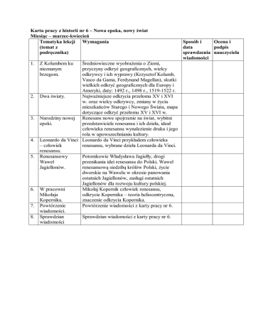 Karta pracy z historii nr 6 – Nowa epoka, nowy świat Miesiąc – marzec-kwiecień Tematyka lekcji Wymagania (temat z podręcznika) 1. 2. 3. 4. 5. 6. 7. 8. Z Kolumbem ku nieznanym brzegom. Średniowieczne wyobrażenia o Ziemi, przyczyny odkryć geograficznych, wielcy odkrywcy i ich wyprawy (Krzysztof Kolumb, Vasco da Gama, Ferdynand Magellan), skutki wielkich odkryć geograficznych dla Europy i Ameryki, daty: 1492 r., 1498 r., 1519-1522 r. Dwa światy. Najważniejsze odkrycia przełomu XV i XVI w. oraz wielcy odkrywcy, zmiany w życiu mieszkańców Starego i Nowego Świata, mapa dotyczące odkryć przełomu XV i XVI w. Narodziny nowej Renesans nowe spojrzenie na świat, wybitni epoki. przedstawiciele renesansu i ich dzieła, ideał człowieka renesansu wynalezienie druku i jego rola w upowszechnianiu kultury. Leonardo da Vinci Leonardo da Vinci przykładem człowieka – człowiek renesansu, wybrane dzieła Leonarda da Vinci. renesansu. Renesansowy Potomkowie Władysława Jagiełły, drogi Wawel przenikania idei renesansu do Polski, Wawel Jagiellonów. renesansową siedzibą królów Polski, życie dworskie na Wawelu w okresie panowania ostatnich Jagiellonów, zasługi ostatnich Jagiellonów dla rozwoju kultury polskiej. W pracowni Mikołaj Kopernik człowiek renesansu, Mikołaja odkrycie Kopernika – teoria heliocentryczna, Kopernika. znaczenie odkrycia Kopernika. Powtórzenie Powtórzenie wiadomości z karty pracy nr 6. wiadomości. Sprawdzian Sprawdzian wiadomości z karty pracy nr 6. wiadomości Sposób i Ocena i data podpis sprawdzenia nauczyciela wiadomości
