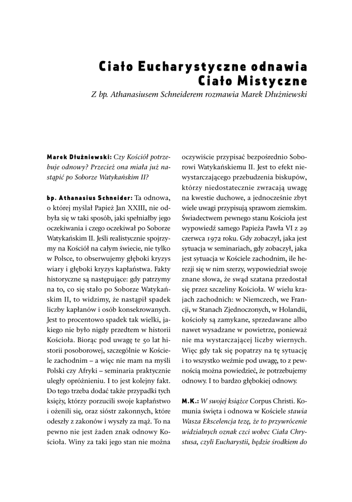 Ciało Eucharystyczne odnawia Ciało Mistyczne Z bp. Athanasiusem Schneiderem rozmawia Marek Dłużniewski M a r e k D ł u ż n i e w s k i : Czy Kościół potrzebuje odnowy? Przecież ona miała już nastąpić po Soborze Watykańskim II? b p . A t h a n a s i u s S c h n e i d e r : Ta odnowa, o której myślał Papież Jan XXIII, nie odbyła się w taki sposób, jaki spełniałby jego oczekiwania i czego oczekiwał po Soborze Watykańskim II. Jeśli realistycznie spojrzymy na Kościół na całym świecie, nie tylko w Polsce, to obserwujemy głęboki kryzys wiary i głęboki kryzys kapłaństwa. Fakty historyczne są następujące: gdy patrzymy na to, co się stało po Soborze Watykańskim II, to widzimy, że nastąpił spadek liczby kapłanów i osób konsekrowanych. Jest to procentowo spadek tak wielki, jakiego nie było nigdy przedtem w historii Kościoła. Biorąc pod uwagę te 50 lat historii posoborowej, szczególnie w Kościele zachodnim – a więc nie mam na myśli Polski czy Afryki – seminaria praktycznie uległy opróżnieniu. I to jest kolejny fakt. Do tego trzeba dodać także przypadki tych księży, którzy porzucili swoje kapłaństwo i ożenili się, oraz sióstr zakonnych, które odeszły z zakonów i wyszły za mąż. To na pewno nie jest żaden znak odnowy Kościoła. Winy za taki jego stan nie można oczywiście przypisać bezpośrednio Soborowi Watykańskiemu II. Jest to efekt niewystarczającego przebudzenia biskupów, którzy niedostatecznie zwracają uwagę na kwestie duchowe, a jednocześnie zbyt wiele uwagi przypisują sprawom ziemskim. Świadectwem pewnego stanu Kościoła jest wypowiedź samego Papieża Pawła VI z 29 czerwca 1972 roku. Gdy zobaczył, jaka jest sytuacja w seminariach, gdy zobaczył, jaka jest sytuacja w Kościele zachodnim, ile herezji się w nim szerzy, wypowiedział swoje znane słowa, że swąd szatana przedostał się przez szczeliny Kościoła. W wielu krajach zachodnich: w Niemczech, we Francji, w Stanach Zjednoczonych, w Holandii, kościoły są zamykane, sprzedawane albo nawet wysadzane w powietrze, ponieważ nie ma wystarczającej liczby wiernych. Więc gdy tak się popatrzy na tę sytuację i to wszystko weźmie pod uwagę, to z pewnością można powiedzieć, że potrzebujemy odnowy. I to bardzo głębokiej odnowy. M . K . : W swojej książce Corpus Christi. Komunia święta i odnowa w Kościele stawia Wasza Ekscelencja tezę, że to przywrócenie widzialnych oznak czci wobec Ciała Chrystusa, czyli Eucharystii, będzie środkiem do 214 C h r i s t i a n i t a s 6 0 - 6 1 / 2 0 1 5 ROZMOWY „ CHRISTIANITAS ” odnowy Ciała Mistycznego, czyli Kościoła. Dlaczego akurat tradycyjne formy kultu eucharystycznego mają stać się początkiem tej odnowy? A . S . : Jest czymś oczywistym, że to Najświętsza Eucharystia jest centrum i sercem Kościoła. Skoro serce jest słabe i chore, wtedy i cały organizm jest słaby. Jeżeli więc chcemy go uzdrowić, zaczynamy od tego, co jest najważniejsze. A tym, co jest najważniejsze, jest Eucharystia, oczywiście jeżeli jesteśmy katolikami. Dla protestantów Eucharystia nie jest kwestią najważniejszą. Dla nich najważniejsze jest Pismo Święte. M . K . : Czy zatem katolicy wierzą dziś w Realną Obecność Chrystusa w Eucharystii? A . S . : Z mojej obserwacji wynika, że w Polsce taka wiara jest. Zanika ona jednak w krajach, w których już dawno wprowadzono Komunię świętą na rękę. W nich ludzie uznają Komunię świętą jedynie za symbol. Potwierdzają to fakty i są dowody na to, że szczególnie wśród dzieci i osób młodych, które przyjmują w ten sposób Komunię świętą, nie istnieje wiara w Realną Obecność. Szacuję, że w Niemczech i w Austrii w ok. 90 procent przypadków, gdzie dzieci przyjmują Komunię świętą na rękę, mówią o niej: „święty chleb”. Twierdzi się więc, że nie jest to Ciało Chrystusa, a jedynie chleb. M . K . : Co jest niewłaściwego w Komunii świętej na rękę? Zwolennicy tej formy przyjmowania Komunii twierdzą, że to powrót do chrześcijańskiej starożytności i ówczesnego sposobu komunikowania. A . S . : To wielki mit, bajka. Do tego nacechowana ideologicznie, by zmylić ludzi. W starożytności Komunię świętą kładziono na rękę prawą, ale Hostii nie wolno było dotknąć palcami. Przy tym trzeba było bardzo głęboko pochylić głowę do ręki, a nie rękę do ust. Do tego Hostię należało przyjąć ustami bezpośrednio z ręki, zaś językiem trzeba było zebrać partykuły. Mężczyźni przed przyjęciem Komunii świętej myli ręce. Kobiety natomiast nie mogły przyjmować Hostii bezpośrednio na rękę. Kładły więc na nią specjalne płótno, nazywane dominicana, i również musiały się głęboko pochylić, aby spożyć Komunię świętą. Już samo to pokazuje, że istnieje wielka różnica w porównaniu z tym, z czym mamy do czynienia dzisiaj. Dzisiejsza praktyka została wynaleziona nawet nie przez Lutra, a przez kalwinistów. Forma ta polega na tym, że samemu chwyta się własnymi palcami Hostię i bierze się ją do ust. W Kościele nigdy nie było czegoś takiego. A to Duch Święty prowadzi Kościół w ten sposób, że przez stulecia nabieramy większego pojmowania tajemnic i rzeczy świętych. Pojmowanie to rodzi potrzebę, aby świadomość pokazać gestami zewnętrznymi. Jest to poruszenie Ducha Świętego. On uczy nas, byśmy zwiększali przejawy czci Pana Boga. Papież Pius XII powiedział, że jest rodzajem herezji, jeśli uważa się, że powinniśmy obecnie przejmować formy kultu Bożego pierwszych chrześcijan. W ten sposób ignoruje się bp. Athanasius Schneider Ciało Eucharystyczne odnawia Ciało Mistyczne bowiem działanie Ducha Świętego w Kościele. Jeżeli więc mamy taką fazę w historii, że zewnętrzne sposoby kultu są pomniejszane, jest to znak, że działanie Ducha Świętego nie jest przyjmowane. Na tym właśnie polega nasz dzisiejszy kryzys. M . K . : Jak