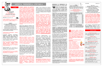 SZÓSTA NIEDZIELA ZWYKŁA Z pulpitu I czyt. Kpł 13,1-2.45-46 II czyt. 1 Kor 10,31-11,1 Ew. Mk 1,40-45 Refren psalmu responsorialnego „Tyś mą ucieczką i moją radością”. Na KAWĘ i PĄCZKI zaprasza CHÓREK. RÓŻANIEC prowadzi Róża nr. 52. FAMILY WEEKEND - życzymy wypoczynku w gronie rodzinnym a w sobotę 21 lutego zapraszamy do Centrum J P II do wspólnego świętowania. CHRZTY Mocą działania Ducha świętego i przez polanie wodą dar chrztu świętego otrzyma: Collin Patrick Koops syn Krystina i Alberta Maja Therese Bielawa córka Marites i Janusz Aleksandra Montaine córka Barbary i Kaiser Liam Noah Vincent Corvinelli syn Soni i Vincent Nicholas Nieznalski syn Agnieszki i Pawła Dzieciom, rodzicom i chrzestnym życzymy dużo zdrowia i błogosławieństwa Bożego. ZAŚWIADCZENIA PODATKOWE - INCOME TAX zostały już wysłane. KATOLICKA PORADNIA MAŁŻEŃSKORODZINNA działająca przy naszej parafii zaprasza osoby, które mogłyby poświęcić 2-4 godziny w miesiącu na rzecz parafii. Poszukujemy psychologa, absolwenta studiów o rodzinie i nauczyciela naturalnego planowania rodziny. Studia mogą być ukończone w Polsce. Zainteresowanych prosimy o kontakt pod nr.: 647 677-1142. MSZA ŚW. W INTENCJI PAR OBCHODZĄCYCH ROCZNICĘ SWOJEGO ŚLUBU odprawiona zostanie w niedzielę 22 II o godz.11:00. Błogosławieństwo dzieci, obchodzących rocznicę swojego chrztu o godz. 13:00. Zgłoszenia przyjmuje biuro parafialne. KRZYŻE MISYJNE, które rozprowadzaliśmy na zakończenie misji, zostały ponownie zamówione. Mamy nadzieję, że wkrótce je otrzymamy. MATKI w MODLITWIE spotykają się we wtorki o godz. 19:00 w sali Sr. Faustyny. Inf. Ewa tel.: H: 905 676-9227, cel: 416 908- 6152. BIERZMOWANIE. Kurs przygotowawczy dla dorosłych do Sakramentu Bierzmowania w języku polskim oraz angielskim. Katechezy odbywać się będą we wtorki o godz. 20:00 w salce Sr. Faustyny w Nowym Centrum Katechetycznym: 24 lutego, 3, 10 oraz 17 marca, br. Zapisy i informacje tel: 905848-2420. Przygotowanie jest otwarte dla wszystkich dorosłych. Przy zapisie wymagane jest świadectwo chrztu św. KATOLICY WZYWANI DO POPIERANIA KLAUZULI SUMIENIA DLA LEKARZY. Kolegium Lekarzy i Chirurgów prowincji Ontario w proponowanym nowym dokumencie stwierdza, że "w przypadku, gdy lekarze nie chcą zapewnić pewnych elementów opieki ze względu na ich moralne lub religijne przekonania, mają obowiązek skierować pacjenta do innego świadczeniodawcy". Według katolickich lekarzy oraz chirurgów, skierowanie pacjenta do innego świadczeniodawcy jest naruszeniem ich praw, gdyż zmusza to lekarza lub chirurga do złamania swoich przekonań, tym samym stając się uczestnikiem w procedurze, przeciwko której się sprzeciwia. Kolegium Lekarzy i Chirurgów prowincji Ontario przyjmuje wnioski od wszystkich obywateli Ontario do 20. lutego br. Jesteśmy wszyscy wezwani do informowania Kolegium Lekarzy i Chirurgów prowincji Ontario w formie pisemnej, że sprzeciwiamy się, aby lekarze byli zobowiązani do skierowania pacjentów do innego świadczeniodawcy gdyż narusza to ich prawo do zastosowania Klauzuli Sumienia. Katolicka Rada Prawa Cywilnego jest jedyną katolicką organizacją świecką, która koordynuje tego rodzaju wysiłki. Info.: www.ccrl.ca. POMOC PRZY ZBIERANIU PIENIEDZY PRZY DRZWIACH WEJSCIOWYCH. Nasza parafia wspiera corocznie wiele osób w trudnej sytuacji materialnej, zarówno lokalnie jak i w Polsce (Domy Dziecka i ośrodki opieki). Akcje pomocy prowadzimy przed świętami Bożego Narodzenia i Wielkanocy. Na ten cel przeznaczone są środki gromadzone w każdą niedzielę po mszach św. podczas zbiórki dla ubogich przy drzwiach wyjściowych a prowadzi ją Rodzina Różańca Świętego. Aby akcja zbierania pieniędzy przebiegała sprawnie potrzeba jeszcze kilku dodatkowych osób. Chętnych, którzy mogliby przynajmniej raz w miesiącu poświęcić dodatkowe pół godziny i pomoc w zbiórce pieniędzy prosimy o kontakt z Urszulą: tel.: 905 848 2952. POMOC DLA STUDENTA. Od młodego polskiego studenta, który mieszka z rodzicami w Irlandii otrzymaliśmy korespondencję z prośbą o pomoc. Paweł skończył w Polsce teologię we Wrocławiu, następnie wyjechał do rodziców do Belfastu i tam rozpoczął studia na Ulster University, Belfast - kierunek Management. Po zakończonych studiach chciałby odbyć praktykę/ intrenship w Kanadzie. Poszukuje pomocy w tej sprawie oraz informacji: [email protected] GRUPA PRO-LIFE powstała w naszej Parafii gorąco zaprasza wszystkich parafian do cichej modlitwy Wielkopostnej za dzieci nienarodzone. Zapraszamy do Adoracji Pana Jezusa w Kaplicy Wieczystej Adoracji w intencji życia, codziennie w godzinach od 8:00 do 20:00, poczynając już od Środy Popielcowej poprzez cały okres Wielkiego Postu. Inauguracyjna Msza Św będzie miała miejsce 17 lutego o godzinie 19:00. Pomóż ratować życie - dołącz się do Adoracji, by razem w czasie trwającej ogólnoświatowej akcji 40 Dni dla Życia, walczyć modlitewnie o matki i dzieci. Potrzebna, choć jedna godzina twojego czuwania! Otoczmy modlitwą życie. TATA MAMA I JA. Spotkanie mężczyzn grupy Tata Mama i Ja odbędzie się w piątek, 20go lutego o 20:15 w budynku Dobrego Pasterza na dole. Wszyscy mężczyźni mile widziani. W miesiącu lutym, świętujemy walentynki, zapraszamy więc na wykład prezentacje multimedialną „O Seksie”, którą wygłosi Dr Marek Babik (ojciec 3 synów i 1 córki), wykładowca wychowania seksualnego w Wyższej Szkole Filozoficzno - Pedagogicznej "Ignatianum" w Krakowie, który ukończył Papieską Akademię Teologiczna. TAIZE. W okresie Wielkiego Postu, zapraszamy również w tym roku na cykl modlitewnych spotkań w duchu Taize. Pragniemy, aby każdy w naszej parafii znalazł coś dla siebie, coś, co lubi, gdzie czuje się dobrze. Spotkania modlitewne w duchu Taize odbędą się w niedziele 22 lutego, 8 i 22 marca o godz. 20:00 w kościele, po wieczornej Mszy św. Serdecznie zapraszamy! K