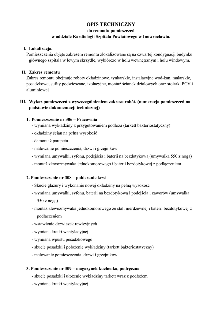 OPIS TECHNICZNY do remontu pomieszcze w oddziale Kardiologii Szpitala Powiatowego w Inowroc awiu. I. Lokalizacja. Pomieszczenia obj te zakresem remontu zlokalizowane s na czwartej kondygnacji budynku ównego szpitala w lewym skrzydle, wybiórczo w holu wewn trznym i holu windowym. II. Zakres remontu Zakres remontu obejmuje roboty ok adzinowe, tynkarskie, instalacyjne wod-kan, malarskie, posadzkowe, sufity podwieszane, izolacyjne, monta cianek dzia owych oraz stolarki PCV i aluminiowej III. Wykaz pomieszcze z wyszczególnieniem zakresu robót. (numeracja pomieszcze na podstawie dokumentacji technicznej) 1. Pomieszczenie nr 306 – Pracownia - wymiana wyk adziny z przygotowaniem pod - ok adziny cian na pe a (tarkett bakteriostatyczny) wysoko - demonta parapetu - malowanie pomieszczenia, drzwi i grzejników - wymiana umywalki, syfonu, podej cia i baterii na bezdotykow (umywalka 550 z nog ) - monta zlewozmywaka jednokomorowego i baterii bezdotykowej z pod czeniem 2. Pomieszczenie nr 308 – pobieranie krwi - Skucie glazury i wykonanie nowej ok adziny na pe wysoko - wymiana umywalki, syfonu, baterii na bezdotykow i podej cia i zaworów (umywalka 550 z nog ) - monta zlewozmywaka jednokomorowego ze stali nierdzewnej i baterii bezdotykowej z pod aczeniem - wstawienie drzwiczek rewizyjnych - wymiana kratki wentylacyjnej - wymiana wpustu posadzkowego - skucie posadzki i po enie wyk adziny (tarkett bakteriostatyczny) - malowanie pomieszczenia, drzwi i grzejników 3. Pomieszczenie nr 309 – magazynek kuchenka, podr czna - skucie posadzki i u enie wyk adziny tarkett wraz z pod - wymiana kratki wentylacyjnej em - skucie glazury i u enie ponownie fartuszka przy umywalce - wymiana zlewozmywaka na umywalk , baterii, syfonu i podej cia (umywalka 500) - monta cianki z STG z na wietlem i drzwiami od pomieszczenia nr 308 (wysoko cianki 2,05) - wstawienie drzwiczek rewizyjnych - szpachlowanie, malowanie pomieszczenia, drzwi i grzejników 4. Pomieszczenie nr 310 – pokój ordynatora - demonta umywalki i baterii - wykucie otworu drzwiowego i obsadzenie drzwi „70” do pom. 310A - likwidacja stolarki drzwiowej od pomieszczenia - wymiana kratki wentylacyjnej - wymiana wyk adziny z przygotowaniem pod a (tarkett) - malowanie pomieszczenia, drzwi, grzejników 5. Pomieszczenie nr 310A – sanitariat - Wymiana glazury - wymiana umywalki, syfonu, baterii i podej cia (umywalka 500) - wymiana muszli ust powej na „compact”, wymiana podej cia wod-kan - wykucie drzwi i zamurowanie otworu drzwiowego z otynkowaniem - monta kabiny natryskowej z wykonaniem izolacji cian pionowych - wymiana kratki wentylacyjnej - wymiana posadzki z przygotowaniem pod a - malowanie pomieszczenia, drzwi 6. Pomieszczenie nr 311 – oddzia owa - Wymiana fartuszka glazury - wymiana umywalki, syfonu, baterii i podej cia (umywalka 550 z nog ) - wymiana kratki wentylacyjnej - wymiana wyk adziny z przygotowaniem pod a - malowanie pomieszczenia, drzwi, grzejników 7. Pomieszczenie nr 311A – natrysk - Wymiana glazury z wykonaniem izolacji w okolicy kabiny - wymiana brodzika na kabin - monta umywalki i baterii z pod czeniem (umywalka 500) - wymiana kratki wentylacyjnej - wymiana posadzki z przygotowaniem pod a - wymiana kratki wpustu pod ogowego - malowanie pomieszczenia, drzwi 8. Pomieszczenie nr 312 – sala chorych - Wymiana fartuszka glazury - wymiana umywalki, syfonu, baterii i podej cia (umywalka 550 z nog ) - wymiana kratki wentylacyjnej - wymiana wyk adziny z przygotowaniem pod a (tarkett) - malowanie pomieszczenia, drzwi, grzejników, ek, zestawów nad 9. Pomieszczenie nr 312A – W C - wymiana glazury - wymiana posadzki z przygotowaniem pod a - wymiana umywalki, baterii, syfonu i podej cia - wymiana muszli na „compact” z przerobieniem podej - wymiana zaworów odcinaj cych - wstawienie drzwiczek rewizyjnych - malowanie pomieszczenia - wymiana kratki wentylacyjnej 10. Pomieszczenie 313 – W C - wymiana glazury - wymiana posadzki z przygotowaniem pod a - wymiana muszli na „compact” z przerobieniem podej (robocizna) - wymiana umywalki, baterii, syfonu i podej cia (robocizna) - wymiana zaworów odcinaj cych - wstawienie drzwiczek rewizyjnych - malowanie pomieszczenia - wymiana kratki wentylacyjnej 11. Pomieszczenie nr 314 – brudownik kowych, stolików - wymiana glazury - demonta parapetu i ob enie parapetu p ytkami - wymiana umywalki, syfonu i baterii (umywalka 500) - monta basenu z odp ywem i pod czenie - wykonanie podej cia wod-kan do wyparzacza - wymiana kratki wentylacyjnej - wymiana posadzki z przygotowaniem pod a - wymiana wpustu pod ogowego - malowanie pomieszczenia, drzwi, grzejników 12. Pomieszczenie nr 314A – sk ad porz dkowy - wymiana, glazury - wymiana zlewu na nierdzewny, syfonu, baterii i podej cia - wymiana posadzki z przygotowaniem pod a - wymiana wpustu pod ogowego - wymiana kratki wentylacyjnej - malowanie pomieszczenia, drzwi, 13. Pomieszczenie nr 303A – przedsionek - wymiana wyk adziny z przygotowaniem pod a (tarkett) - malowanie pomieszczenia, 14. Pomieszczenie nr 315 – azienka dla niepe nosprawnych - wymiana glazury - wymiana posadzki z izolacj - wymiana wpustu pod ogowego - wymiana kratki wentylacyjnej - wykucie otworu i wymiana zaworów odcinaj cych - obsadzenie drzwiczek rewizyjnych - wymiana muszli ust powej na muszl dla osób niepe nosprawnych wraz z dolnop ukiem uruchamianym okciem - wymiana umywalki, syfonu i baterii dla osób niepe nosprawnych) - monta baterii natryskowej ciennej dla osób niepe nosprawnych z pod czeniem - monta siode ka do k pieli, systemu os onowego dla osoby k pi cej si (szyna + zas ony) - monta pochwytów i podpar ( 3 sta e i 3 uchylne) przy umywalce muszli i siode ku - malowanie pomieszczenia i stolarki 15. Pomieszczenie nr 316 – W C - wymiana glazury - wymiana posadzki z przygotowaniem pod a - wymiana wpustów pod ogowych - wymiana kratki wentylacyjnej - wymiana umywalki, syfonu, baterii i podej cia (umywalka 500) - wymiana muszli na „compact” i wymiana podej cia wod