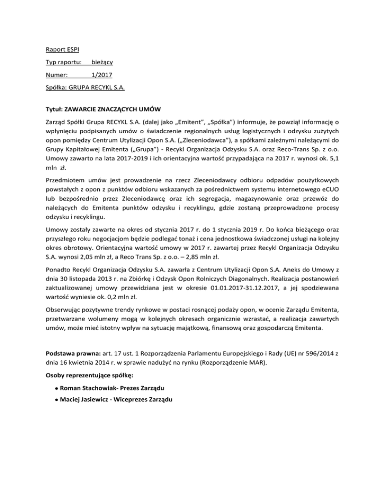 Raport ESPI Typ raportu: bieżący Numer: 1/2017 Spółka: GRUPA RECYKL S.A. Tytuł: ZAWARCIE ZNACZĄCYCH UMÓW Zarząd Spółki Grupa RECYKL S.A. (dalej jako „Emitent”, „Spółka”) informuje, że powziął informację o wpłynięciu podpisanych umów o świadczenie regionalnych usług logistycznych i odzysku zużytych opon pomiędzy Centrum Utylizacji Opon S.A. („Zleceniodawca”), a spółkami zależnymi należącymi do Grupy Kapitałowej Emitenta („Grupa”) - Recykl Organizacja Odzysku S.A. oraz Reco-Trans Sp. z o.o. Umowy zawarto na lata 2017-2019 i ich orientacyjna wartość przypadająca na 2017 r. wynosi ok. 5,1 mln zł. Przedmiotem umów jest prowadzenie na rzecz Zleceniodawcy odbioru odpadów poużytkowych powstałych z opon z punktów odbioru wskazanych za pośrednictwem systemu internetowego eCUO lub bezpośrednio przez Zleceniodawcę oraz ich segregacja, magazynowanie oraz przewóz do należących do Emitenta punktów odzysku i recyklingu, gdzie zostaną przeprowadzone procesy odzysku i recyklingu. Umowy zostały zawarte na okres od stycznia 2017 r. do 1 stycznia 2019 r. Do końca bieżącego oraz przyszłego roku negocjacjom będzie podlegać tonaż i cena jednostkowa świadczonej usługi na kolejny okres obrotowy. Orientacyjna wartość umowy w 2017 r. zawartej przez Recykl Organizacja Odzysku S.A. wynosi 2,05 mln zł, a Reco Trans Sp. z o.o. – 2,85 mln zł. Ponadto Recykl Organizacja Odzysku S.A. zawarła z Centrum Utylizacji Opon S.A. Aneks do Umowy z dnia 30 listopada 2013 r. na Zbiórkę i Odzysk Opon Rolniczych Diagonalnych. Realizacja postanowień zaktualizowanej umowy przewidziana jest w okresie 01.01.2017-31.12.2017, a jej spodziewana wartość wyniesie ok. 0,2 mln zł. Obserwując pozytywne trendy rynkowe w postaci rosnącej podaży opon, w ocenie Zarządu Emitenta, przetwarzane wolumeny mogą w kolejnych okresach organicznie wzrastać, a realizacja zawartych umów, może mieć istotny wpływ na sytuację majątkową, finansową oraz gospodarczą Emitenta. Podstawa prawna: art. 17 ust. 1 Rozporządzenia Parlamentu Europejskiego i Rady (UE) nr 596/2014 z dnia 16 kwietnia 2014 r. w sprawie nadużyć na rynku (Rozporządzenie MAR). Osoby reprezentujące spółkę: Roman Stachowiak- Prezes Zarządu Maciej Jasiewicz - Wiceprezes Zarządu