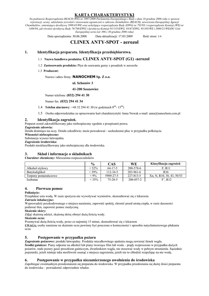 KARTA CHARAKTERYSTYKI Na podstawie Rozporządzenia REACH (WE) nr 1907/2006 Parlamentu Europejskiego i Rady z dnia 18 grudnia 2006 roku w sprawie rejestracji, oceny, udzielania zezwoleń i stosowania ograniczeń w zakresie chemikaliów (REACH), utworzenia Europejskiej Agencji Chemikaliów, zmieniające dyrektywę 1999/45/WE oraz uchylające rozporządzenie Rady (EWG) nr 793/93 i rozporządzenie Komisji (WE) nr 1488/94, jak równieŜ dyrektywę Rady 76/769/EWG i dyrektywę Komisji 91/155/EWG, 93/67/EWG, 93/105/WE i 2000/21/WE(DU Unii Europejskiej seria Lnr 396 z 30 grudnia 2006 roku) Data sporządzenia: 30.06.2008 Data aktualizacji: 17.03.2009 Ilość stron: 1/4 CLINEX ANTY-SPOT - aerozol 1. Identyfikacja preparatu. Identyfikacja przedsiębiorstwa. 1.1 Nazwa handlowa produktu: CLINEX ANTY-SPOT (G1) -aerozol 1.2 Zastosowanie produktu: Płyn do usuwania gumy z posadzek w aerozolu 1.3 Producent: Nazwa i adres firmy: NANOCHEM Sp. Z o.o. ul. Schonów 3 41-200 Sosnowiec Numer telefonu: (032) 294 41 30 Numer fax. (032) 294 41 34 1.4 Telefon alarmowy: +48 32 294 41 30 (w godzinach 800- 1500) 1.5 Osoba odpowiedzialna za opracowanie kart charakterystyki Anna Nowak e-mail: [email protected] 2. Identyfikacja zagroŜeń. Preparat został zakwalifikowany jako niebezpieczny zgodnie z przepisami prawa. ZagroŜenie zdrowia: Działa draŜniąco na oczy. Działa szkodliwie; moŜe powodować - uszkodzenie płuc w przypadku połknięcia. Własności niebezpieczne: Substancja wysoce łatwopalna. ZagroŜenie środowiska: Produkt niesklasyfikowany jako niebezpieczny dla środowiska. 3. Skład i informacje o składnikach Charakter chemiczny: Mieszanina rozpuszczalników Alkohol etylowy Butylodiglikol Terpeny pomarańczowe Izobutan 4. % CAS WE < 52% < 39% < 9% < 35% 64-17-5 112-34-5 5989-27-5 75-28-5 200-578-6 203-961-6 227-813-5 200-857-2 Klasyfikacja zagroŜeń F; R11 R36 Xn, N, R10, 38, 43, 50/53 F+, R12 Pierwsza pomoc Połknięcie: Przepłukać usta wodą. W razie spoŜycia nie wywoływać wymiotów, skonsultować się z lekarzem. Zatrucie inhalacyjne: Wyprowadzić poszkodowanego z miejsca naraŜenia, zapewnić spokój, chronić przed utratą ciepła, w razie duszności podawać tlen, zapewnić pomoc medyczną. SkaŜenie skóry: Zdjąć skaŜoną odzieŜ, skaŜoną skórę obmyć duŜą ilością wody. SkaŜenie oczu: Przemywać duŜą ilością wody, przez co najmniej 15 minut, skonsultować się z lekarzem UWAGA: osoby naraŜone na skaŜenie oczu powinny być pouczone o konieczności i sposobie natychmiastowego płukania oczu 5. Postępowanie w przypadku poŜaru ZagroŜenie poŜarowe: produkt łatwopalny. Produkty niecałkowitego spalenia mogą zawierać tlenek węgla.. Środki gaśnicze: Piany odporne na alkohol lub piany tworzące film lub woda – prądy rozproszone w przypadku duŜych poŜarów, małe poŜary gasić proszkiem gaśniczym, dwutlenkiem węgla, nie stosować wody w pełnym strumieniu. Sąsiednie pojemniki, jeŜeli istnieje taka moŜliwość usunąć z miejsca zagroŜenia, jeŜeli nie to chłodzić rozpylając na nie wodę. 6. Postępowanie w przypadku niezamierzonego uwolnienia do środowiska Zapobiegać ewentualnym przedostaniem się preparatu do środowiska. W przypadku przedostania się duŜej ilości preparatu do środowiska – powiadomić odpowiednie władze. KARTA CHARAKTERYSTYKI Na podstawie Rozporządzenia REACH (WE) nr 1907/2006 Parlamentu Europejskiego i Rady z dnia 18 grudnia 2006 roku w sprawie rejestracji, oceny, udzielania zezwoleń i stosowania ograniczeń w zakresie chemikaliów (REACH), utworzenia Europejskiej Agencji Chemikaliów, zmieniające dyrektywę 1999/45/WE oraz uchylające rozporządzenie Rady (EWG) nr 793/93 i rozporządzenie Komisji (WE) nr 1488/94, jak równieŜ dyrektywę Rady 76/769/EWG i dyrektywę Komisji 91/155/EWG, 93/67/EWG, 93/105/WE i 2000/21/WE(DU Unii Europejskiej seria Lnr 396 z 30 grudnia 2006 roku) Data sporządzenia: 30.06.2008 Data aktualizacji: 17.03.2009 Ilość stron: 2/4 CLINEX ANTY-SPOT - aerozol W przypadku wydostania się większej ilości produktu do środowiska, skaŜony teren naleŜy odizolować, a poza jego obręb wyprowadzić osoby postronne. W pierwszej kolejności odciąć i zabezpieczyć źródło skaŜenia środowiska. Usunąć potencjalne źródła zapłonu. Uwolniony produkt zebrać i oddać do utylizacji. W razie potrzeby wezwać ekipy ratownicze. 7. Postępowanie z preparatem i jego magazynowanie Postępowanie z preparatem: Unikać kontaktu ze skóra i oczami, unikać wdychania oparów, postępować zgodnie z ogólnie przyjętymi zasadami bezpieczeństwa przy pracy z chemikaliami. Magazynowanie: Przechowywać w szczelnie zamkniętych opakowaniach z tworzyw sztucznych lub stali nierdzewnej w chłodnym dobrze wentylowanym pomieszczeniu chronić przed światłem. 8. Kontrola naraŜenia i środki ochrony indywidualnej Stosowane środki ochrony osobistej powinny spełniać wymogi Rozporządzenia Ministra Gospodarki, Pracy i Polityki Społecznej z dnia 21 grudnia 2005r. w sprawie zasadniczych wymagań dla środków ochrony indywidualnej ( Dz.U. nr.259, poz. 2173 ) Ochrona dróg oddechowych: w przypadku naraŜenia maska ochronna Ochrona oczu/ twarzy: okulary ochronne Ochrona skóry: rękawice ochronne Techniczne środki ochrony: wentylacja ogólna pomieszczenia (wg Rozporządzenie Ministra Pracy i Polityki Społecznej z dnia 29 listopada 2002 r. w sprawie najwyŜszych dopuszczalnych stęŜeń i natęŜeń czynników szkodliwych dla zdrowia w środowisku pracy Dz.U. nr 217, poz. 1833 ze zmianami oraz zmianami Dz. U. Nr 212 poz. 1769 z 10.10.2005 r.) NajwyŜsze dopuszczalne stęŜenie: dla etanolu: NDS=1900 mg/m3 dla butylodiglikolu: NDS, NDSCH nie ustalono dla terpeny pomarańczowej: NDS, NDSCH nie ustalono Uwaga: Gdy stęŜenia substancji jest ustalone i znane, doboru środków ochrony indywidualnej naleŜy dokonać z uwzględnieniem stęŜenia substancji występujących na danym stanowisku pracy, czasu ekspozycji oraz czynności wyk