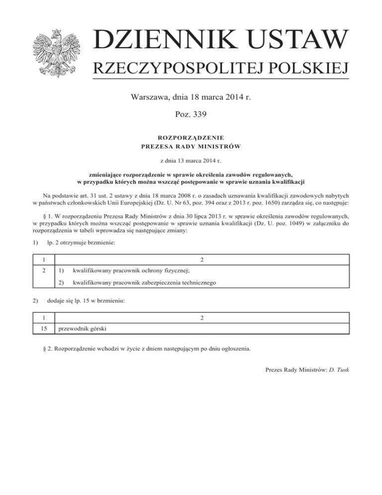 DZIENNIK USTAW RZECZYPOSPOLITEJ POLSKIEJ Warszawa, dnia 18 marca 2014 r. Poz. 339 ROZPORZĄDZENIE PREZESA RADY MINISTRÓW z dnia 13 marca 2014 r. zmieniające rozporządzenie w sprawie określenia zawodów regulowanych, w przypadku których można wszcząć postępowanie w sprawie uznania kwalifikacji Na podstawie art. 31 ust. 2 ustawy z dnia 18 marca 2008 r. o zasadach uznawania kwalifikacji zawodowych nabytych w państwach członkowskich Unii Europejskiej (Dz. U. Nr 63, poz. 394 oraz z 2013 r. poz. 1650) zarządza się, co następuje: § 1. W rozporządzeniu Prezesa Rady Ministrów z dnia 30 lipca 2013 r. w sprawie określenia zawodów regulowanych, w przypadku których można wszcząć postępowanie w sprawie uznania kwalifikacji (Dz. U. poz. 1049) w załączniku do rozporządzenia w tabeli wprowadza się następujące zmiany: 1) lp. 2 otrzymuje brzmienie: 1 2 2 1) kwalifikowany pracownik ochrony fizycznej; 2) kwalifikowany pracownik zabezpieczenia technicznego dodaje się lp. 15 w brzmieniu: 2) 1 15 2 przewodnik górski § 2. Rozporządzenie wchodzi w życie z dniem następującym po dniu ogłoszenia. Prezes Rady Ministrów: D. Tusk