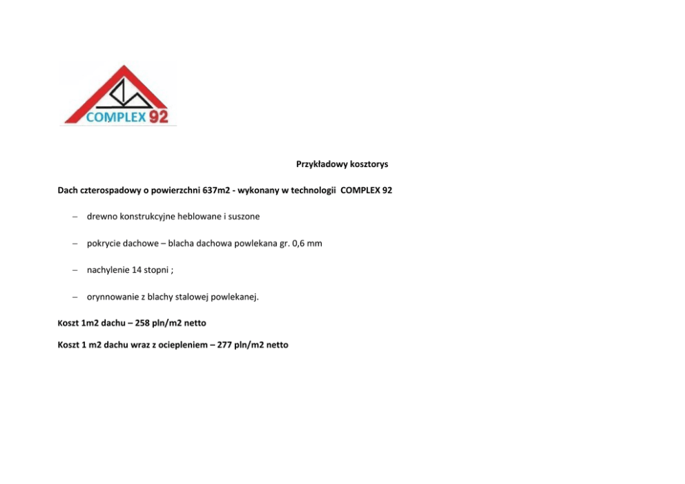 Przykładowy kosztorys Dach czterospadowy o powierzchni 637m2 - wykonany w technologii COMPLEX 92 drewno konstrukcyjne heblowane i suszone pokrycie dachowe – blacha dachowa powlekana gr. 0,6 mm nachylenie 14 stopni ; orynnowanie z blachy stalowej powlekanej. Koszt 1m2 dachu – 258 pln/m2 netto Koszt 1 m2 dachu wraz z ociepleniem – 277 pln/m2 netto L.p. Materiał / robocizna A. Kratownice drewniane Dostawa wiązarów dachowych Wiązary dachowe w rozstawie co 3,6 m –heblowane ; suszone Wiązary szczytowe -szczytowe połacie dachu Montaż usztywnień dachowych- stężenia dachowe Wykonanie punktów kotwiących – do mocowania wiązarów dachowych Materiał łączący -łączniki Montaż Robocizna Dźwig Transport Koszty dodatkowe J.m. Ilość 36.264 m2 szt. m2 m2 m2 m2 m2 km m2 637 2 637 637 637 23.212,00 15.288,00 1.425,00 2.580,00 2.676,00 1.243,50 637 637 148 637 12.178,50 7.167,00 2.389,50 711,00 1.911,00 Obliczenia statyczne -wykonanie dokumentacji technicznej B. Materiały i prace ciesielskie Płatwie dachowe Montaż płatwi dachowych Deski okapowe - profile KVH Montaż desek okapowych –profile KVH Płyty narożne 25/160- na szczytowych połaciach dachu Razem netto 873,00 m3 m m3 m m3 11,79 1146 1,49 130 0,26 19.824,00 10.788,00 4.813,00 2.347,00 585,00 175,50 Montaż - Płyt narożnych 25/160- na szczytowych połaciach dachu Konstrukcja –deskowanie pod świetliki/wyłazy dachowe Drabiny do świetlików/wyłazów dachowych Koszty dodatkowe C. D. E. Piorunochron Dostawa i montaż piorunochronu na dachu z przyłączeniem do istniejącej instalacji odgromowej na budynku Blacha trapezowa z powłoką z tworzywa sztucznego-powlekana, grubość 0,6 mm Dostawa blachy trapezowej HBPE ; gr. 0,6 mm Montaż blachy trapezowej Obróbka kalenicowa –grzbiet dachu –HBPE ; gr. 0,5 mm Obróbki narożnikowe – szczyty dachu –HBPE ; gr. 0,5 mm Zabezpieczenie antykorozyjne blachy Płotki przeciwśniegowe ( dł. L=2,0 m ) wzdłuż okapu dachu Płotki przeciwśniegowe montowane w 2 rzędach ( tylko nad wejściami )-typ SNBAR2 Uszczelki kalenicowe Uszczelki narożnikowe Turbina wentylacyjna; rotacyjna LOMANCO BIB 12 Koszty dodatkowe Orynnowanie z blach powlekanych Dostawa i montaż rynny -150 Dostawa i montaż rur spustowych – 150/100 m szt. szt. 64 2 2 240,00 145,50 99,00 m2 699 4.299,00 4.299,00 m2 m2 m m m m m 769 699 44 32 64 130 8 51.942,00 32.298,00 8.808,00 1.749,00 1.296,00 115,50 3.802,50 648,00 m m szt. 88 64 4 m szt. 168 6 330,00 240,00 1.980,00 675,00 24.697,50 11.466,00 400,50 Dostawa i montaż złączy kolankowych Podłączenie odpowietrzników wentylacji sanitarnej z głowicami wentylacyjnymi Lomanco z uszczelnieniem silikonowym Wykonanie izolacji cieplnej i przeciw ogniowej przejść przez dach – poniżej metalowego dachu. Odpowietrzniki kanalizacji Antena Wyłazy dachowe Koszty dodatkowe F. G. m szt. 3,6 8 283,50 6.684,00 m2 38 2.764,50 szt. szt. szt. 8 1 2 1.620,00 219,00 810,00 450,00 Kanalizacja PCV – podłączenie do istniejącej instalacji-wpustów Dostawa i montaż kanalizacji PCV Koszty dodatkowe m 54 3.556,50 3.361,50 195,00 Rimsa 26 Dostawa tulei ochronnej Montaż tulei ochronnej Dostawa arkuszy blachy gzymsowej Montaż arkuszy blachy gzymsowej Dostawa profili nasadowych Montaż profili nasadowych Uszczelnienie dachu ( blachy trapezowej) przy okapie Materiały łączące/połączeniowe Koszty dodatkowe m m m m m m m m 132 130 132 130 132 130 130 130 11.110,50 2.266,50 897,00 2.178,00 1.053,00 1.822,50 975,00 487,50 468,00 963 Dostawa blachy trapezowej HBPE ; gr. 0,6 mm m2 769 32.298,00 H. Projekt Budowlany – do pozwolenia na budowę I. Drobne prace budowlane Drobne prace budowlane; przygotowanie miejsc zakotwienia Oczyszczenie dachu Usunięcie i utylizacja gruzu Wykonanie ściany ogniowej szt. m2 1 1.875,00 637 1 1 1 7.281,00 3.058,50 270,00 375,00 3.577,50 J. Zabezpieczenie bezpieczeństwa prowadzonych robót na dachu-instalacje BHPochronne 324,00 K. Osłony/pokrywy przeciwpożarowe Dostawa i montaż nowych osłon/pokryw przeciwpożarowych Dostawa i montaż nowej drabiny pożarowej / demontaż starej drabiny pożarowej Rozbiórka betonowych elementów wokół wyłazów dachowych 3.168,00 2.362,50 633,00 172,50 szt. szt. szt. 1 1 1 Razem netto M Usługa dodatkowa – izolacja termiczna Dostawa i montaż izolacji cieplnej – gr. 16 cm Drewniana kładka do chodzenia Dodatkowe koszty 164.341,50 m2 m 637 51 12.108,50 10.817,00 841,50 450,00