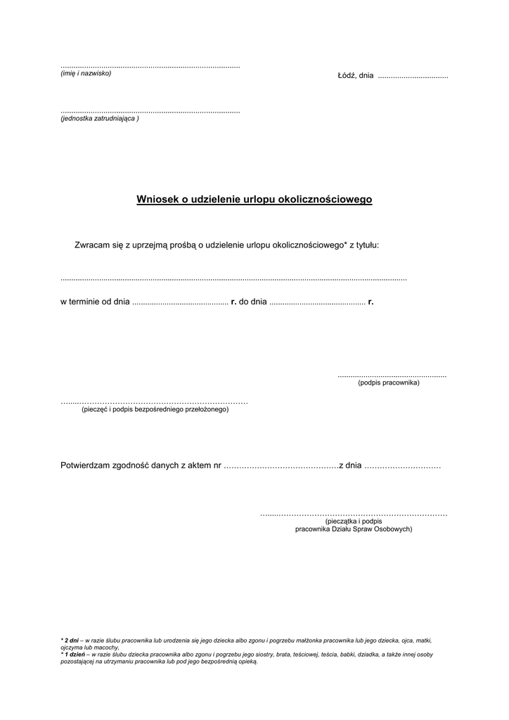 .................................................................................... (imię i nazwisko) Łódź, dnia ................................. .................................................................................... (jednostka zatrudniająca ) Wniosek o udzielenie urlopu okolicznościowego Zwracam się z uprzejmą prośbą o udzielenie urlopu okolicznościowego* z tytułu: .................................................................................................................................................................. w terminie od dnia ............................................. r. do dnia ............................................. r. ................................................... (podpis pracownika) ….....………………………………………………………… (pieczęć i podpis bezpośredniego przełoŜonego) Potwierdzam zgodność danych z aktem nr ………………………………………z dnia ………………………… ….....………………………………………………………… (pieczątka i podpis pracownika Działu Spraw Osobowych) * 2 dni – w razie ślubu pracownika lub urodzenia się jego dziecka albo zgonu i pogrzebu małŜonka pracownika lub jego dziecka, ojca, matki, ojczyma lub macochy, * 1 dzień – w razie ślubu dziecka pracownika albo zgonu i pogrzebu jego siostry, brata, teściowej, teścia, babki, dziadka, a takŜe innej osoby pozostającej na utrzymaniu pracownika lub pod jego bezpośrednią opieką.