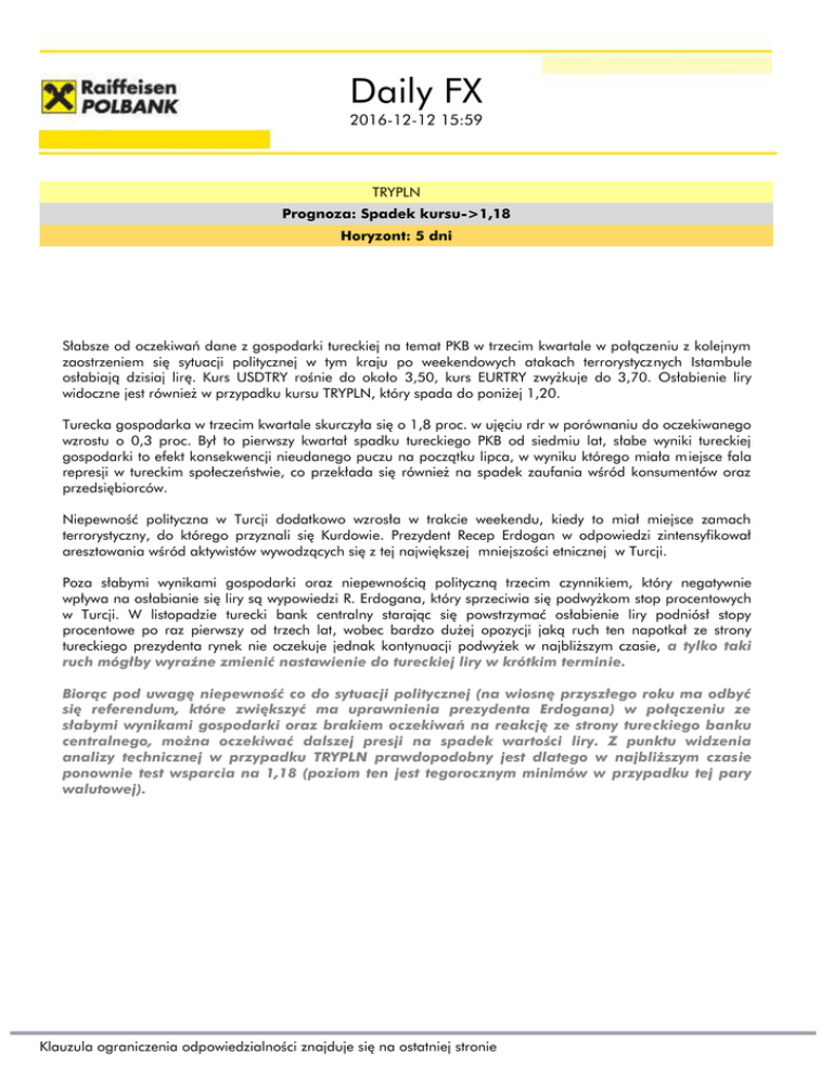 Daily FX 2016-12-12 15:59 TRYPLN Prognoza: Spadek kursu->1,18 Horyzont: 5 dni Słabsze od oczekiwań dane z gospodarki tureckiej na temat PKB w trzecim kwartale w połączeniu z kolejnym zaostrzeniem się sytuacji politycznej w tym kraju po weekendowych atakach terrorystycznych Istambule osłabiają dzisiaj lirę. Kurs USDTRY rośnie do około 3,50, kurs EURTRY zwyżkuje do 3,70. Osłabienie liry widoczne jest również w przypadku kursu TRYPLN, który spada do poniżej 1,20. Turecka gospodarka w trzecim kwartale skurczyła się o 1,8 proc. w ujęciu rdr w porównaniu do oczekiwanego wzrostu o 0,3 proc. Był to pierwszy kwartał spadku tureckiego PKB od siedmiu lat, słabe wyniki tureckiej gospodarki to efekt konsekwencji nieudanego puczu na początku lipca, w wyniku którego miała miejsce fala represji w tureckim społeczeństwie, co przekłada się również na spadek zaufania wśród konsumentów oraz przedsiębiorców. Niepewność polityczna w Turcji dodatkowo wzrosła w trakcie weekendu, kiedy to miał miejsce zamach terrorystyczny, do którego przyznali się Kurdowie. Prezydent Recep Erdogan w odpowiedzi zintensyfikował aresztowania wśród aktywistów wywodzących się z tej największej mniejszości etnicznej w Turcji. Poza słabymi wynikami gospodarki oraz niepewnością polityczną trzecim czynnikiem, który negatywnie wpływa na osłabianie się liry są wypowiedzi R. Erdogana, który sprzeciwia się podwyżkom stop procentowych w Turcji. W listopadzie turecki bank centralny starając się powstrzymać osłabienie liry podniósł stopy procentowe po raz pierwszy od trzech lat, wobec bardzo dużej opozycji jaką ruch ten napotkał ze strony tureckiego prezydenta rynek nie oczekuje jednak kontynuacji podwyżek w najbliższym czasie, a tylko taki ruch mógłby wyraźne zmienić nastawienie do tureckiej liry w krótkim terminie. Biorąc pod uwagę niepewność co do sytuacji politycznej (na wiosnę przyszłego roku ma odbyć się referendum, które zwiększyć ma uprawnienia prezydenta Erdogana) w połączeniu ze słabymi wynikami gospodarki oraz brakiem oczekiwań na reakcję ze strony tureckiego banku centralnego, można oczekiwać dalszej presji na spadek wartości liry. Z punktu widzenia analizy technicznej w przypadku TRYPLN prawdopodobny jest dlatego w najbliższym czasie ponownie test wsparcia na 1,18 (poziom ten jest tegorocznym minimów w przypadku tej pary walutowej). Klauzula ograniczenia odpowiedzialności znajduje się na ostatniej stronie Kalendarium Godz. Kraj Wskaźnik Ostateczna dana Prognoza Raiffeisen Średnia oczekiwań Poprzed ni 02:30 CN Inflacja CPI (listopad, %, r/r) 2,3 2,2 2,1 02:30 CN Inflacja PPI (listopad, %, r/r) 3,3 2,2 1,2 08:45 FR Produkcja przemysłowa (październik. %, m/m) -0,2 0,8 0,5 -1,1 16:00 USA Wskaźnik nastrojów Michigan (grudzień, pkt) 98,0 95,0 94,1 93,8 14:00 PL Inflacja CPI (listopad. %, r/r) WTOREK 13 GRUDNIA 11:00 D Wskaźnika zaufania ZEW (grudzień, pkt) ŚRODA 14 GRUDNIA 14,00 13,50 13,80 11:00 EZ Produkcja przemysłowa (październik, %, m/m) 0,00 0,20 -0,80 14:30 USA Sprzedaż detaliczna (listopad, %, m/m) 0,40 0,30 0,80 14:30 USA Inflacja PPI (listopad %, r/r) 0,90 0,80 15:15 USA Produkcja przemysłowa (listopad, %, m/m) -0,10 -0,20 0,00 20:00 USA Główna stopa proc. Fed (%) 0,75 0,75 0,50 Wskaźńik PMI w przemyśle (grudzień, pkt) 54,5 54,5 54,3 PIĄTEK 9 GRUDNIA PONIEDZIAŁEK 12 GRUDNIA 0,0 -0,20 CZWARTEK 15 GRUDNIA 09:30 DE 09:30 DE Wskaźńik PMI w usługach (grudzień, pkt) 54,0 54,8 55,1 10:00 EZ Wskaźńik PMI w przemyśle (grudzień, pkt) 53,4 53,6 53,7 10:00 EZ Wskaźńik PMI w usługach (grudzień, pkt) 53,5 53,7 53,8 14:30 USA Wskaźnik aktywności w stanie Nowy Jork (grudzień, pkt) 2,60 1,50 14:30 USA Inflacja CPI (listopad. %, r/r) 1,70 1,60 14:30 USA Wskaźnik aktywności w stanie Filadelfia (grudzień, pkt) 9,00 7,60 15:45 USA Wskaźńik PMI (grudzień, pkt) 14:30 USA Liczba nowych inwestycji w zakresie budowy domów (listopad. tys.) 1,80 54,1 PIĄTEK 16 GRUDNIA Źródło: Reuters; Bloomberg; prognozy Raiffeisen Bank Polska i Raiffeisen Research 1,175 1,230 1,323 TRYPLN Prognoza: Spadek kursu->1,18 Horyzont: 5 dni Źródło: Reuters, stan na 2016-12-12 15:40 Opór Kurs Wsparcie 1,2450 1,2400 1,2300 1,1990 1,1800 1,1600 1,1000 Kurs TRYPLN na przełomie października i listopada wyszedł dołem z kanału spadkowego, w którym przebywał od czwartego kwartału ubiegłego roku. Spadek kursu powstrzymywał do połowy listopada poziom 1,23. Po silnym osłabieniu w drugiej połowie listopada, kurs spadł jednak poniżej poziomu 1,21 wychodząc na nowe minima. Silniejszym wsparciem jest obecnie poziomu 1,18 (historyczne minimów intradeyowe z początku listopada). Kolejnym wsparciem powinien być region poziomu 1,15, gdzie obecnie przebiega linia długoterminowego trendu spadkowego oraz psychologiczny poziom 1,1. W przypadku wzrostu oporami będą okolice 1,23 (intradeyowy szczyt z grudnia); 1,24, gdzie przebiega dolne ograniczenie kanału, z którego TRYPLN wyszedł w ubiegłym tygodniu. Kolejnym zaś 1,245, gdzie przebiega 50-sesyjna średnia krocząca oraz okolice 1,27, gdzie przebiega górne ograniczenie kanału spadkowego, w którym kurs przebywał przez rok. Raport sporządził: Wojciech Stępień Analityk Rynków Finansowych Raiffeisen Polbank ul. Grzybowska 78, 00-844 Warszawa www.raiffeisenpolbank.com Departament Sprzedaży Rynków Finansowych Telefon: + 48 22 585 37 86 Faks: + 48 22 585 33 68 W razie pytań lub uwag dotyczących powyższej publikacji proszę o kontakt: [email protected] Dealing: Bydgoszcz tel.: (22) 585 37 73 Poznań tel.: (61) 655 47 51 Gdańsk tel.: (22) 585 37 71 Rzeszów tel.: (22) 585 37 75 Katowice tel.: (22) 585 37 69 Szczecin tel.: (22) 585 37 71 Kielce tel.: (22) 585 37 70 Toruń tel.: (22) 585 37 72 Kraków tel.: (22) 585 37 70 Warszawa tel.: (22) 585 37 79 Lublin tel.: (22) 585 37 75 Wrocław tel.: (22) 585 37 74 Łódź tel.: (22) 585 37 75 Zielona Góra tel.: (22) 585 37 