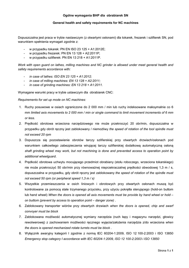 Ogólne wymagania BHP dla obrabiarek SN General health and safety requirements for NC machines Dopuszczalna jest praca w trybie nastawczym (z otwartymi osłonami) dla tokarek, frezarek i szlifierek SN, pod warunkiem spełnienia wymagań zgodnie z: - w przypadku tokarek: PN EN ISO 23 125 + A1:2012E; w przypadku frezarek: PN EN 13 128 + A2:2011P; w przypadku szlifierek: PN EN 13 218 + A1:2011P. Work with open guard on lathes, milling machines and NC grinder is allowed under meet general health and safety requirements accordance with: - in case of lathes: ISO EN 23 125 + A1:2012; in case of milling machines: EN 13 128 + A2:2011; in case of grinding machines: EN 13 218 + A1:2011. Wymagane warunki pracy w trybie ustawczym dla obrabiarek CNC: Requirements for set up mode on NC machines: 1. Ruchy posuwowe w osiach ograniczone do 2 000 mm / min lub ruchy indeksowane maksymalnie co 6 mm limited axis movements to 2 000 mm / min or single command to limit movement increments of 6 mm or less. 2. Prędkość obrotowa wrzeciona narzędziowego nie może przekroczyć 20 obr/min, dopuszczalna w przypadku gdy obrót ręczny jest zablokowany / niemożliwy the speed of rotation of the tool spindle must not exceed 20 rpm 3. Dopuszcza się pozostawienie obrotów tarczy szlifierskiej przy otwartych drzwiach/osłonach pod warunkiem całkowitego zabezpieczenia wirującej tarczy szlifierskiej dodatkową automatyczną osłoną shaft grinding wheel may work, but not machining is done and prevented access to operation point by additional wheelguard. 4. Prędkość obrotowa uchwytu mocującego przedmiot obrabiany (stołu roboczego, wrzeciona tokarskiego) nie może przekroczyć 50 obr/min przy równoważnej nieprzekraczalnej prędkości obwodowej 1,3 m / s, dopuszczalna w przypadku, gdy obrót ręczny jest zablokowany the speed of rotation of the spindle must not exceed 50 rpm (or peripheral speed 1,3 m / s) 5. Wszystkie przemieszczenia w osich liniowych i obrotowych przy otwartych osłonach muszą być kontrolowane za pomocą stale trzymanego przycisku, przy użyciu pokrętła sterującego (hold-on buttom lub hand wheel) When the doors is opened all axis movements must be provide by hand wheel or hold – on buttom (prevent by access to operation point – danger zone) . 6. Zablokowany transporter wiórów przy otwartych drzwiach when the doors is opened, chip and swarf convoyer must be block 7. Zablokowana możliwość automatycznej wymiany narzędzia (ruch łapy i magazynu narzędzi, głowicy rewolwerowej) z zachowaniem możliwości ręcznego wyjęcia/założenia narzędzia z/do wrzeciona when the doors is opened mechanized rotate turrets must be block . 8. Wyłącznik awaryjny kategorii I zgodnie z normą IEC 60204-1:2009, ISO 12 100-2:2003 i ISO 13850 Emergency stop category I accordance with IEC 60204-1:2009, ISO 12 100-2:2003 i ISO 13850 Strona 1 z 1