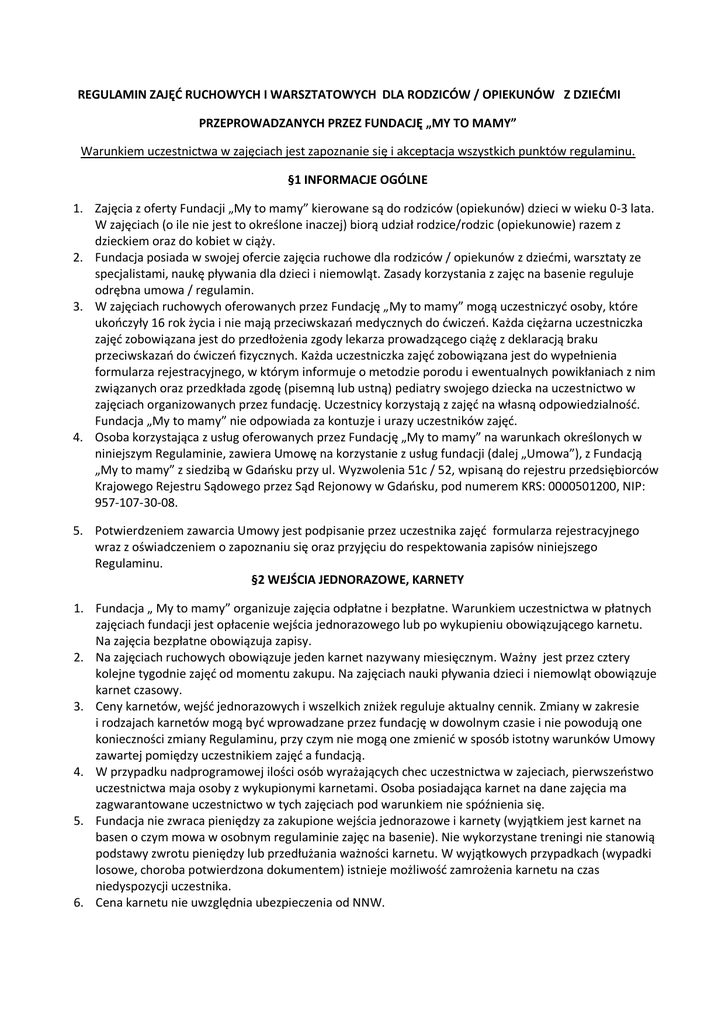 REGULAMIN ZAJĘĆ RUCHOWYCH I WARSZTATOWYCH DLA RODZICÓW / OPIEKUNÓW Z DZIEĆMI PRZEPROWADZANYCH PRZEZ FUNDACJĘ „MY TO MAMY” Warunkiem uczestnictwa w zajęciach jest zapoznanie się i akceptacja wszystkich punktów regulaminu. §1 INFORMACJE OGÓLNE 1. Zajęcia z oferty Fundacji „My to mamy” kierowane są do rodziców (opiekunów) dzieci w wieku 0-3 lata. W zajęciach (o ile nie jest to określone inaczej) biorą udział rodzice/rodzic (opiekunowie) razem z dzieckiem oraz do kobiet w ciąży. 2. Fundacja posiada w swojej ofercie zajęcia ruchowe dla rodziców / opiekunów z dziećmi, warsztaty ze specjalistami, naukę pływania dla dzieci i niemowląt. Zasady korzystania z zajęc na basenie reguluje odrębna umowa / regulamin. 3. W zajęciach ruchowych oferowanych przez Fundację „My to mamy” mogą uczestniczyć osoby, które ukończyły 16 rok życia i nie mają przeciwskazań medycznych do ćwiczeń. Każda ciężarna uczestniczka zajęć zobowiązana jest do przedłożenia zgody lekarza prowadzącego ciążę z deklaracją braku przeciwskazań do ćwiczeń fizycznych. Każda uczestniczka zajęć zobowiązana jest do wypełnienia formularza rejestracyjnego, w którym informuje o metodzie porodu i ewentualnych powikłaniach z nim związanych oraz przedkłada zgodę (pisemną lub ustną) pediatry swojego dziecka na uczestnictwo w zajęciach organizowanych przez fundację. Uczestnicy korzystają z zajęć na własną odpowiedzialność. Fundacja „My to mamy” nie odpowiada za kontuzje i urazy uczestników zajęć. 4. Osoba korzystająca z usług oferowanych przez Fundację „My to mamy” na warunkach określonych w niniejszym Regulaminie, zawiera Umowę na korzystanie z usług fundacji (dalej „Umowa”), z Fundacją „My to mamy” z siedzibą w Gdańsku przy ul. Wyzwolenia 51c / 52, wpisaną do rejestru przedsiębiorców Krajowego Rejestru Sądowego przez Sąd Rejonowy w Gdańsku, pod numerem KRS: 0000501200, NIP: 957-107-30-08. 5. Potwierdzeniem zawarcia Umowy jest podpisanie przez uczestnika zajęć formularza rejestracyjnego wraz z oświadczeniem o zapoznaniu się oraz przyjęciu do respektowania zapisów niniejszego Regulaminu. §2 WEJŚCIA JEDNORAZOWE, KARNETY 1. Fundacja „ My to mamy” organizuje zajęcia odpłatne i bezpłatne. Warunkiem uczestnictwa w płatnych zajęciach fundacji jest opłacenie wejścia jednorazowego lub po wykupieniu obowiązującego karnetu. Na zajęcia bezpłatne obowiązuja zapisy. 2. Na zajęciach ruchowych obowiązuje jeden karnet nazywany miesięcznym. Ważny jest przez cztery kolejne tygodnie zajęć od momentu zakupu. Na zajęciach nauki pływania dzieci i niemowląt obowiązuje karnet czasowy. 3. Ceny karnetów, wejść jednorazowych i wszelkich zniżek reguluje aktualny cennik. Zmiany w zakresie i rodzajach karnetów mogą być wprowadzane przez fundację w dowolnym czasie i nie powodują one konieczności zmiany Regulaminu, przy czym nie mogą one zmienić w sposób istotny warunków Umowy zawartej pomiędzy uczestnikiem zajęć a fundacją. 4. W przypadku nadprogramowej ilości osób wyrażających chec uczestnictwa w zajeciach, pierwszeństwo uczestnictwa maja osoby z wykupionymi karnetami. Osoba posiadająca karnet na dane zajęcia ma zagwarantowane uczestnictwo w tych zajęciach pod warunkiem nie spóźnienia się. 5. Fundacja nie zwraca pieniędzy za zakupione wejścia jednorazowe i karnety (wyjątkiem jest karnet na basen o czym mowa w osobnym regulaminie zajęc na basenie). Nie wykorzystane treningi nie stanowią podstawy zwrotu pieniędzy lub przedłużania ważności karnetu. W wyjątkowych przypadkach (wypadki losowe, choroba potwierdzona dokumentem) istnieje możliwość zamrożenia karnetu na czas niedyspozycji uczestnika. 6. Cena karnetu nie uwzględnia ubezpieczenia od NNW. 7. Karnet, ma charakter imienny i nie może być odstępowany innym osobom. Uprawnienia płynące z karnetu mają charakter osobisty i nie mogą być przenoszone na inne osoby. 8. Fundacja zastrzega sobie prawo do odwołania zajęć bez konieczności podawania powodu tej decyzji oraz proponowania dodatkowego terminu zajęć w ramach „odrobienia” nieodbytych. Fundacja może nie organizować zajęć w okresie świątecznym. §3 ZASADY UCZESTNICTWA W ZAJĘCIACH 1. Uczestnicy zajęć zobowiązani sa do prawidłowego przygotowania się na zajęcia. Na zajęciach ruchowych obowiązuje strój i obuwie sportowe, sprawny sprzęt (wózek na zajęciach z wózkiem, kije na zajęciach nordic walking), rekomendowane przez fundację nosidła i chusty. Zaleca się noszenie wlasnych ręczników, kocyków dla dzieci. O przygotowaniu na zajęcia warsztatowe uczestnicy informowani są każdorazowo przed dniem rozpoczęcia sie zajęć. 2. Fundacja i instruktor nie odpowiada za przedmioty pozostawione w szatni. 3. Użytkowanie sal, urządzeń sportowo-rekreacyjnych, pomieszczeń sanitarnych, wypożyczanego uczestnikowi przez fundację sprzętu oraz rekwizytów i materiałów warsztatowych powinno być zgodne z ich przeznaczeniem. Za dokonanie szkód lub zniszczenie sprzętu odpowiedzialność finansową (lub inną) ponosić będzie sprawca szkody. 4. Uczestnik zajęć zobowiązuje się do przestrzegania i zachowywania czystości oraz stosowania się do ogólnie przyjętych norm zachowania podczas zajęć przeprowadzanych przez fundację. Spożywanie alkoholu, palenie tytoniu oraz zażywanie jakichkolwiek środków psychoaktywnych podczas zajęć jest zabronione. 5. Uczestnik korzysta z usług fundacji na własną odpowiedzialność i nie może zgłaszać pod jej adresem żadnych roszczeń z tytułu uszkodzenia ciała lub utraty zdrowia w związku z uczestnictwem w zajęciach, chyba, że zostało to spowodowane przez fundację lub członków personelu fundacji, w sposób zawiniony. 6. Uczestnik zobowiązuje się do punktualnego stawiania się na zajęcia. 7. Zabrania się przynoszenia na zajęcia przedmiotów niebezpiecznych i innych przedmiotów, których po