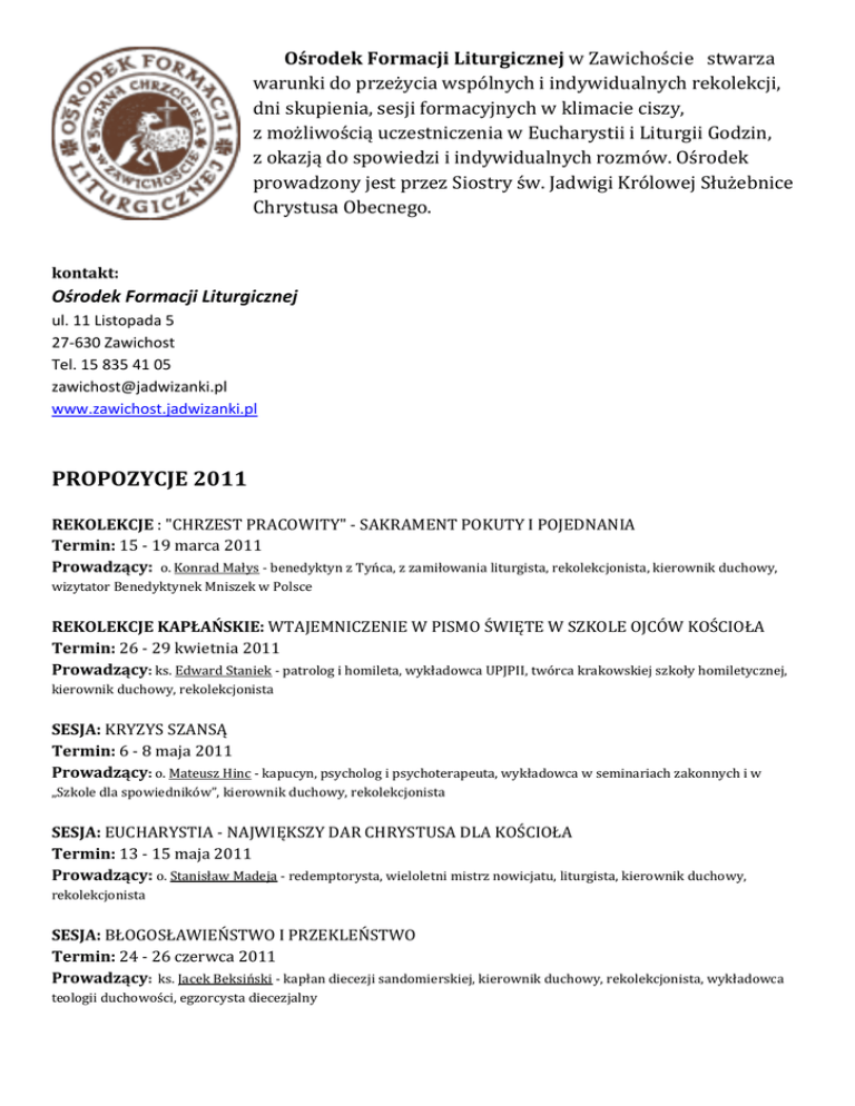 Ośrodek Formacji Liturgicznej w Zawichoście stwarza warunki do przeżycia wspólnych i indywidualnych rekolekcji, dni skupienia, sesji formacyjnych w klimacie ciszy, z możliwością uczestniczenia w Eucharystii i Liturgii Godzin, z okazją do spowiedzi i indywidualnych rozmów. Ośrodek prowadzony jest przez Siostry św. Jadwigi Królowej Służebnice Chrystusa Obecnego. kontakt: Ośrodek Formacji Liturgicznej ul. 11 Listopada 5 27-630 Zawichost Tel. 15 835 41 05 [email protected] www.zawichost.jadwizanki.pl PROPOZYCJE 2011 REKOLEKCJE : "CHRZEST PRACOWITY" - SAKRAMENT POKUTY I POJEDNANIA Termin: 15 - 19 marca 2011 Prowadzący: o. Konrad Małys - benedyktyn z Tyńca, z zamiłowania liturgista, rekolekcjonista, kierownik duchowy, wizytator Benedyktynek Mniszek w Polsce REKOLEKCJE KAPŁAŃSKIE: WTAJEMNICZENIE W PISMO ŚWIĘTE W SZKOLE OJCÓW KOŚCIOŁA Termin: 26 - 29 kwietnia 2011 Prowadzący: ks. Edward Staniek - patrolog i homileta, wykładowca UPJPII, twórca krakowskiej szkoły homiletycznej, kierownik duchowy, rekolekcjonista SESJA: KRYZYS SZANSĄ Termin: 6 - 8 maja 2011 Prowadzący: o. Mateusz Hinc - kapucyn, psycholog i psychoterapeuta, wykładowca w seminariach zakonnych i w „Szkole dla spowiedników”, kierownik duchowy, rekolekcjonista SESJA: EUCHARYSTIA - NAJWIĘKSZY DAR CHRYSTUSA DLA KOŚCIOŁA Termin: 13 - 15 maja 2011 Prowadzący: o. Stanisław Madeja - redemptorysta, wieloletni mistrz nowicjatu, liturgista, kierownik duchowy, rekolekcjonista SESJA: BŁOGOSŁAWIEŃSTWO I PRZEKLEŃSTWO Termin: 24 - 26 czerwca 2011 Prowadzący: ks. Jacek Beksiński - kapłan diecezji sandomierskiej, kierownik duchowy, rekolekcjonista, wykładowca teologii duchowości, egzorcysta diecezjalny SZKOŁA: SZKOŁA ZAKRYSTIANÓW Termin: 28 sierpnia - 2 września 2011 Prowadzący: s. Adelajda Sielepin - jadwiżanka wawelska, teolog, liturgista, wykładowca UPJPII, MWIK, kierownik Katedry Teologii Liturgii UPJPII ks. Bogusław Migut - prezbiter archidiecezji lubelskiej, liturgista, profesor KUL, długoletni redaktor naczelny Encyklopedii katolickiej, kierownik Katedry Duchowości Liturgicznej KUL o. Hieronim Kreis - benedyktyn z Tyńca, rekolekcjonista, mistrz ikebany (autor kilkutomowego podręcznika "Kwiaty w kościele. Tajemnice układania"), pisarz i poeta REKOLEKCJE: PRZEZ KOMUNIĘ Z BOGIEM DO KOMUNII Z CZŁOWIEKIEM - SAKRAMENT POKUTY I POJEDNANIA Termin: 26 - 30 września 2011 Prowadzący: o. Konrad Małys - benedyktyn z Tyńca, z zamiłowania liturgista, rekolekcjonista, kierownik duchowy, wizytator Benedyktynek Mniszek w Polsce SESJA: ZAKORZENIĆ SIĘ W NIM Termin: 28 - 30 października 2011 Prowadzący: ks. Robert Muszyński - kapłan archidiecezji lubelskiej, teolog duchowości, rekolekcjonista, kierownik duchowy, dyrektor Szkoły Formacji Duchowej w Lublinie, autor audycji radiowych REKOLEKCJE KAPŁAŃSKIE: W KOMUNII Z BOGIEM Termin: 9 - 12 listopada 2011 Prowadzący: ks. Michał Mierzwa - teolog, wykładowca, rekolekcjonista, kierownik duchowy, rektor Wyższego Seminarium Duchownego Świętych Cyryla i Metodego z Orchard Lake w Krakowie SESJA: SPOTKAĆ SIEBIE SAMEGO Termin: 18 - 20 listopada 2011 Prowadzący: o. Mateusz Hinc - kapucyn, psycholog i psychoterapeuta, wykładowca w seminariach zakonnych i w „Szkole dla spowiedników”, kierownik duchowy, rekolekcjonista REKOLEKCJE: ROZBUDZIĆ NA NOWO EUCHARYSTYCZNE ZDUMIENIE Termin: 26 - 30 listopada 2011 Prowadzący: o. Stanisław Madeja - redemptorysta, wieloletni mistrz nowicjatu, liturgista, kierownik duchowy, rekolekcjonista SESJA: GDY MSZA SIĘ KOŃCZY, MSZA SIĘ ZACZYNA Termin: 30 grudnia 2011 - 1 stycznia 2012 Prowadzący: o. Tomasz Grabowski - dominikanin, kierownik duchowy, rekolekcjonista, dyrektor Dominikańskiego Ośrodka Liturgicznego