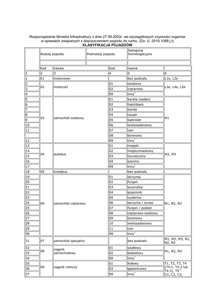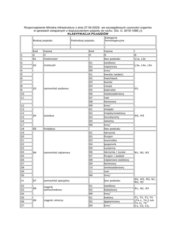 Rozporządzenie Ministra Infrastruktury z dnia 27.09.2003r. ws szczegółowych czynności organów w sprawach związanych z dopuszczeniem pojazdu do ruchu (Dz. U. 2016.1088 j.t) KLASYFIKACJA POJAZDÓW Rodzaj pojazdu Podrodzaj pojazdu Kategoria homologacyjna kod nazwa kod nazwa 1 2 3 4 5 6 1 01 motorower bez podziału L1e, L2e 2 01 osobowy 02 ciężarowy 4 99 inny * 5 01 kareta (sedan) 6 02 hatchback 7 03 kombi 04 coupe 05 kabriolet 10 06 wielozadaniowy 11 07 van 08 terenowy 12 99 inny* 13 01 miejski 02 międzymiastowy 03 turystyczny 16 04 szkolny 17 99 inny* 3 8 9 14 15 18 02 03 04 05 motocykl samochód osobowy autobus trolejbus 01 skrzynia 20 02 furgon 21 03 wywrotka 22 04 pojemnik 23 05 cysterna 06 skrzynia / żuraw 25 07 furgon / podest 26 08 ciężarowo-osobowy 27 09 terenowy 28 10 wielozadaniowy 29 11 van 30 99 inny* 31 32 33 06 samochód ciężarowy 07 samochód specjalny 08 ciągnik samochodowy 34 35 36 37 09 ciągnik rolniczy M1 M2, M3 bez podziału 19 24 L3e, L4e, L5e bez podziału 01 siodłowy 02 balastowy 99 inny* 01 kołowy 02 gąsienicowy 99 inny* N1, N2, N3 M1, M2, M3, N1, N2, N3 N1, N2, N3 T1, T2, T3, T4 (T4.1, T4.2 lub T4.3), T5** C1, C2, C3, C4 (C4.1, C4.2 lub C4.3), C5 38 01 ciężarowa 02 specjalna 40 99 inna* 41 01 skrzynia 42 02 furgon 43 03 wywrotka 44 04 pojemnik 05 cysterna 46 06 dłużycowa 47 07 niskopodwoziowa 48 08 wózek jednoosiowy podpierający naczepę 49 99 inna* 39 45 50 10 11 12 przyczepa lekka naczepa ciężarowa naczepa specjalna bez podziału 51 01 skrzynia 52 02 furgon 53 03 wywrotka 54 04 pojemnik 55 05 cysterna 56 06 dłużycowa 57 07 niskopodwoziowa 58 99 inna* 59 13 14 przyczepa ciężarowa przyczepa specjalna bez podziału O1 O2, O3, O4 O2, O3, O4 O2, O3, O4 O2, O3, O4 60 01 skrzynia 61 02 furgon 62 03 wywrotka 04 pojemnik 64 05 cysterna 65 06 dłużycowa 66 07 niskopodwoziowa 67 99 inna* 01 czterokołowiec L7e 02 czterokołowiec lekki L6e 99 inny* 63 68 69 15 16 przyczepa ciężarowa rolnicza samochodowy inny 70 71 17 pojazd wolnobieżny-kolejka turystyczna*** 01 bez podziału 72 18 ciągnik rolniczy-kolejka turystyczna*** 01 bez podziału 73 19 przyczepa-kolejka turystyczna*** 01 bez podziału R1, R2, R3, R4 (każda z tych kategorii z indeksem "a" lub "b")** Tabela nr 2 - Przeznaczenia pojazdów ze względu na specjalizację, z wyjątkiem pojazdów specjalnych Lp. Podrodzaj pojazdu Przeznaczenie kod nazwa kod nazwa 1 2 3 4 5 1 02 furgon 001 uniwersalny 2 002 izotermiczny 3 003 chłodnia 4 004 lodownia 5 005 przewóz mebli 6 006 przewóz konfekcji 7 007 przewóz pieczywa 8 008 pocztowy 9 099 inny* 10 05 cysterna 101 przewóz paliw płynnych 11 102 przewóz mleka 12 103 przewóz wody 13 104 przewóz gazów 14 199 inna* 15 04 pojemnik 201 betoniarka 16 202 przewóz bitumu 17 203 przewóz cementu luzem 18 204 przewóz sypkich artykułów spożywczych 19 205 asenizacyjny 20 21 299 inny* 99 inny 301 przewóz żywego drobiu 22 302 przewóz żywych zwierząt 23 303 przewóz kabli 24 304 przewóz napojów 25 305 przewóz elementów budowlanych 26 306 przewóz kontenerów 27 307 przewóz pojazdów 28 308 wywóz śmieci 29 309 utylizacyjny 30 399 przewóz innych ładunków Tabela nr 3 - Przeznaczenia pojazdów specjalnych Lp. Kod Nazwa 1 2 3 1 501 oczyszczanie dróg 2 502 zimowego utrzymania dróg 3 503 podnośnik do prac konserwacyjno-montażowych 4 504 pomoc drogowa 5 505 ambulatorium/laboratorium służby zdrowia 6 506 żuraw samochodowy 7 507 pożarniczy 8 508 pogotowie techniczne/warsztat 9 509 kino/wystawa/biblioteka 10 510 sklep/bar 11 511 radiofoniczny/telewizyjny 12 512 do prac wiertniczych 13 513 agregat elektryczny/spawalniczy 14 514 kempingowy 15 515 pogrzebowy 16 516 laboratorium techniczne 17 517 koparka 18 518 koparko-spycharka 19 519 ładowarka 20 520 bankowóz 21 521 sanitarny 22 599 inny* Tabela nr 4 - Przeznaczenia pojazdów używanych do określonych celów Lp. Kod 1 Nazwa 2 3 1 703 operacyjny służby miejskiej zakładów komunikacyjnych itp. 2 704 przewóz osób niepełnosprawnych 3 705 pojazd ratownictwa chemicznego 4 706 pojazd górniczego pogotowia ratunkowego 5 707 przystosowany do przewozu osób (dotyczy tylko samochodów ciężarowych oraz przyczep wchodzących w skład kolejki turystycznej) 6 708 pojazd służby więziennej 7 709 przewóz uczniów (w tym niepełnosprawnych) 8 799 inny* Objaśnienia: Pojazd, który na podstawie dokumentu, o którym mowa w art. 72 ust. 1 pkt 3 ustawy, albo wyciągu ze świadectwa homologacji albo zaświadczenia o przeprowadzonym badaniu technicznym pojazdu, zakwalifikowano do danego podrodzaju pojazdu lub przeznaczenia nieokreślonego w zasadniczym podziale. ** Dla ciągników rolniczych i przyczep homologowanych przed dniem 6 stycznia 2006 r. mogą być nieokreślone kategorie homologacyjne. *** Dotyczy wyłącznie pojazdu wchodzącego w skład kolejki turystycznej, o której mowa w art. 2 pkt 49a ustawy. *