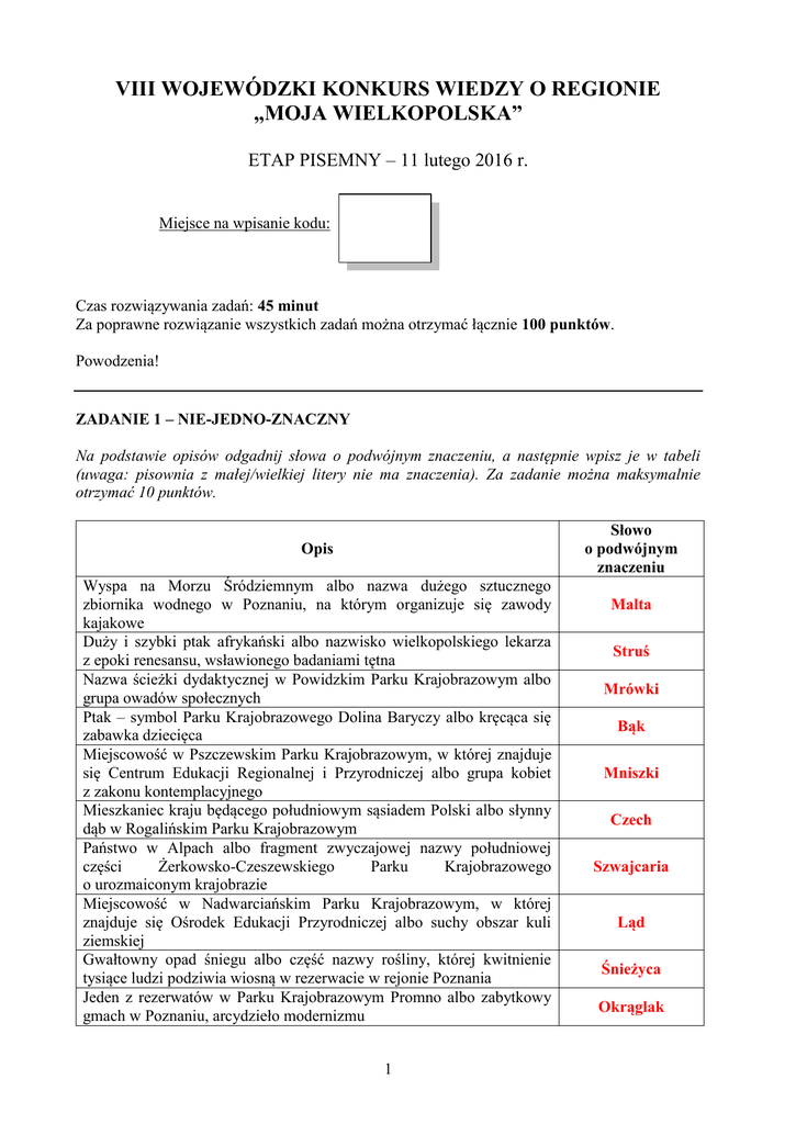 VIII WOJEWÓDZKI KONKURS WIEDZY O REGIONIE „MOJA WIELKOPOLSKA” ETAP PISEMNY – 11 lutego 2016 r. Miejsce na wpisanie kodu: Czas rozwiązywania zadań: 45 minut Za poprawne rozwiązanie wszystkich zadań można otrzymać łącznie 100 punktów. Powodzenia! ZADANIE 1 – NIE-JEDNO-ZNACZNY Na podstawie opisów odgadnij słowa o podwójnym znaczeniu, a następnie wpisz je w tabeli (uwaga: pisownia z małej/wielkiej litery nie ma znaczenia). Za zadanie można maksymalnie otrzymać 10 punktów. Słowo o podwójnym znaczeniu Opis Wyspa na Morzu Śródziemnym albo nazwa dużego sztucznego zbiornika wodnego w Poznaniu, na którym organizuje się zawody kajakowe Duży i szybki ptak afrykański albo nazwisko wielkopolskiego lekarza z epoki renesansu, wsławionego badaniami tętna Nazwa ścieżki dydaktycznej w Powidzkim Parku Krajobrazowym albo grupa owadów społecznych Ptak – symbol Parku Krajobrazowego Dolina Baryczy albo kręcąca się zabawka dziecięca Miejscowość w Pszczewskim Parku Krajobrazowym, w której znajduje się Centrum Edukacji Regionalnej i Przyrodniczej albo grupa kobiet z zakonu kontemplacyjnego Mieszkaniec kraju będącego południowym sąsiadem Polski albo słynny dąb w Rogalińskim Parku Krajobrazowym Państwo w Alpach albo fragment zwyczajowej nazwy południowej części Żerkowsko-Czeszewskiego Parku Krajobrazowego o urozmaiconym krajobrazie Miejscowość w Nadwarciańskim Parku Krajobrazowym, w której znajduje się Ośrodek Edukacji Przyrodniczej albo suchy obszar kuli ziemskiej Gwałtowny opad śniegu albo część nazwy rośliny, której kwitnienie tysiące ludzi podziwia wiosną w rezerwacie w rejonie Poznania Jeden z rezerwatów w Parku Krajobrazowym Promno albo zabytkowy gmach w Poznaniu, arcydzieło modernizmu 1 Malta Struś Mrówki Bąk Mniszki Czech Szwajcaria Ląd Śnieżyca Okrąglak ZADANIE 2 – CZYJE TO DZIEŁO? Uzupełnij tabelę wpisując obok imienia i nazwiska znanego Wielkopolanina oznaczenie literowe pasującej do niego charakterystyki oraz tytuł dzieła (np. książki, rzeźby, sztuki teatralnej), którego jest autorem. Za zadanie można maksymalnie otrzymać 16 punktów. Imię i nazwisko znanego Wielkopolanina Wojciech Bogusławski Oznaczenie literowe charakterystyki osoby C „Cud mniemany, czyli Krakowiacy i Górale” Arkady Fiedler H „Kanada pachnąca żywicą” Józef Kostrzewski D „Wielkopolska w czasach prehistorycznych” Marceli Motty B „Przechadzki po mieście” Feliks Nowowiejski G „Rota” Marcin Rożek E „Siewca” Józef Struś A „Nauki o tętnie ksiąg pięcioro…” Józef Wybicki F „Pieśń Legionów Polskich we Włoszech” Tytuł dzieła TYTUŁY DZIEŁ DO WYBORU: „Cud mniemany, czyli Krakowiacy i Górale” (sztuka teatralna), „Nauki o tętnie ksiąg pięcioro…”, „Kanada pachnąca żywicą”, „Pieśń Legionów Polskich we Włoszech” (słowa), „Przechadzki po mieście”, „Rota” (melodia), „Siewca” (rzeźba), „Wielkopolska w czasach prehistorycznych”. CHARAKTERYSTYKI OSÓB DO WYBORU: A – Znany lekarz i humanista epoki renesansu. Wykształcenie zdobywał w Poznaniu, Krakowie i Padwie. Na polecenie króla Zygmunta Starego przez pewien czas przebywał na Węgrzech, gdzie prowadził praktykę lekarską na dworze królewskim. Był również nadwornym lekarzem króla Zygmunta Augusta. Zmarł w czasie epidemii dżumy. B – Pochodził ze spolszczonej rodziny francuskiej, jako nauczyciel pracował w kilku poznańskich szkołach, udzielał się społecznie w Towarzystwie Pomocy Naukowej i Poznańskim Towarzystwie Przyjaciół Nauk. Napisał dwa zbiory felietonów stanowiące doskonałe źródło wiedzy o dawnym Poznaniu. C – Urodził się w Glinnie koło Poznania, uznawany jest za ojca teatru polskiego. Był dyrektorem teatrów w Warszawie i Lwowie. W 1783 r. założył w Poznaniu pierwszy stały zespół teatralny. D – Archeolog, od 1920 roku profesor Uniwersytetu Poznańskiego. Swoje badania koncentrował na epokach brązu i żelaza oraz początkach Słowiańszczyzny. Prowadził prace wykopaliskowe m.in. w Biskupinie i Gnieźnie. E – Studiował w Berlinie i Monachium. Pierwszą własną pracownię rzeźbiarską założył w Poznaniu, później przeprowadził się do Wolsztyna i zamieszkał w zaprojektowanej przez siebie willi. Jest autorem m.in. pomnika Bolesława Chrobrego w Gnieźnie. F – Prawnik i działacz polityczny. W latach 80. XVIII wieku zakupił majątek w Manieczkach pod Śremem, gdzie gospodarował na roli oraz poświęcał się twórczości literackiej. W 1806 r. na polecenie Napoleona razem z gen. Henrykiem Dąbrowskim organizował w Wielkopolsce powstanie przeciwko Prusakom. 2 G – Kompozytor i dyrygent. Był organizatorem i kierownikiem poznańskich chórów. Komponował m.in. oratoria, symfonie orkiestrowe i organowe, uwertury, balety i opery. Został pochowany w Krypcie Zasłużonych Wielkopolan w Poznaniu. H – Podróżował do odległych zakątków świata, początkowo jako przyrodnik zbierający okazy fauny dla polskich placówek zoologicznych, później jako podróżnik i literat. Podczas II wojny światowej przebywał w Anglii jako korespondent wojenny. Obecnie w jego domu znajduje się muzeum. ZADANIE 3 – NAJWIĘKSZE MIASTA Dopasuj największe miasta województwa wielkopolskiego do odpowiednich grup, wpisując w poszczególnych komórkach tabeli literę „T” (TAK), jeśli miasto należy do danej grupy (uwaga: miasto może nie należeć do żadnej grupy). Za zadanie można maksymalnie otrzymać 14 punktów. T T T Miasta na prawach powiatu (powiaty grodzkie) T T T Stolice archidiecezji lub diecezji kościoła katolickiego T T Leszno Stolice województw w latach 1975-1998 Gniezno T Ostrów Wlkp. Miasta, które tradycyjnie uznaje się za dawne stolice Polski Piła Konin Cecha wyróżniająca grupę miast Kalisz Poznań Nazwa miasta T T T T T ZADANIE 4 – NA SZLAKU Do nazwy szlaku dopasuj nazwę parku, przez który przebiega (uwaga: szlak może te