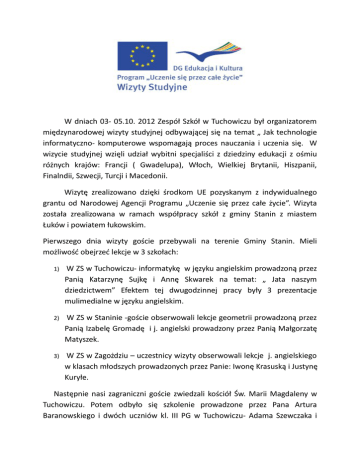 W dniach 03- 05.10. 2012 Zespół Szkół w Tuchowiczu był organizatorem międzynarodowej wizyty studyjnej odbywającej się na temat „ Jak technologie informatyczno- komputerowe wspomagają proces nauczania i uczenia się. W wizycie studyjnej wzięli udział wybitni specjaliści z dziedziny edukacji z ośmiu różnych krajów: Francji ( Gwadelupa), Włoch, Wielkiej Brytanii, Hiszpanii, Finalndii, Szwecji, Turcji i Macedonii. Wizytę zrealizowano dzięki środkom UE pozyskanym z indywidualnego grantu od Narodowej Agencji Programu „Uczenie się przez całe życie”. Wizyta została zrealizowana w ramach współpracy szkół z gminy Stanin z miastem Łuków i powiatem łukowskim. Pierwszego dnia wizyty goście przebywali na terenie Gminy Stanin. Mieli możliwość obejrzeć lekcje w 3 szkołach: 1) W ZS w Tuchowiczu- informatykę w języku angielskim prowadzoną przez Panią Katarzynę Sujkę i Annę Skwarek na temat: „ Jata naszym dziedzictwem” Efektem tej dwugodzinnej pracy były 3 prezentacje mulimedialne w języku angielskim. 2) W ZS w Staninie -goście obserwowali lekcje geometrii prowadzoną przez Panią Izabelę Gromadę i j. angielski prowadzony przez Panią Małgorzatę Matyszek. 3) W ZS w Zagożdziu – uczestnicy wizyty obserwowali lekcje j. angielskiego w klasach młodszych prowadzonych przez Panie: Iwonę Krasuską i Justynę Kuryłe. Następnie nasi zagraniczni goście zwiedzali kościół Św. Marii Magdaleny w Tuchowiczu. Potem odbyło się szkolenie prowadzone przez Pana Artura Baranowskiego i dwóch uczniów kl. III PG w Tuchowiczu- Adama Szewczaka i Piotra Borowca na temat: Jak tworzyć, edytować, publikować i udostępniać dokumenty on- line?. Po wspaniałym obiedzie w ZS w Staninie (słowa podziękowania dla Dyrektora Zespołu Szkół w Staninie- Pana Janusza Sobiecha) nasi goście spotkali się z władzami naszej gminy- Panią Wójt Ewą Niebrzegowską, gdzie obejrzeli prezentacje multmedialne o gminie i szkołach, w których obserwowali lekcje. Uczestnicy wizyty wysłuchali też wykładu Pana Marcina Klebana, wykładowcy UJ na temat wdrażania i wykorzystywania technologii ICT w procesie kształcenia nauczycieli języków obcych. Potem wszyscy udali się do szkoły w Tuchowiczu, gdzie troje uczestników z Francji, Wielkiej Brytanii i Finlandii przedstawiło prezentacje multmedialne na temat wykorzystywania technologii ICT i systemów edukacji w ich krajach. O godzinie 1900 w budynku Centrum Społeczno-Kulturalnego odbyła się uroczysta kolacja. Wzięło w niej udział około 70 osób. Wśród zaproszonych gości byli m.in. burmistrz Łukowa – Pan Dariusz Szustek, wicestarosta łukowski- Pan Krzysztof Tymoszuk, wicewójt Gminy Stanin- Pani Ewa Niebrzegowska, dyrektorzy szkół z Łukowa i Gminy Stanin, nauczyciele ZS w Tuchowicz. Obecni moli podziwiać występy miejscowego zespołu tanecznego „Kropelki Rosy” prowadzonego przez Panią Renatę Pawlikowską. Dzieci zaprezentowały wiązankę polskich tańców narodowych, wśród nich dostojnego poloneza. Wykonały kilka pieśni ludowych. Goście byli podejmowani przez Panią Bożenę Stępniewską- Szewczak- Dyrektora Zespołu Szkół w Tuchowiczu- tradycyjnymi potrawami regionalnymi: parowańcami z soczewicą, pyzami, żurkiem, swojskimi wędlinami i przepysznym ciastem upieczonym przez mamy z Rady Rodziców. Wszyscy bawili się doskonale. Andre Hambler- uczestnik wizyty – nauczyciel akademicki z Wielkiej Brytanii -tak ocenił tę wizytę: Jestem pod ogromnym wrażeniem poziomu nauczania języka angielskiego w polskich szkołach, mogłem z wieloma osobami swobodnie rozmawiać. To, co nas również zaskoczyło, to niesamowicie ciepłe przyjęcie oraz smaczne jedzenie serwowane w Tuchowiczu. Drugiego i trzeciego dnia goście przebywali w Łukowie ,goszcząc pierwszego dnia w przedszkolach i szkołach miejskich, zaś drugiego w szkołach ponadgimnazjalnych . Na uwagę zasługuje fakt, że dwóch uczniów ZS w Tuchowiczu- Adam Szewczak i Piotr Borowiec- w trzecim dniu wizyty zaprezentowali jej uczestnikom prezentację multmedialną w języku angielskim na temat,jakie technologie ICT i aplikacje stosują w procesie uczenia się. Organizacja tej wizyty wymagała od nas wszystkich dużego nakładu pracy, ale opłacało się. Mieliśmy okazję porównać polskie szkolnictwo z innymi. Dowiedzieliśmy się również, że nasze szkoły w oczach obcokrajowców są czyste i zadbane, jest w nich mało problemów wychowawczych. Kolejnym plusem wizyty było obalenie mitu, że szkoła na wsi prezentuje niski poziom. Zagraniczni goście dostrzegli w nas ogromny potencjał. Mamy powody do dumy, bo nie pozostajemy w tyle, a w wielu dziedzinach wyprzedzamy rówieśników z Europy mimo mizernego wyposażenia, w porównaniu do krajów zachodnich. Osiągnięcie sukcesu nie byłoby możliwe bez zaangażowania Rady Rodziców i wielu nauczycieli, którzy wspólnie pracowali kilka dnia na to, aby goście wywieźli z Polski jak najlepsze wspomnienia. Jak było zobaczcie na załączonych zdjęciach.