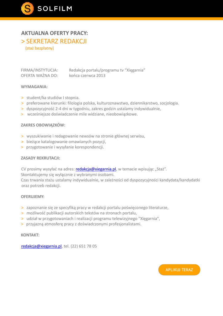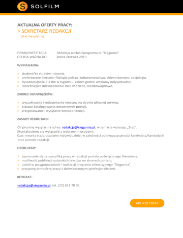 AKTUALNA OFERTY PRACY: > SEKRETARZ REDAKCJI (staż bezpłatny) FIRMA/INSTYTUCJA: OFERTA WAŻNA DO: Redakcja portalu/programu tv “Xięgarnia” końca czerwca 2013 WYMAGANIA: > > > > student/ka studiów I stopnia. preferowane kierunki: filologia polska, kulturoznawstwo, dziennikarstwo, socjologia. dyspozycyjność 2-4 dni w tygodniu, zakres godzin ustalamy indywidualnie, wcześniejsze doświadczenie mile widziane, nieobowiązkowe. ZAKRES OBOWIĄZKÓW: > wyszukiwanie i redagowanie newsów na stronie głównej serwisu, > bieżące katalogowanie omawianych pozycji, > przygotowanie i wysyłanie korespondencji. ZASADY REKRUTACJI: CV prosimy wysyłać na adres: [email protected], w temacie wpisując „Staż”. Skontaktujemy się wyłącznie z wybranymi osobami. Czas trwania stażu ustalamy indywidualnie, w zależności od dyspozycyjności kandydata/kandydatki oraz potrzeb redakcji. OFERUJEMY: > > > > zapoznanie się ze specyfiką pracy w redakcji portalu poświęconego literaturze, możliwość publikacji autorskich tekstów na stronach portalu, udział w przygotowaniach i realizacji programu telewizyjnego "Xięgarnia", przyjazną atmosferę pracy z doświadczonymi profesjonalistami. KONTAKT: [email protected], tel. (22) 651 78 05