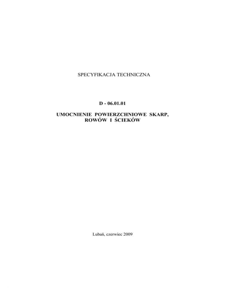 SPECYFIKACJA TECHNICZNA D - 06.01.01 UMOCNIENIE POWIERZCHNIOWE SKARP, ROWÓW I ŚCIEKÓW Lubań, czerwiec 2009 SPIS TREŚCI 1. WSTĘP ....................................................................................................................... 2. MATERIAŁY............................................................................................................. 3. SPRZĘT...................................................................................................................... 4. TRANSPORT ............................................................................................................. 5. WYKONANIE ROBÓT............................................................................................. 6. KONTROLA JAKOŚCI ROBÓT ............................................................................. 7. OBMIAR ROBÓT ..................................................................................................... 8. ODBIÓR ROBÓT ...................................................................................................... 9. PODSTAWA PŁATNOŚCI ....................................................................................... 10. PRZEPISY ZWIĄZANE............................................................................................ D-06.01.01 Umocnienie powierzchniowe skarp, rowów i ścieków 3 1. WSTĘP 1.1. Przedmiot ST Przedmiotem niniejszej specyfikacji technicznej (ST) są wymagania dotyczące wykonania i odbioru robót związanych z przeciwerozyjnym umocnieniem powierzchniowym skarp, rowów i ścieków. 1.2. Zakres stosowania ST Specyfikacja techniczna (ST) stanowi dokument przetargowy i kontraktowy przy zlecaniu i realizacji robót na drogach krajowych, wojewódzkich, powiatowych i gminnych. 1.3. Zakres robót objętych ST Ustalenia zawarte w niniejszej specyfikacji dotycz ą zasad prowadzenia robót związanych z trwałym powierzchniowym umocnieniem skarp, rowów i ścieków następującymi sposobami: − darniowaniem; − brukowaniem; − zastosowaniem elementów prefabrykowanych; Ustalenia ST nie dotyczą umocnienia zboczy skalnych (z ochron ą przed obwałami kamieni), skarp wymagających zbrojenia lub obudowy oraz skarp okresowo lub trwale omywanych wodą. 1.4. Określenia podstawowe 1.4.1. Rów - otwarty wykop, który zbiera i odprowadza wodę. 1.4.2. Darnina - płat lub pasmo wierzchniej warstwy gleby, przerośniętej i związanej korzeniami roślinności trawiastej. 1.4.3. Darniowanie - pokrycie darniną powierzchni korpusu drogowego w taki sposób, aby darnina w sposób trwały związała się z podłożem systemem korzeniowym. Darniowanie kożuchowe wykonuje się na płask, pasami poziomymi, układanymi w rzędach równoległych z przewiązaniem szczelin pomiędzy poszczególnymi płatami. Darniowanie w kratę (krzyżowe) wykonuje się w postaci pasów darniny układanych pod kątem 45o, ograniczających powierzchnie skarpy o bokach np. 1,0 x 1,0 m, które wypełnia się ziemią roślinną i zasiewa trawą. 1.4.4. Brukowiec - kamień narzutowy nieobrobiony (otoczak) lub obrobiony w kształcie nieregularnym i zaokrąglonych krawędziach. 1.4.5. Prefabrykat - element wykonany w zakładzie przemysłowym, który po zmontowaniu na budowie stanowi umocnienie skarpy, rowu lub ścieku. 1.4.6. Pozostałe określenia podstawowe są zgodne z odpowiednimi polskimi normami i z definicjami podanymi w OST D-M-00.00.00 „Wymagania ogólne” pkt 1.4. 1.5. Ogólne wymagania dotyczące robót Ogólne wymagania dotyczące robót podano w OST D-M-00.00.00 „Wymagania ogólne” pkt 1.5. 2. MATERIAŁY 2.1. Ogólne wymagania dotyczące materiałów Ogólne wymagania dotyczące materiałów, ich pozyskiwania i składowania, podano w OST D-M00.00.00 „Wymagania ogólne” pkt 2. Umocnienie powierzchniowe skarp, rowów i ścieków 4 D-06.01.01 2.2. Rodzaje materiałów − − − − − − − Materiałami stosowanymi przy umacnianiu skarp, rowów i ścieków objętymi niniejszą OST są: darnina, brukowiec, szpilki, paliki i pale, kruszywo, cement, zaprawa cementowa, elementy prefabrykowane, 2.3. Darnina Darninę należy wycinać z obszarów położonych najbliżej miejsca wbudowania. Cięcie należy przeprowadzać przy użyciu specjalnych pługów i krojów. Płaty lub pasma wyciętej darniny, w zależności od gruntu na jakim będą układane, powinny mieć szerokość od 25 do 50 cm i grubość od 6 do 10 cm. Wycięta darnina powinna być w krótkim czasie wbudowana. Darninę, jeżeli nie jest od razu wbudowana, należy układać warstwami w stosy, stroną porostu do siebie, na wysokość nie większą niż 1 m. Ułożone stosy winny być utrzymywane w stanie wilgotnym w warunkach zabezpieczających darninę przed zanieczyszczeniem, najwyżej przez 30 dni. 2.4. Brukowiec Brukowiec powinien odpowiadać wymaganiom PN-B-11104:1960 [1]. 2.5. Szpilki do przybijania darniny Szpilki do przybijania darniny powinny być wykonane z gałęzi, żerdzi lub drewna szczapowego. Szpilki powinny być proste, ostro zaciosane. Grubość szpilek powinna wynosić od 1,5 do 2,5 cm, a długość od 20 do 30 cm. 2.6. Kruszywo Żwir i mieszanka powinny odpowiadać wymaganiom PN-B-11111:1996 [2]. Piasek powinien odpowiadać wymaganiom PN-B-11113:1996 [3]. 2.7. Cement Cement portlandzki powinien odpowiadać wymaganiom PN-B-19701:1997 [7]. Cement hutniczy powinien odpowiadać wymaganiom PN-B-19701:1997 [7]. Składowanie cementu powinno być zgodne z BN-88/6731-08 [12]. 2.8. Zaprawa cementowa Przy wykonywaniu umocnień rowów i ścieków należy stosować zaprawy cementowe zgodne z wymaganiami PN-B-14501:1990 [6]. 2.9. Elementy prefabrykowane Wytrzymałość, kształt i wymiary elementów powinny być zgodne z dokumentacją projektową i ST. Krawężniki betonowe powinny odpowiadać wymaganiom BN-80/6775-03/04 [13]. 2.10. Dyble betonowe Kształt i wymiary dybli betonowych DC-15 i DP - 15 wg „Katalog powtarzalnych elementów drogowych (KPED)” – T
