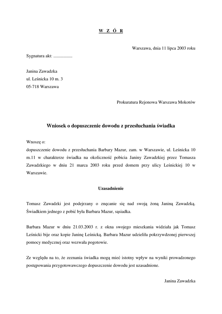 W Z Ó R Warszawa, dnia 11 lipca 2003 roku Sygnatura akt: ................. Janina Zawadzka ul. Leśnicka 10 m. 3 05-718 Warszawa Prokuratura Rejonowa Warszawa Mokotów Wniosek o dopuszczenie dowodu z przesłuchania świadka Wnoszę o: dopuszczenie dowodu z przesłuchania Barbary Mazur, zam. w Warszawie, ul. Leśnicka 10 m.11 w charakterze świadka na okoliczność pobicia Janiny Zawadzkiej przez Tomasza Zawadzkiego w dniu 21 marca 2003 roku przed domem przy ulicy Leśnickiej 10 w Warszawie. Uzasadnienie Tomasz Zawadzki jest podejrzany o znęcanie się nad swoją żoną Janiną Zawadzką. Świadkiem jednego z pobić była Barbara Mazur, sąsiadka. Barbara Mazur w dniu 21.03.2003 r. z okna swojego mieszkania widziała jak Tomasz Leśnicki bije oraz kopie Janinę Leśnicką. Barbara Mazur udzieliła pokrzywdzonej pierwszej pomocy medycznej oraz wezwała pogotowie. Ze względu na to, że zeznania świadka mogą mieć istotny wpływ na wyniki prowadzonego postępowania przygotowawczego dopuszczenie dowodu jest uzasadnione. Janina Zawadzka