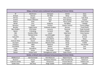 Sklepy, w których można zrealizować kartę prezentową CH Atrium Felicity 4F 50 Style AB Foto Auchan Badura Bartek Benetton Bershka Bijou Brigitte Bytom C&A Carry Carte d'Or CCC Centrum Wina City Sport Cleopatra Coccodrillo Cropp Cubus Dastan Deichmann Diverse Douglas Dream Collection Duka Ecco Empik English Home Erbil Kebab E-Smoking Excellent Office Fabryka Formy Gatta Gino Rossi Grycan Gusto Dominium H&M Hebe Home&You House Ichiban Sushi Intersport Mr WOK Itaka Kazar KFC Kolporter Komfort Krakowski Kredens Lancerto La Vantil Lavard Lee & Wrangler Leopardus Leroy Merlin Martes Sport Massimo Dutti Medicine Mohito Monnari New Yorker Niewęgłowski Jubiler Ochnik Olimp Pako Lorente Paris Optique Pierre Cardin Pull &Bear Quattro Fashion Recman Reserved Ryłko Salad Story Sapaya Saturn Sephora Shape Sinsay Smyk Solar Stradivarius Subway Super-Pharm Swiss Takko Tally Weijl Taranko Time Trend T-Mobile Tommy Hilfiger Travel Planet Twoje Soczewki Villeroy & Boch Vision Express Vistula W. Kruk Wojas Wólczanka X-KOM Yves Rocher Zara Ziaja Stoiska, w których można zrealizować kartę prezentową CH Atrium Felicity AlleBeauty.pl Biżuteria Cukiernia Vanilla Golden Rose H2A Kosmetyki Hurom Inglot Jelly Shop Kimi Manicure Kreatywne Maluchy Kwiaciarnia Magic bubble Myjnia Estyma Palm Smoothie Bar Prezent Marzeń Strefa Galanterii Świat spinek Teletorium Telakces.com z Maroka