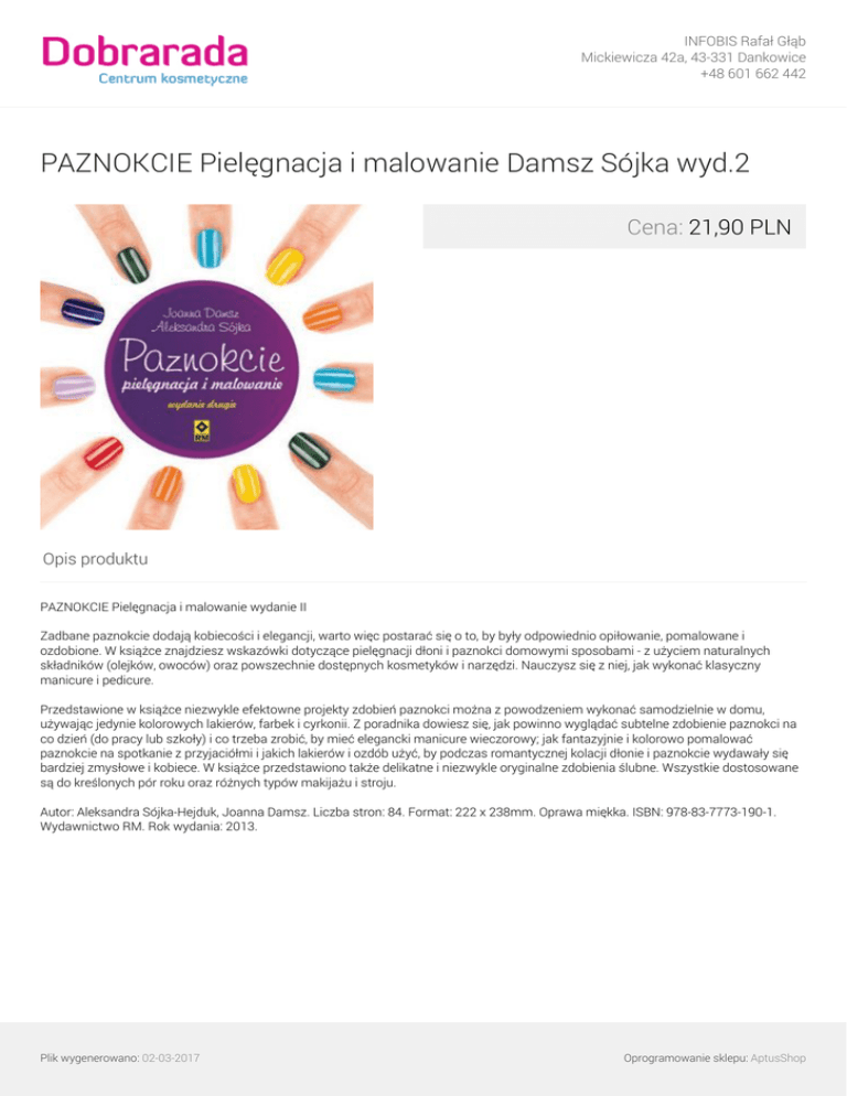 INFOBIS Rafał Głąb Mickiewicza 42a, 43-331 Dankowice +48 601 662 442 PAZNOKCIE Pielęgnacja i malowanie Damsz Sójka wyd.2 Cena: 21,90 PLN Opis produktu PAZNOKCIE Pielęgnacja i malowanie wydanie II Zadbane paznokcie dodają kobiecości i elegancji, warto więc postarać się o to, by były odpowiednio opiłowanie, pomalowane i ozdobione. W książce znajdziesz wskazówki dotyczące pielęgnacji dłoni i paznokci domowymi sposobami - z użyciem naturalnych składników (olejków, owoców) oraz powszechnie dostępnych kosmetyków i narzędzi. Nauczysz się z niej, jak wykonać klasyczny manicure i pedicure. Przedstawione w książce niezwykle efektowne projekty zdobień paznokci można z powodzeniem wykonać samodzielnie w domu, używając jedynie kolorowych lakierów, farbek i cyrkonii. Z poradnika dowiesz się, jak powinno wyglądać subtelne zdobienie paznokci na co dzień (do pracy lub szkoły) i co trzeba zrobić, by mieć elegancki manicure wieczorowy; jak fantazyjnie i kolorowo pomalować paznokcie na spotkanie z przyjaciółmi i jakich lakierów i ozdób użyć, by podczas romantycznej kolacji dłonie i paznokcie wydawały się bardziej zmysłowe i kobiece. W książce przedstawiono także delikatne i niezwykle oryginalne zdobienia ślubne. Wszystkie dostosowane są do kreślonych pór roku oraz różnych typów makijażu i stroju. Autor: Aleksandra Sójka-Hejduk, Joanna Damsz. Liczba stron: 84. Format: 222 x 238mm. Oprawa miękka. ISBN: 978-83-7773-190-1. Wydawnictwo RM. Rok wydania: 2013. Plik wygenerowano: 02-03-2017 Oprogramowanie sklepu: AptusShop INFOBIS Rafał Głąb Mickiewicza 42a, 43-331 Dankowice +48 601 662 442 Galeria Plik wygenerowano: 02-03-2017 Powered by TCPDF (www.tcpdf.org) Oprogramowanie sklepu: AptusShop