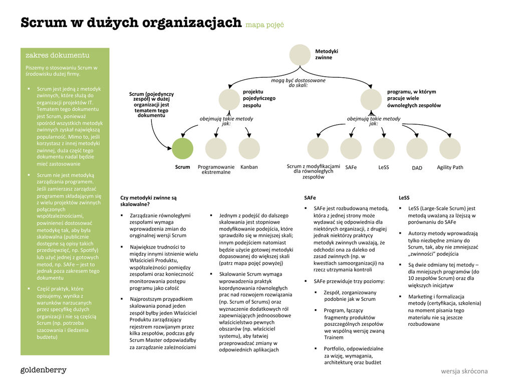 Scrum w dużych organizacjach mapa pojęć Metodyki zwinne zakres dokumentu Piszemy o stosowaniu Scrum w środowisku dużej firmy. § § § mogą być dostosowane do skali: Scrum jest jedną z metodyk zwinnych, które służą do organizacji projektów IT. Tematem tego dokumentu jest Scrum, ponieważ spośród wszystkich metodyk zwinnych zyskał największą popularność. Mimo to, jeśli korzystasz z innej metodyki zwinnej, duża część tego dokumentu nadal będzie mieć zastosowanie Scrum nie jest metodyką zarządzania programem. Jeśli zamierzasz zarządzać programem składającym się z wielu projektów zwinnych połączonych współzależnościami, powinieneś dostosować metodykę tak, aby była skalowalna (publicznie dostępne są opisy takich przedsięwzięć, np. SpoGfy) lub użyć jednej z gotowych metod, np. SAFe – jest to jednak poza zakresem tego dokumentu Część praktyk, które opisujemy, wynika z warunków narzucanych przez specyfikę dużych organizacji i nie są częścią Scrum (np. potrzeba szacowania i śledzenia budżetu) goldenberry projektu pojedyńczego zespołu Scrum (pojedynczy zespół) w dużej organizacji jest tematem tego dokumentu obejmują takie metody jak: Scrum Programowanie Kanban ekstremalne Czy metodyki zwinne są skalowalne? § § § Zarządzanie równoległymi zespołami wymaga wprowadzenia zmian do oryginalnej wersji Scrum Największe trudności to między innymi istnienie wielu Właścicieli Produktu, współzależności pomiędzy zespołami oraz konieczność monitorowania postępu programu jako całość Najprostszym przypadkiem skalowania ponad jeden zespół byłby jeden Właściciel Produktu zarządzający rejestrem rozwijanym przez kilka zespołów, podczas gdy Scrum Master odpowiadałby za zarządzanie zależnościami obejmują takie metody jak: Scrum z modyfikacjami SAFe dla równoległych zespołów § § programu, w którym pracuje wiele ównoległych zespołów LeSS SAFe § Jednym z podejść do dalszego skalowania jest stopniowe modyfikowanie podejścia, które sprawdziło się w mniejszej skali; innym podejściem natomiast będzie użycie gotowej metodyki dopasowanej do większej skali (patrz mapa pojęć powyżej) Skalowanie Scrum wymaga wprowadzenia praktyk koordynowania równoległych prac nad rozwojem rozwiązania (np. Scrum of Scrums) oraz wyznaczenie dodatkowych ról zapewniających jednoosobowe właścicielstwo pewnych obszarów (np. właściciel systemu), aby łatwiej przeprowadzać zmiany w odpowiednich aplikacjach § DAD Agility Path LeSS SAFe jest rozbudowaną metodą, która z jednej strony może wydawać się odpowiednia dla niektórych organizacji, z drugiej jednak niektórzy praktycy metodyk zwinnych uważają, że odchodzi ona za daleko od zasad zwinnych (np. w kwesGach samoorganizacji) na rzecz utrzymania kontroli § LeSS (Large-‐Scale Scrum) jest metodą uważaną za lżejszą w porównaniu do SAFe § Autorzy metody wprowadzają tylko niezbędne zmiany do Scrum, tak, aby nie zmniejszać „zwinności” podejścia § Są dwie odmiany tej metody – dla mniejszych programów (do 10 zespołów Scrum) oraz dla większych inicjatyw § MarkeGng i formalizacja metody (certyfikacja, szkolenia) na moment pisania tego materiału nie są jeszcze rozbudowane SAFe przewiduje trzy poziomy: § Zespół, zorganizowany podobnie jak w Scrum § Program, łączący fragmenty produktów poszczególnych zespołów we wspólną wersję zwaną Trainem § PorUolio, odpowiedzialne za wizję, wymagania, architekturę oraz budżet wersja skrócona Scrum w dużych organizacjach lista kontrolna Na podstawie naszych doświadczeń w pracy z dużymi organizacjami IT przygotowaliśmy listę punktów kontrolnych, które według nas są krytyczne dla udanego wdrożenia Scrum. Poniższa lista nie ma na celu zaadresowania wszystkich aspektów w złożonej strukturze organizacji, ale jest pomocna jako szybki test, jak uniknąć najczęściej popełnianych błędów. dlaczego trudniej jest.. 1. skład zespołu 2. gotowość zespołu ..wdrożyć Scrum w dużej organizacji niż w małej, niezależnej firmie? stwórz właściwy mix członków zespołu –nie tylko programiści. zapoznaj wszystkich członków zespołu z ich rolami w projekcie. w złożonej organizacji niektóre elementy lepiej przygotować z wyprzedzeniem. upewnij się, że zespół przestrzega kluczowych praktyk. a. jest jasno określony Właściciel Produktu a. wszyscy członkowie zespołu, łącznie z Właścicielem Produktu, odbyli podstawowe szkolenie ze Scrum a. wszyscy członkowie zespołu pracują w jednej lokalizacji, a jeśli nie, to zapewnione są rozwiązania do teleobecności a. Właściciel Produktu ma stałą kontrolę nad rejestrem produktu b. Właściciel Produktu jest świadomy, że początkowe dema będą odbiegały od finalnego rozwiązania b. zespół ma swój własny pokój projektowy § § § § menedżerowie przywykli do pracy w strukturze silosowej i obwiniania innych jednostek w przypadku niepowodzeń (IT vs. biznes), zamiast dążyć do wspólnych celów pracownicy niechętnie wychodzą poza swoje role, podczas gdy członkowie zespołów Scrumowych powinni być wielozadaniowi poruszanie się w złożonej strukturze organizacyjnej i równoległych projektach jest częściej bardziej skomplikowane niż sam produkt i wymaga efektywnej komunikacji bardziej niż technicznych umiejętności programiści muszą korzystać z zastanych rozwiązań i pracować zgodnie ze standardami wypracowanymi przez organizację, co spowalnia tempo przyswajania wiedzy i produkcji rozwiązania goldenberry b. Właściciel Produktu jest odpowiednio umocowany i może podejmować wszystkie decyzje dotyczące zakresu i budżetu c. Właściciel Produktu jest w 100% zaangażowany w projekt lub wyznaczył swojego pełnomocnika (np. analityka biznesowego) d. Scrum Master jest w pełni zaangażowany w projekt e. przynajmniej jeden członek zespołu ma duże doświadczenie w projektach zwinn
