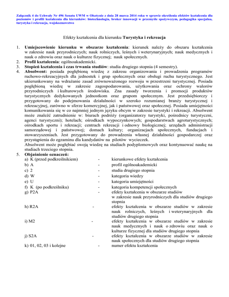 Załącznik 4 do Uchwały Nr 496 Senatu UWM w Olsztynie z dnia 28 marca 2014 roku w sprawie określenia efektów kształcenia dla poziomów i profili kształcenia dla kierunków: biotechnologia, broker innowacji w przemyśle spożywczym, pedagogika specjalna, turystyka i rekreacja, wojskoznawstwo Efekty kształcenia dla kierunku Turystyka i rekreacja 1. 2. 3. 4. 5. Umiejscowienie kierunku w obszarze kształcenia: kierunek należy do obszaru kształcenia w zakresie nauk przyrodniczych; nauk rolniczych, leśnych i weterynaryjnych; nauk medycznych i nauk o zdrowiu oraz nauk o kulturze fizycznej; nauk społecznych. Profil kształcenia: ogólnoakademicki. Stopień kształcenia i czas trwania studiów: studia drugiego stopnia (4 semestry). Absolwent: posiada pogłębioną wiedzę z zakresu organizowania i prowadzenia programów ruchowo-rekreacyjnych dla jednostek i grup społecznych oraz obsługi ruchu turystycznego. Jest ukierunkowany na wdrażanie zasad zrównoważonego rozwoju w przestrzeni turystycznej. Posiada pogłębioną wiedzę w zakresie zagospodarowania, użytkowania oraz ochrony walorów przyrodniczych i kulturowych środowiska. Zna zasady tworzenia i promocji produktów turystycznych dedykowanych jednostkom oraz grupom społecznym. Jest przedsiębiorczy i przygotowany do podejmowania działalności w szeroko rozumianej branży turystycznej i rekreacyjnej, zarówno w sferze komercyjnej, jak i państwowej oraz społecznej. Posiada umiejętności komunikowania się w co najmniej jednym języku obcym w zakresie turystyki i rekreacji. Absolwent może znaleźć zatrudnienie w: biurach podróży (organizatorzy turystyki, pośrednicy turystyczni, agenci turystyczni); hotelach; ośrodkach wypoczynkowych; gospodarstwach agroturystycznych; ośrodkach sportu i rekreacji; centrach rekreacji i odnowy biologicznej; urzędach administracji samorządowej i państwowej; domach kultury; organizacjach społecznych, fundacjach i stowarzyszeniach. Jest przygotowany do prowadzenia własnej działalności gospodarczej oraz przystąpienia do egzaminu dla kandydatów na pilotów wycieczek. Absolwent może pogłębiać swoją wiedzę na studiach podyplomowych oraz kontynuować naukę na studiach trzeciego stopnia. Objaśnienie oznaczeń: a) K (przed podkreślnikiem) kierunkowe efekty kształcenia b) A profil ogólnoakademicki c) 2 studia drugiego stopnia d) W kategoria wiedzy e) U kategoria umiejętności f) K (po podkreślniku) kategoria kompetencji społecznych g) P2A efekty kształcenia w obszarze studiów w zakresie nauk przyrodniczych dla studiów drugiego stopnia h) R2A efekty kształcenia w obszarze studiów w zakresie nauk rolniczych, leśnych i weterynaryjnych dla studiów drugiego stopnia i) M2 efekty kształcenia w obszarze studiów w zakresie nauk medycznych i nauk o zdrowiu oraz nauk o kulturze fizycznej dla studiów drugiego stopnia j) S2A efekty kształcenia w obszarze studiów w zakresie nauk społecznych dla studiów drugiego stopnia k) 01, 02, 03 i kolejne numer efektu kształcenia Symbol efektu kierunkowego K2_W01 K2_W02 K2_W03 K2_W04 K2_W05 K2_W06 K2_W07 K2_W08 K2_W09 K2_W10 K2_W11 Kierunkowe efekty kształcenia dla kierunku turystyka i rekreacja - po ukończeniu studiów drugiego stopnia absolwent: WIEDZA Posiada poszerzoną wiedzę w zakresie biologicznych podstaw aktywności ruchowej oraz zna fachową terminologię i metodologię badania zjawisk w obszarze rekreacji. Rozumie oraz analizuje psychologiczne i społeczne uwarunkowania aktywności ruchowej, zachowań prozdrowotnych i rekreacyjnych jednostek i grup społecznych. Zna zasady funkcjonowania i obsługi sprzętu i urządzeń wykorzystywanych w zakresie zaspokojenia potrzeb aktywności ruchowo-rekreacyjnej jednostki i grup społecznych. Posiada i wykorzystuje wiedzę z zakresu ochrony praw autorskich oraz zarządzania zasobami własności intelektualnej w obszarach związanych bezpośrednio z turystyką i rekreacją. Zna zasady kreowania i rozwoju indywidualnej przedsiębiorczości w turystyce na bazie wiedzy z obszarów właściwych dla studiowanego kierunku turystyka i rekreacja. Ma poszerzoną wiedzę na temat prawnych, moralnych i etycznych zasad funkcjonowania branży usług turystycznych. Zna kulturowe, religijne i społeczne uwarunkowania podejmowania aktywności turystycznej człowieka oraz ma pogłębioną wiedzę na temat wpływu turystyki na zjawiska społeczno-kulturowe. Zna geograficzno-ekonomiczne i geopolityczne uwarunkowania i bariery rozwoju współczesnej turystyki. Ma pogłębioną wiedzę w zakresie metod, narzędzi oraz systemów organizacji i obsługi sektora usług turystycznych, a także technik badania zjawisk w obszarze turystyki. Ma pogłębioną wiedzę na temat zasobów i walorów turystycznych środowiska przyrodniczego, dostrzega powiązania i zależności pomiędzy środowiskiem przyrodniczym a turystyką i rekreacją. Zna aktualne problemy wynikające z wzajemnych zależności między turystyką i rekreacją a środowiskiem naturalnym, rozumie potrzebę rozwoju turystyki i rekreacji zgodnie z koncepcją rozwoju zrównoważonego. Symbol efektu kształcenia dla obszarów kształcenia w zakresie: nauk przyrodniczych; nauk rolniczych, leśnych i weterynaryjnych; nauk medycznych i nauk o zdrowiu oraz nauk o kulturze fizycznej; nauk społecznych M2_W01 M2_W10 M2_W04 M2_W06 M2_W07 M2_W11 S2A_W10 P2A_W10 R2A_W08 M2_W12 S2A_W11 P2A_W11 R2A_W09 S2A_W07 S2A_W05 S2A_W08 S2A_W03 S2A_W06 P2A_W04 P2A_W05 K2_W12 K2_W13 K2_W14 K2_W15 K2_W16 K2_W17 K2_W18 K2_U01 K2_U02 K2_U03 K2_U04 K2_U05 K2_U06 K2_U07 K2_U08 Zna zasady planowania badań dotyczących użytkowania środowiska naturalnego dla turystyki i rekreacji, z wykorzystaniem odpowiednich technik i narzędzi badawczych. Rozumie potrzebę opierania prac badawczych oraz działań gospodarczych i organizacyjnych w zakresie turystyki i rekreacji na danych empirycznych. Ma aktualną i pogłębioną wiedzę na temat regionów turystycznych Polski i świata, charakte